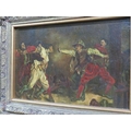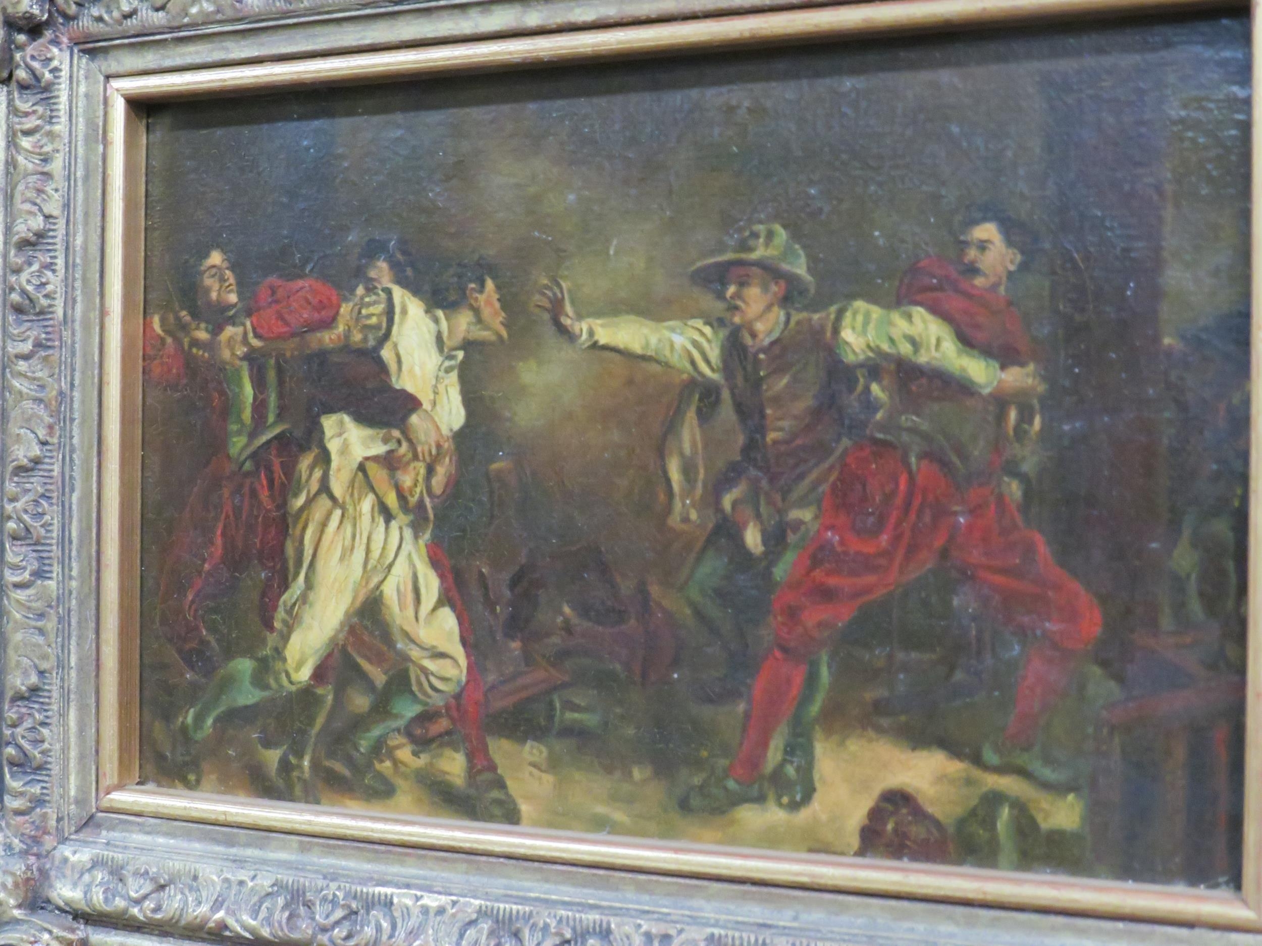 Oil on canvas fighting men 4.5" x 8" in good ornate frame