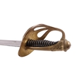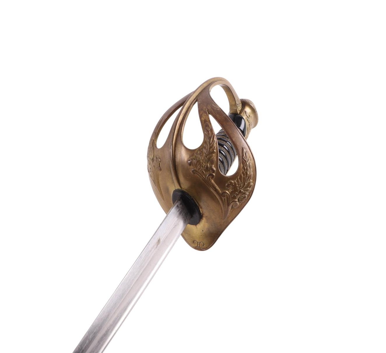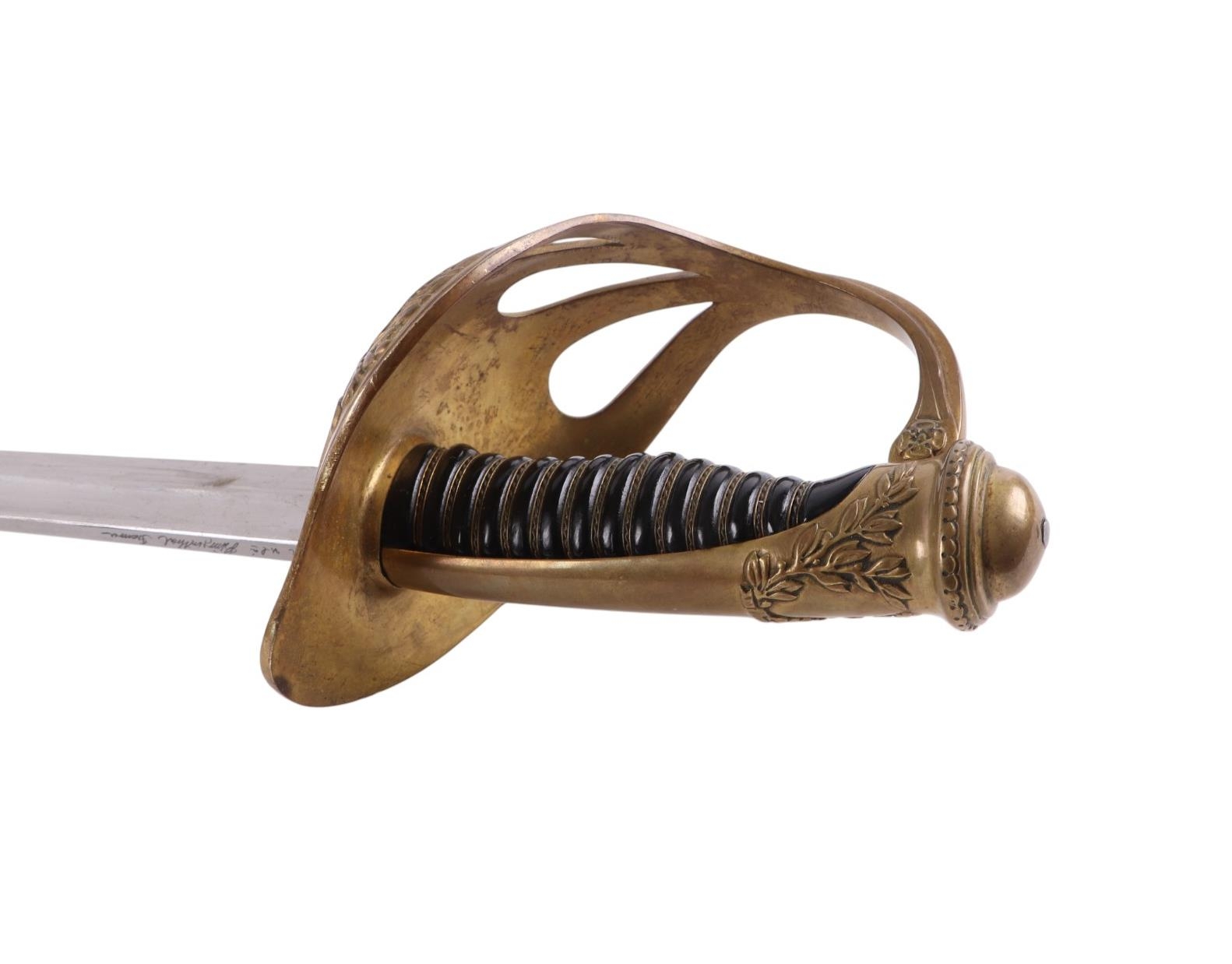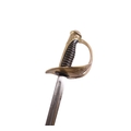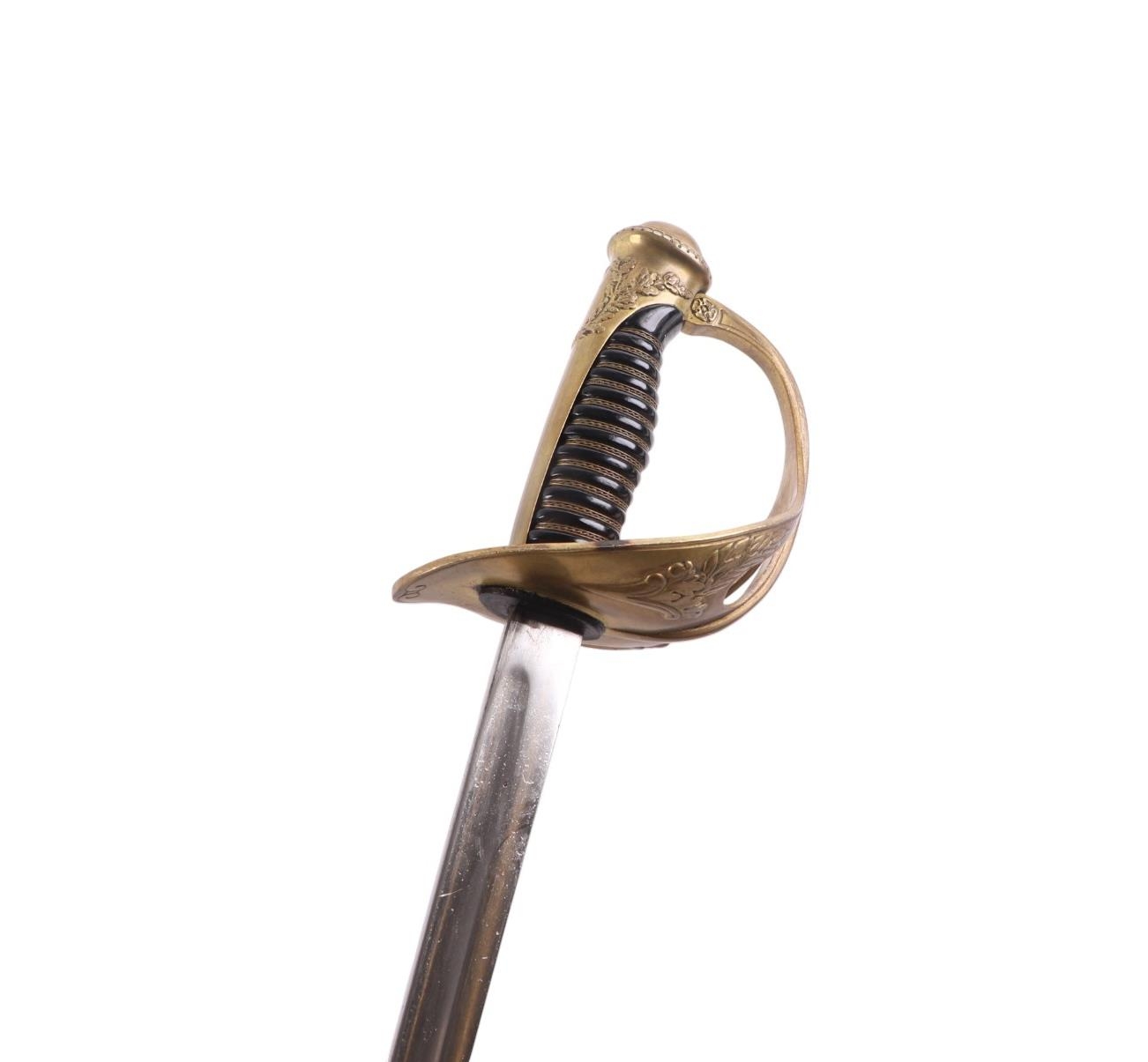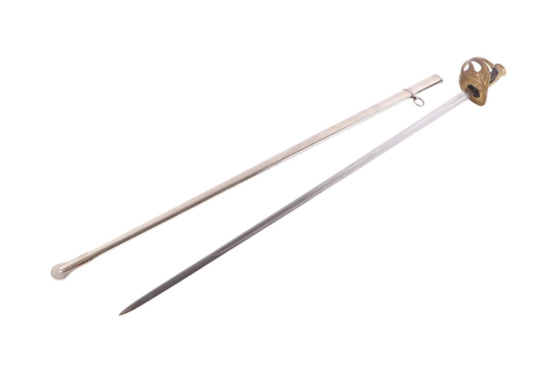 A 19th century French Officers sword with brass knuckle guard in its plated steel scabbard. Makers inscription to back edge of blade: Coulaux la Klingenthal France. Straight single edged blade 91.5cms long.