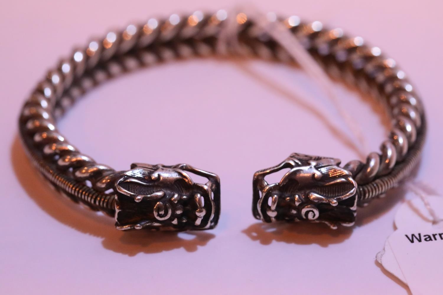 White metal Tibetan silver twisted bangle with dragon head terminals. P&P Group 1 (£14+VAT for the first lot and £1+VAT for subsequent lots)