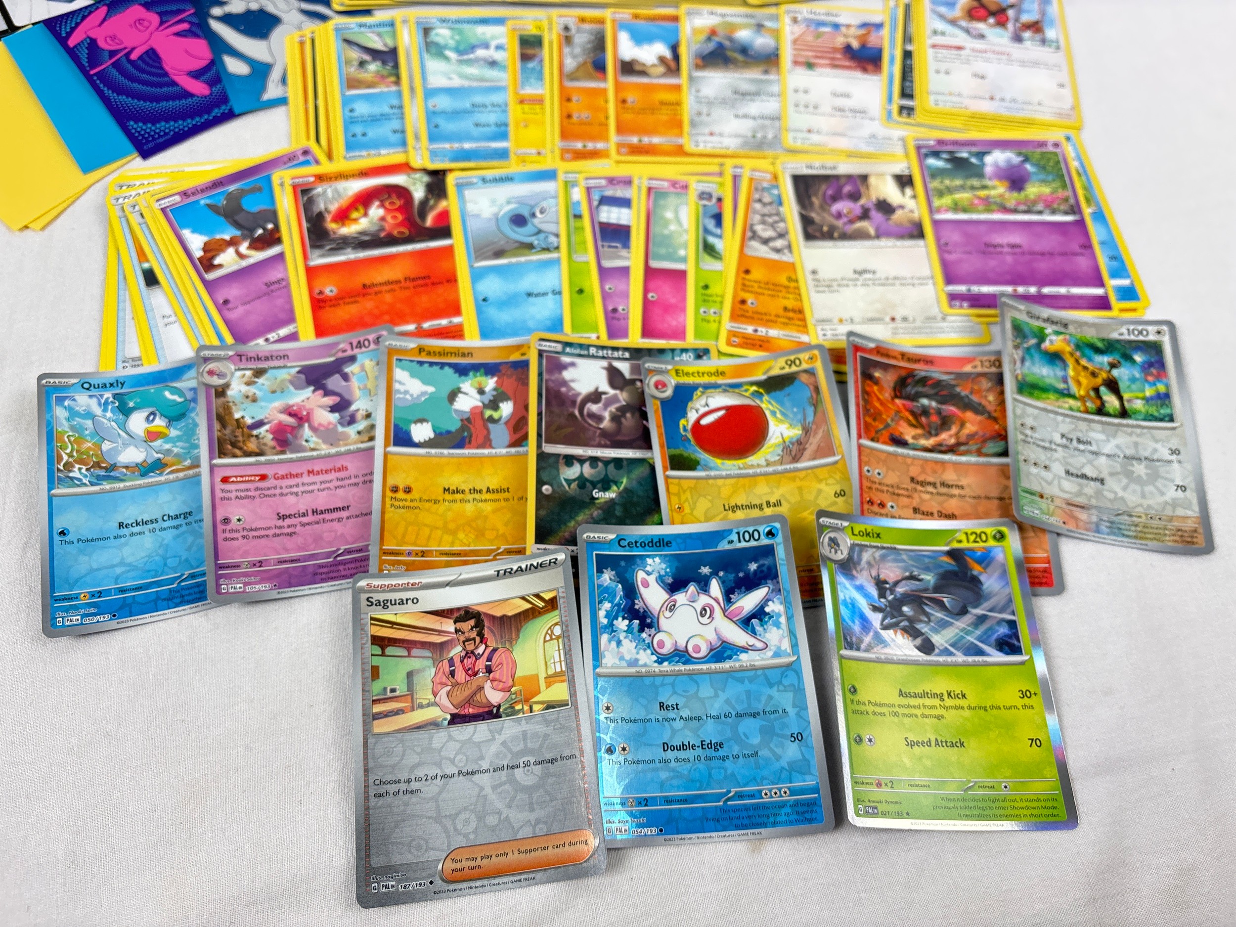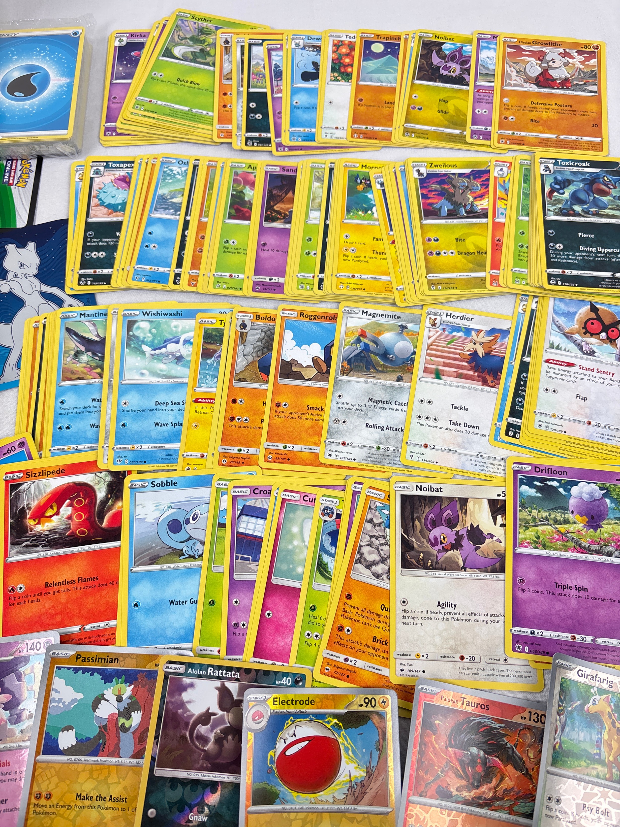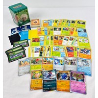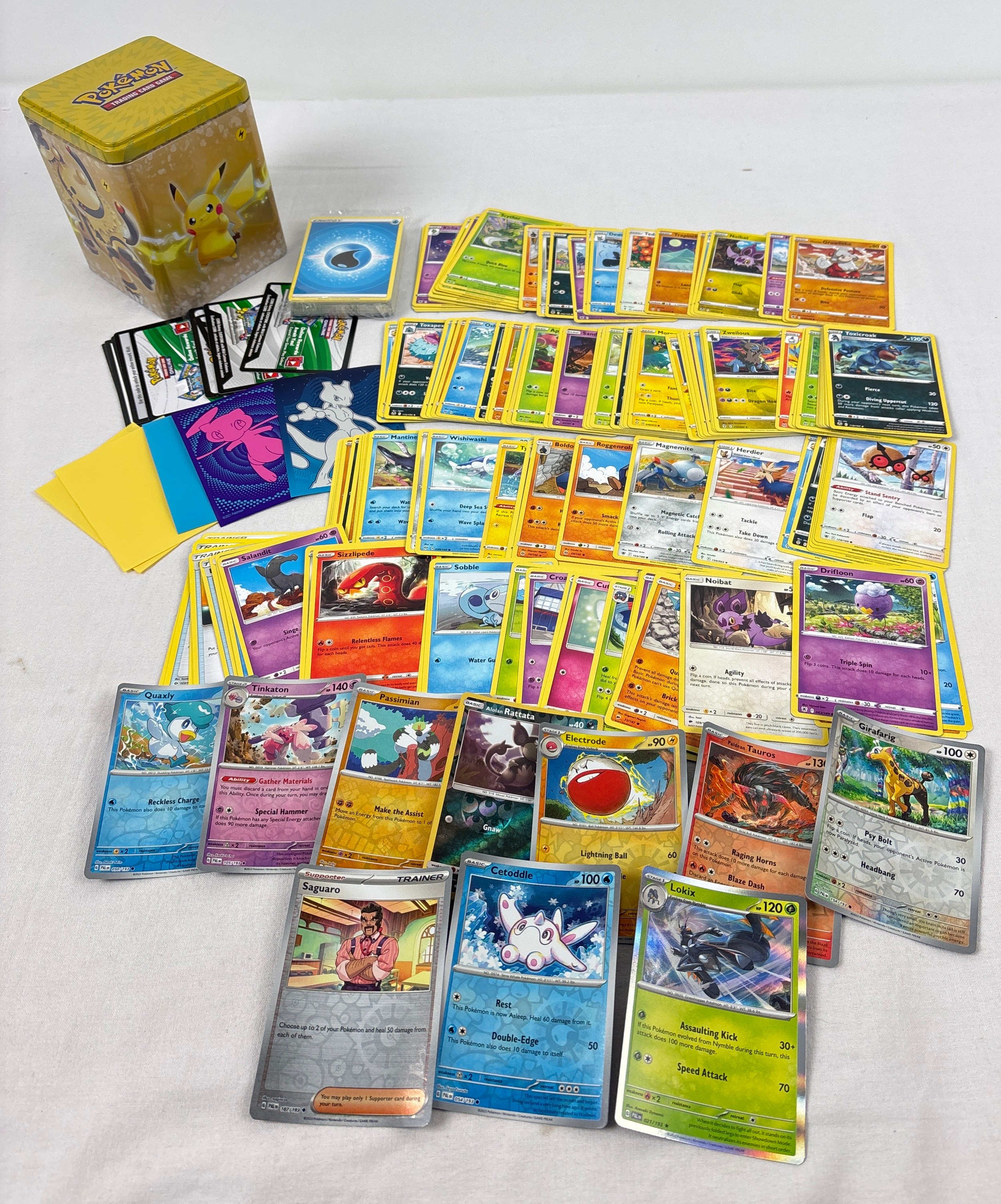 An electric (yellow) Pokémon stacking tin containing 200 assorted Pokémon cards & 5 card sleeves. Cards include 120 character cards, 10 Trainer cards, 10 holo's & reverse holo's, a sealed pack of energy cards and TCG online code cards.