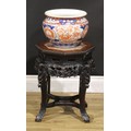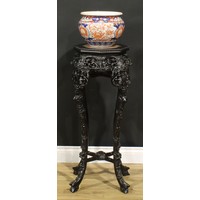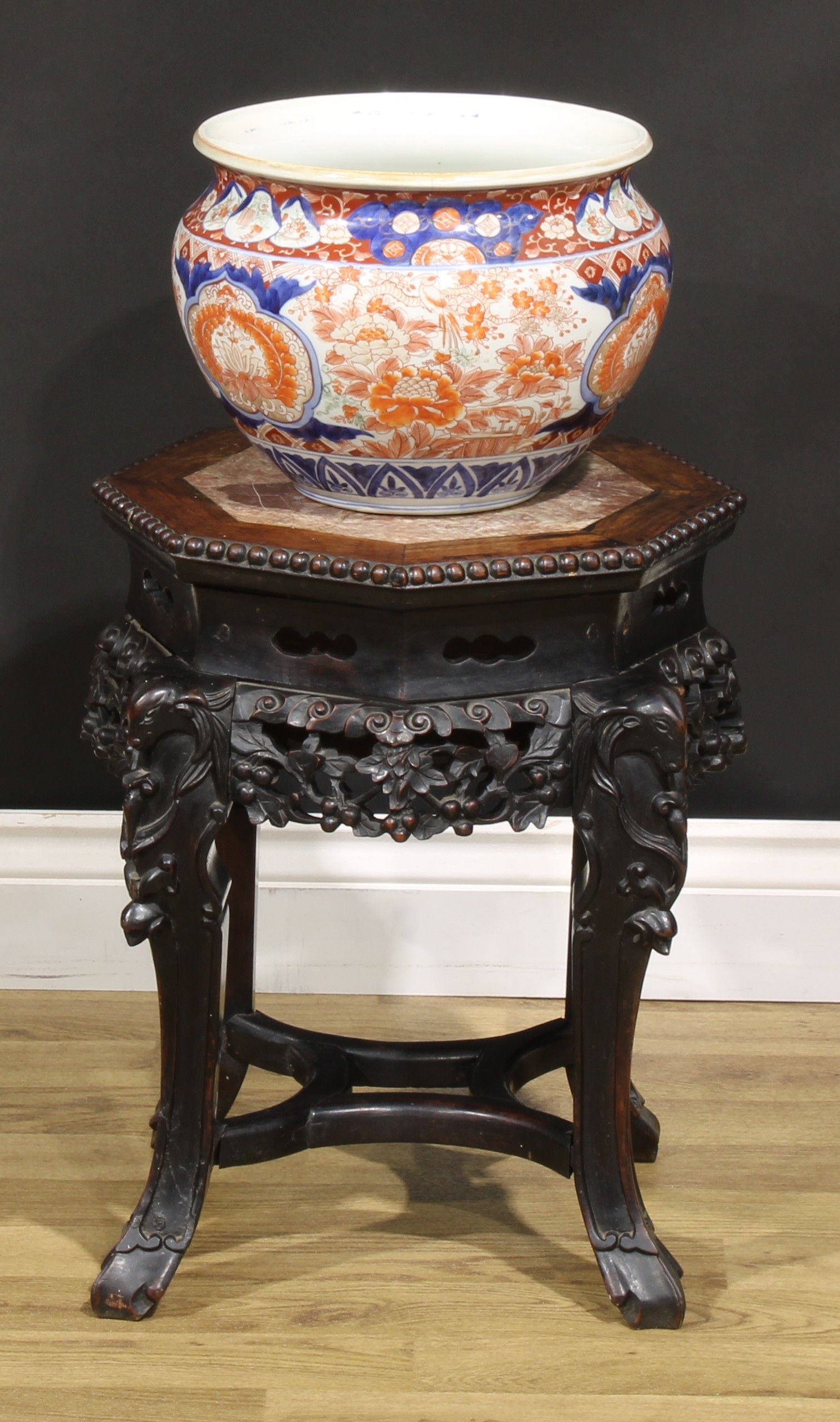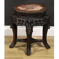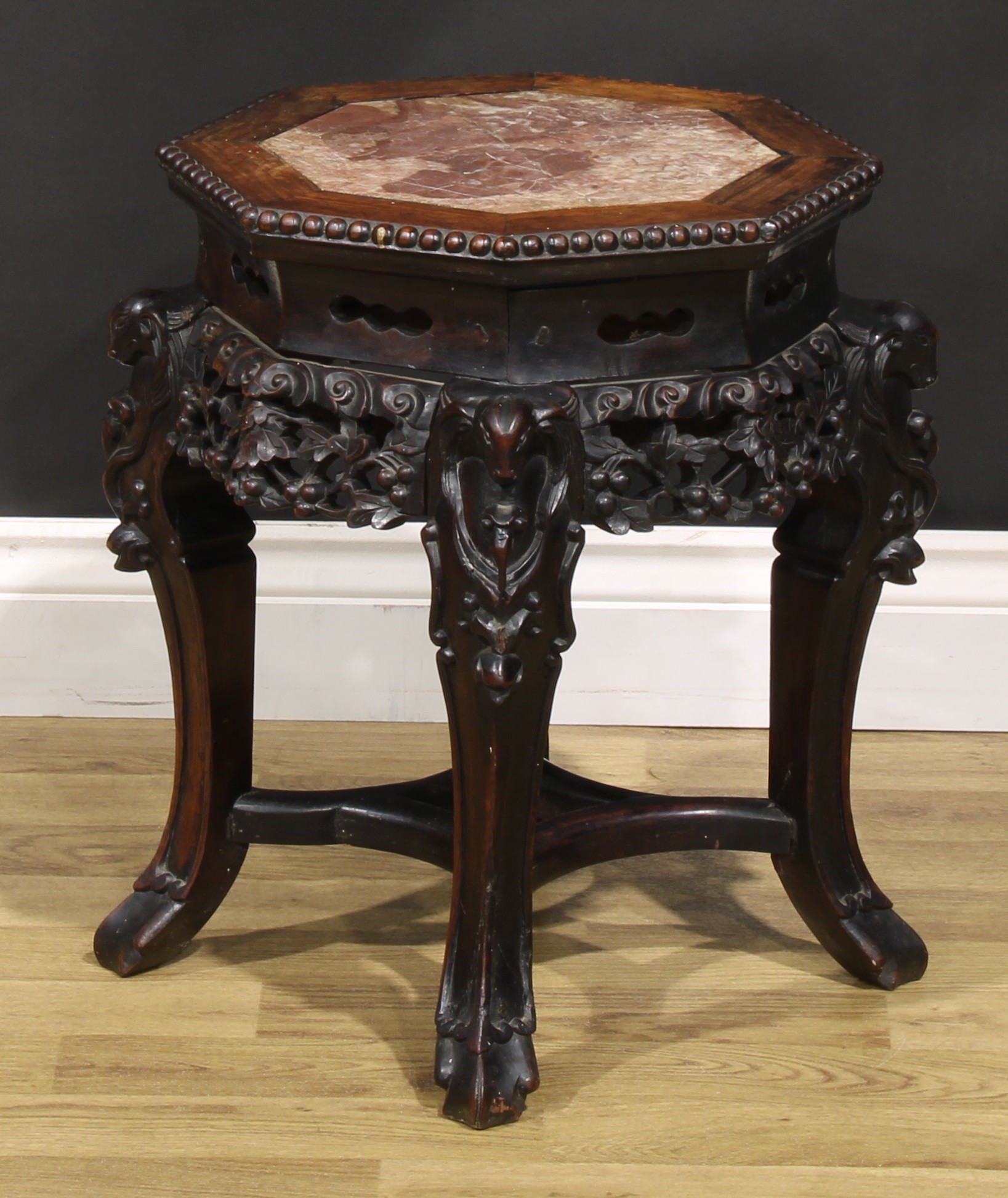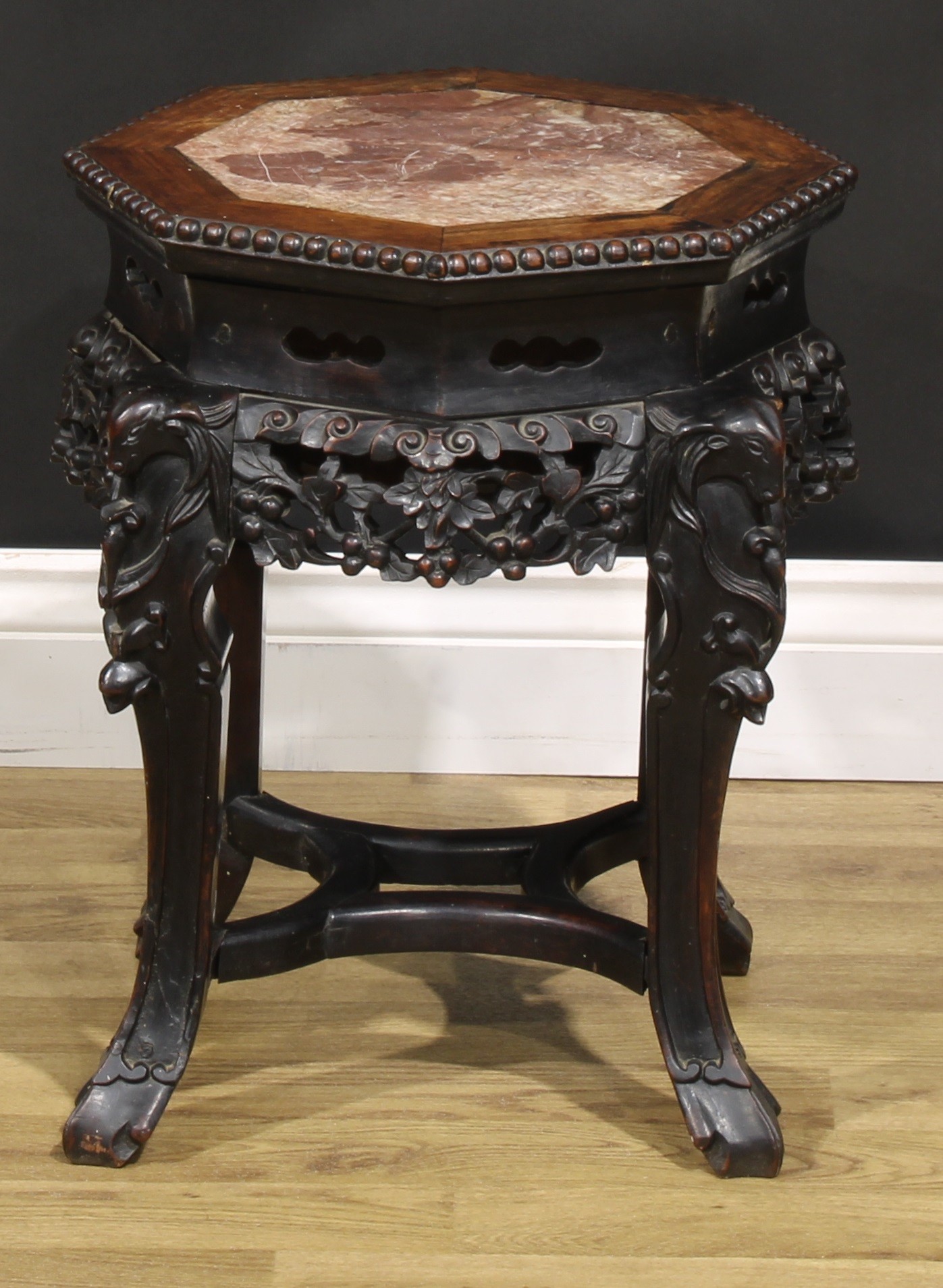 A Chinese hardwood jardiniere stand, octagonal top with beaded edge and inset marble panel, shaped apron pierced and carved with fruiting branches, cabriole legs, hoof feet, 45.5cm high, 35.5cm wide, c.1900