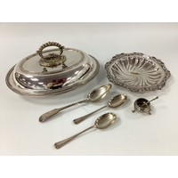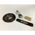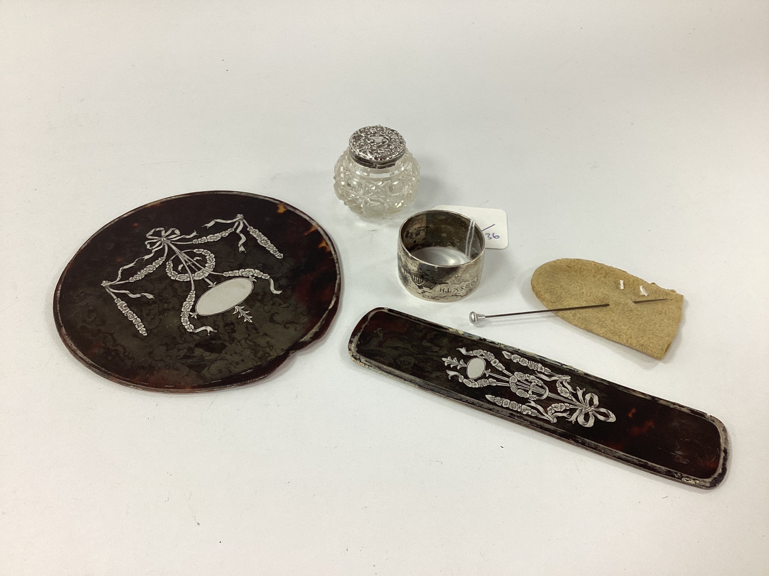 A Small Hallmarked Silver Cut Glass Dressing Table Jar, (damage); two decorative Edwardian Tortoisehell piqué work panels; a Middle Eastern niello napkin ring, detailed with camels, personalised 'J.S. Forsyth', etc.