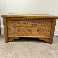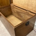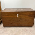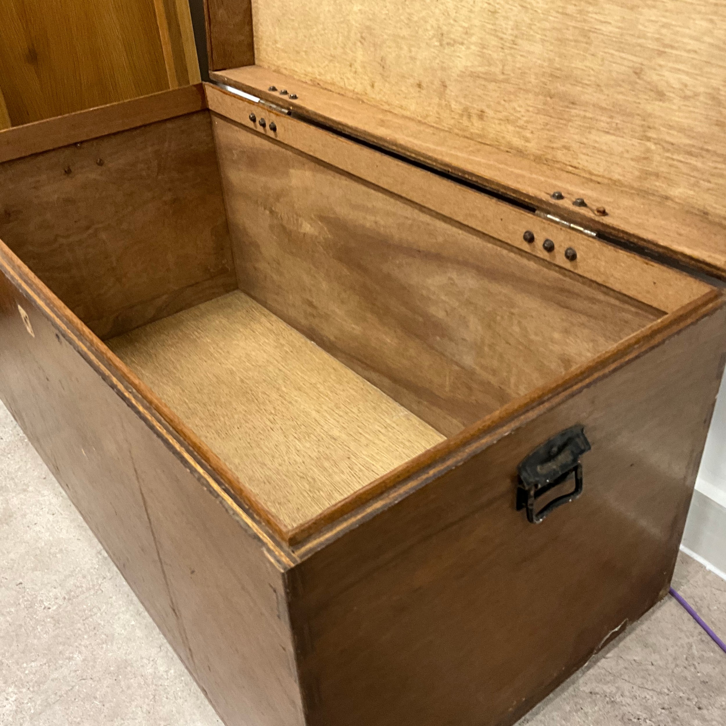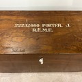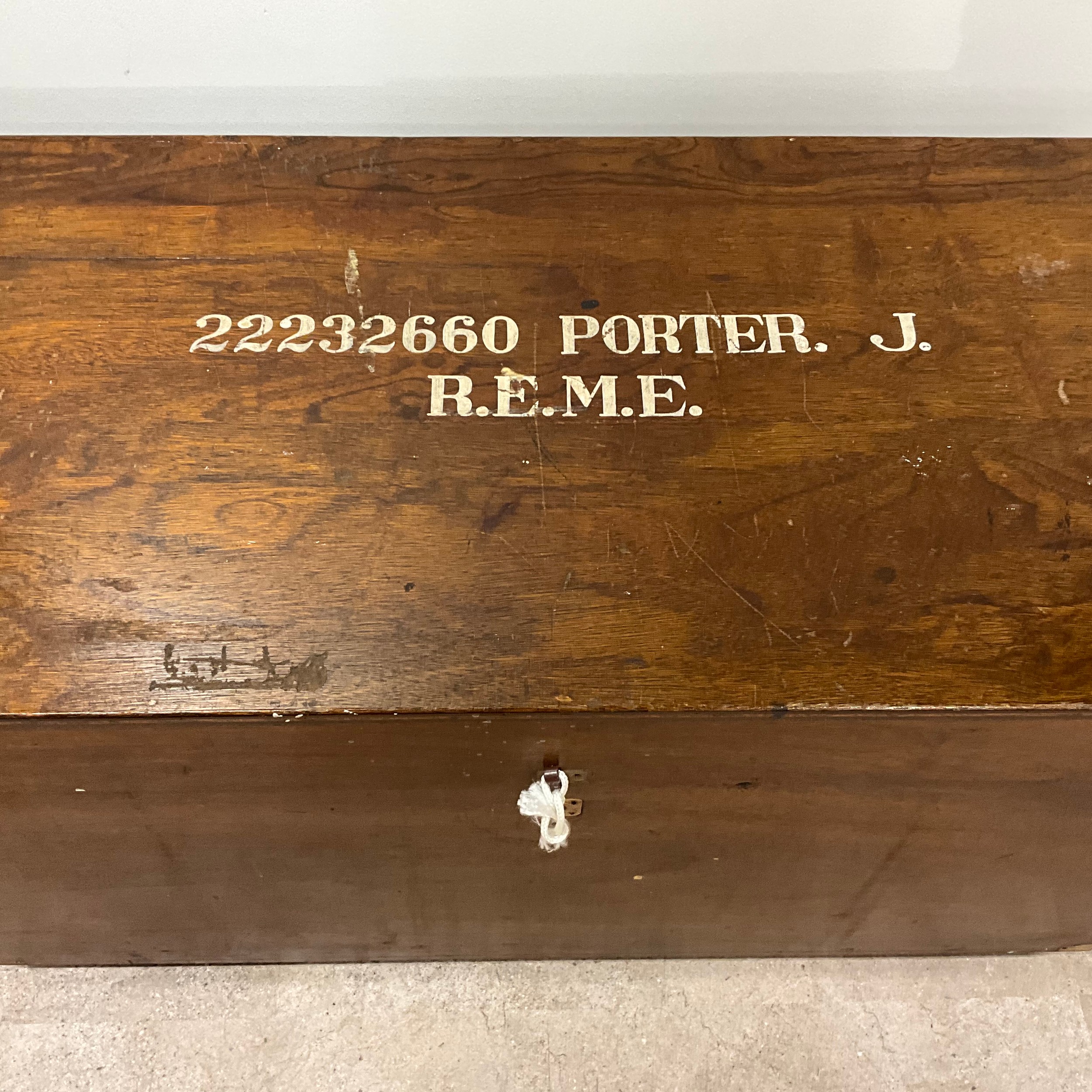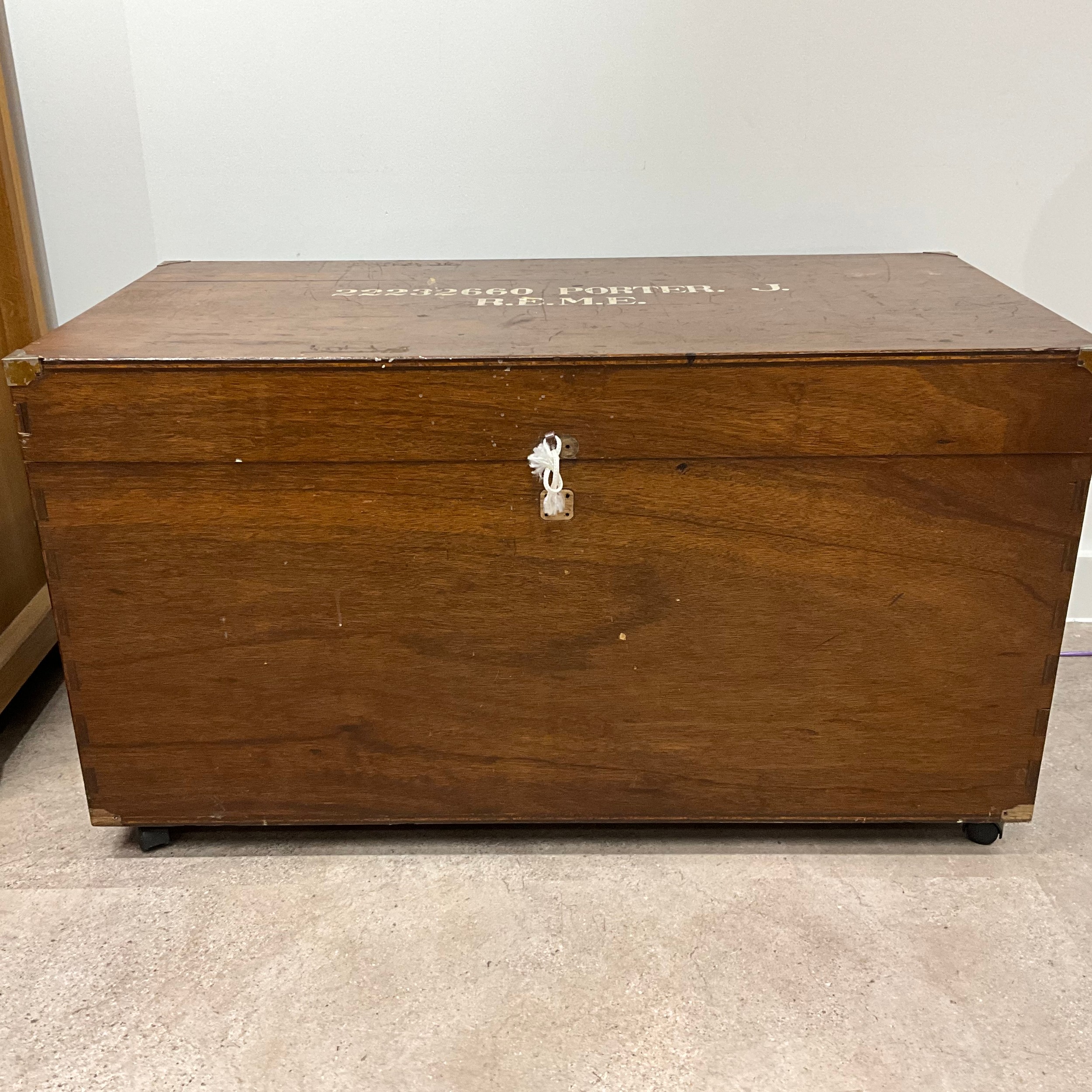 Plywood lidded trunk with metal corner brackets and two metal carrying handles on wheels, inscribed to the lid: 22232660 Porter J R.E.M.E, W 91cm x D 45.5cm x H 51cm.