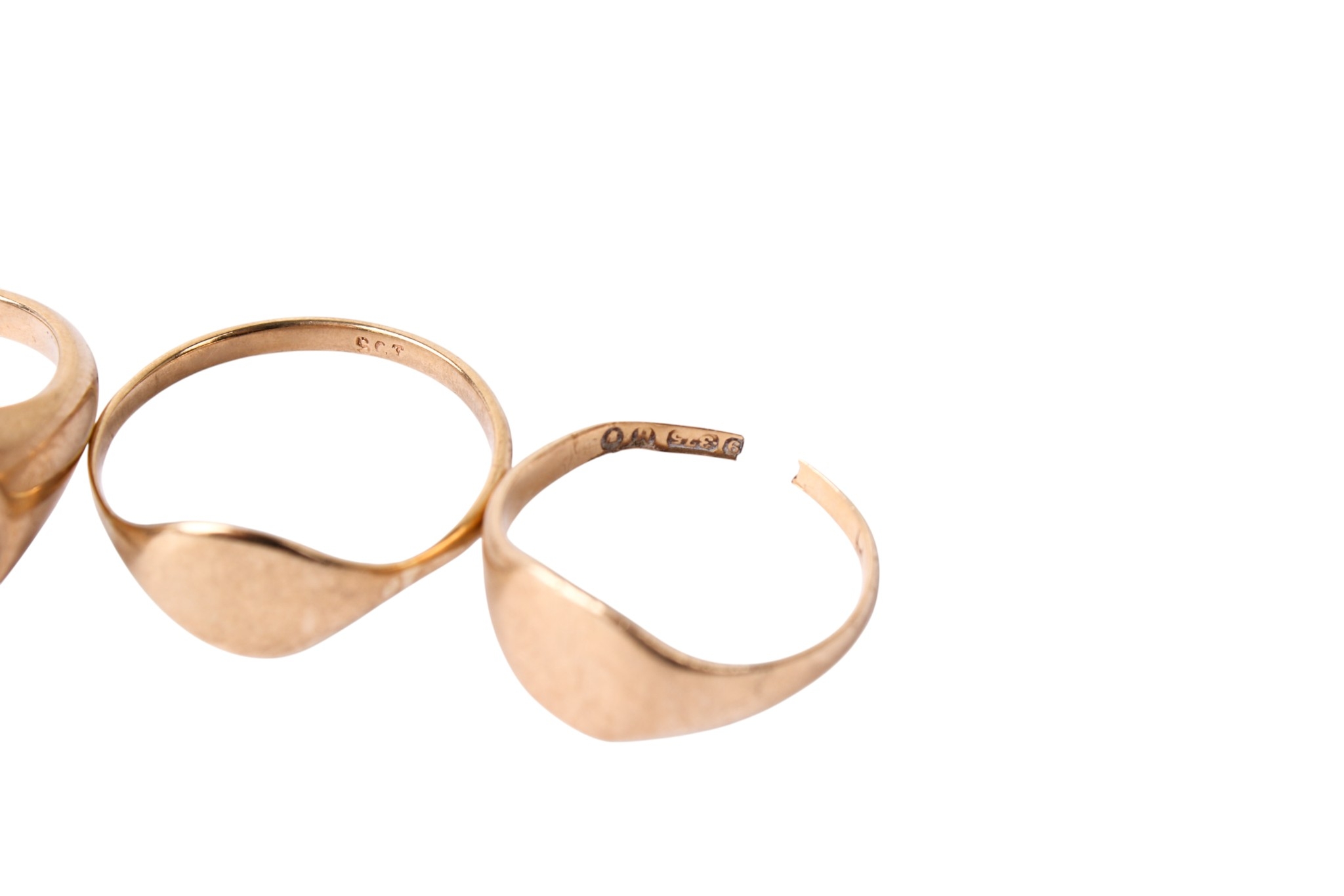 Three 9ct gold signet rings. Two hallmarked, one marked 9ct, one broken, gross weight 8.5g.