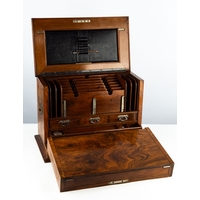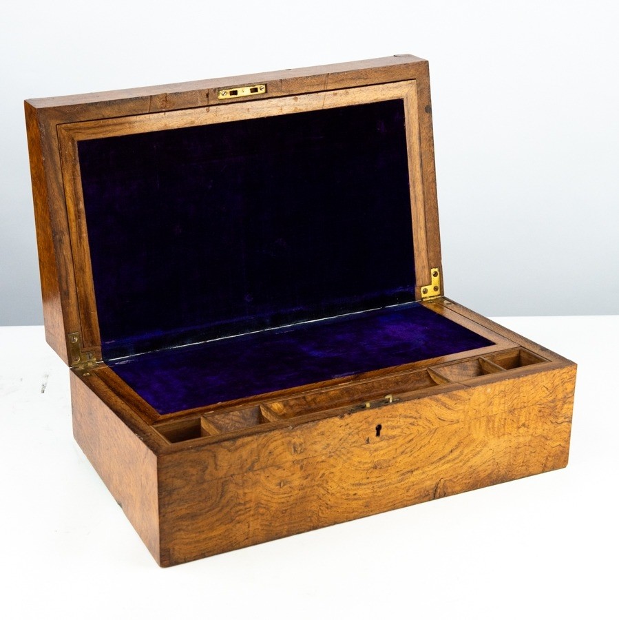 VICTORIAN POLLARD OAK VENEERED ON MAHOGANY PORTABLE WRITING SLOPE, of typical form, the interior with purple plush lined writing surface, pen tray and pair of secret drawers, 6” (15.2cm) high, 16” x 9 ½” (40.6cm x 24.1cm)