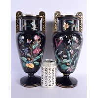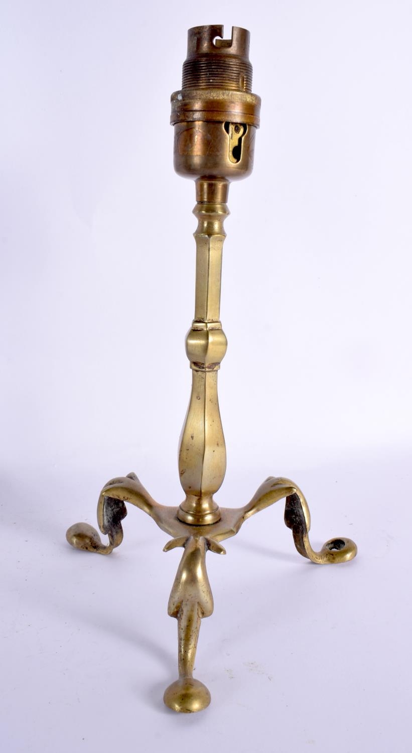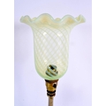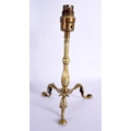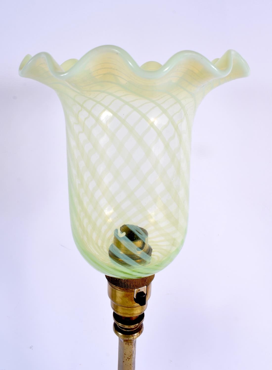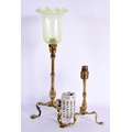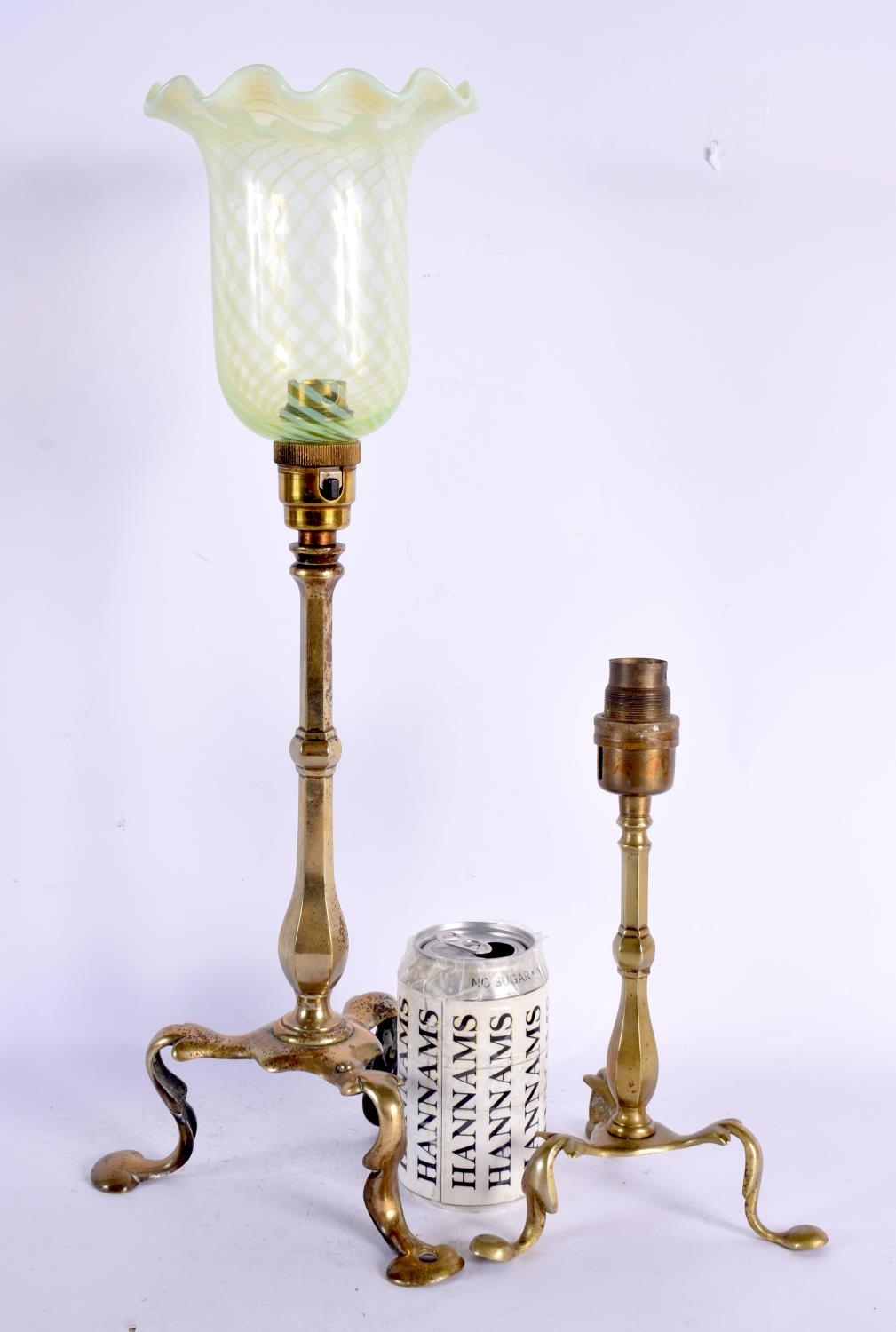 TWO ART NOUVEAU BRASS CANDLESTICKS one with vaseline glass lamp fittings. Largest 47 cm high. (2)