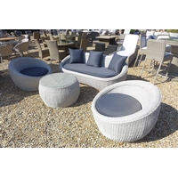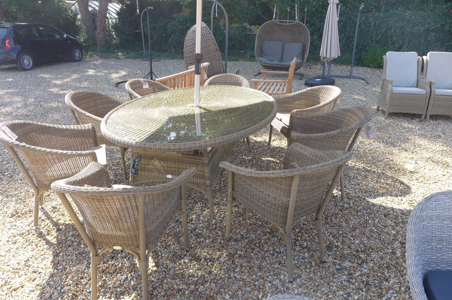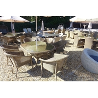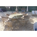 A Bramblecrest Sahara 212 x 150cm elliptical table with Sahara stacking bistro chairs including taupe cushions