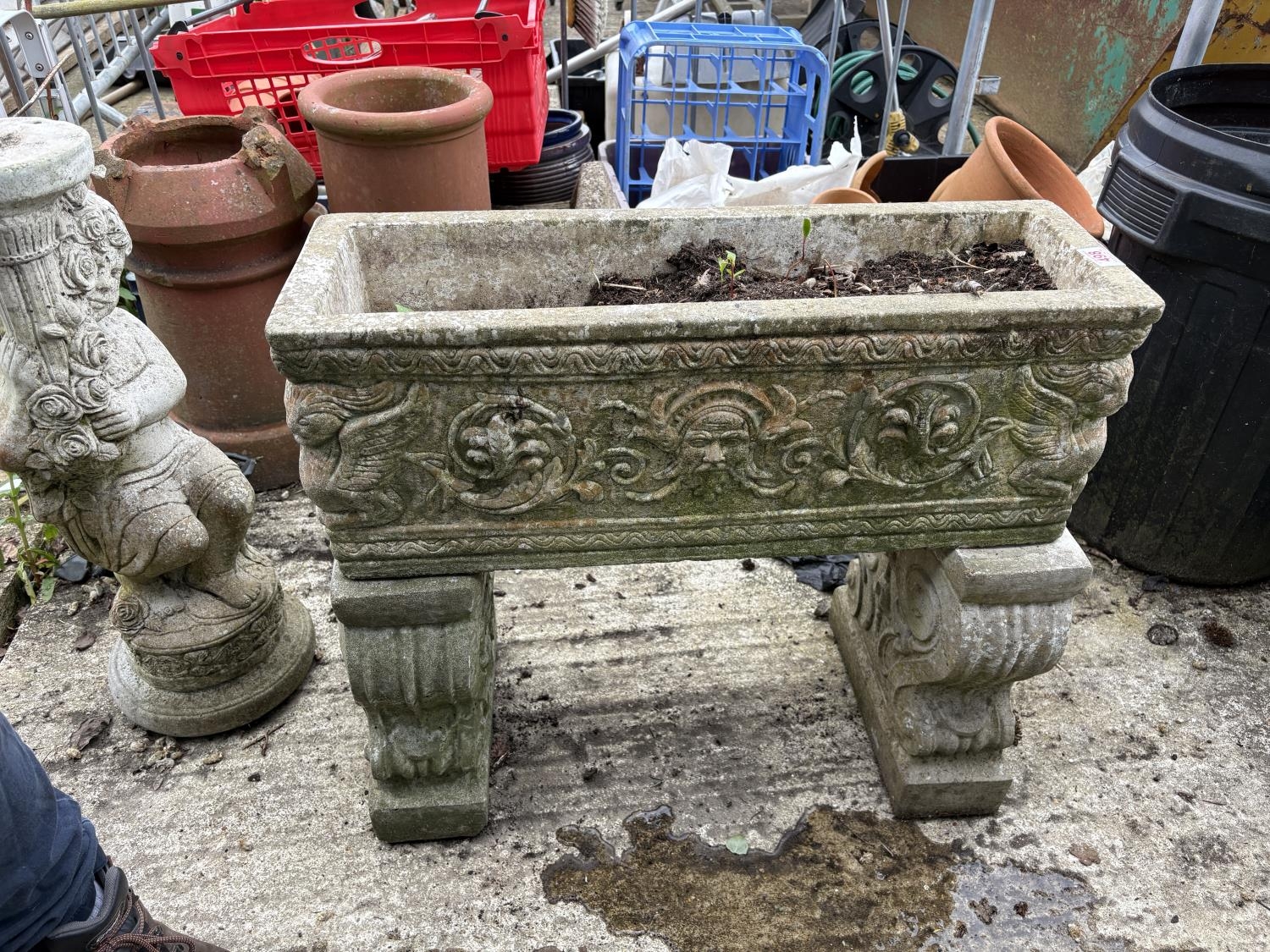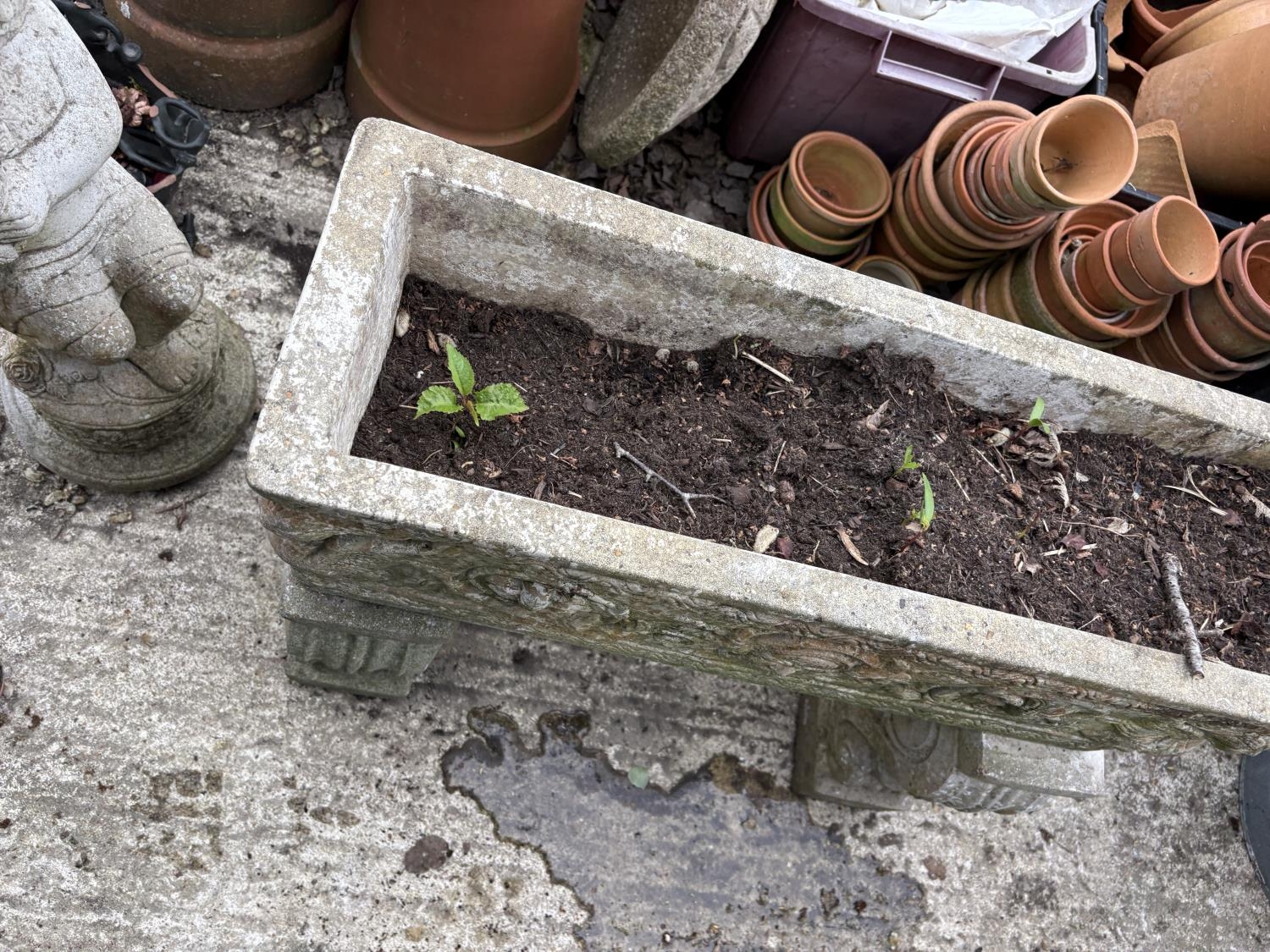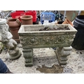 A large ornate concrete trough raised on supports, length 72 cms, width 24 cms, height 64 cms