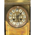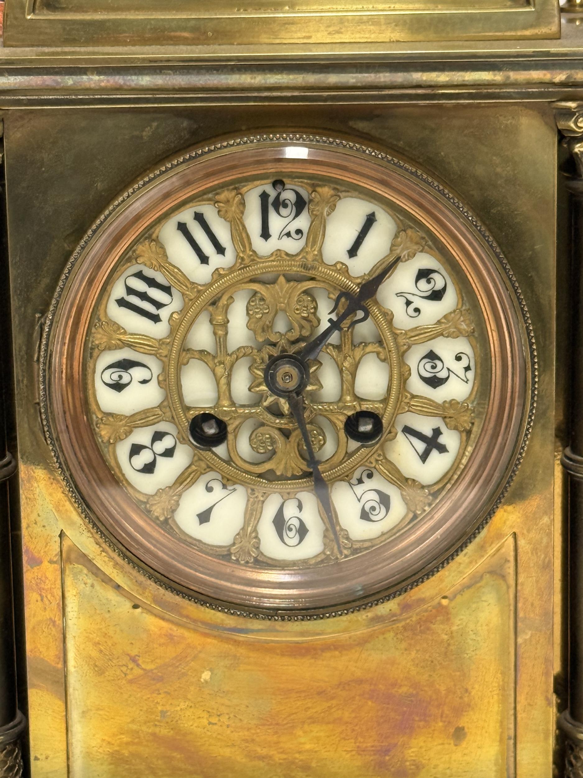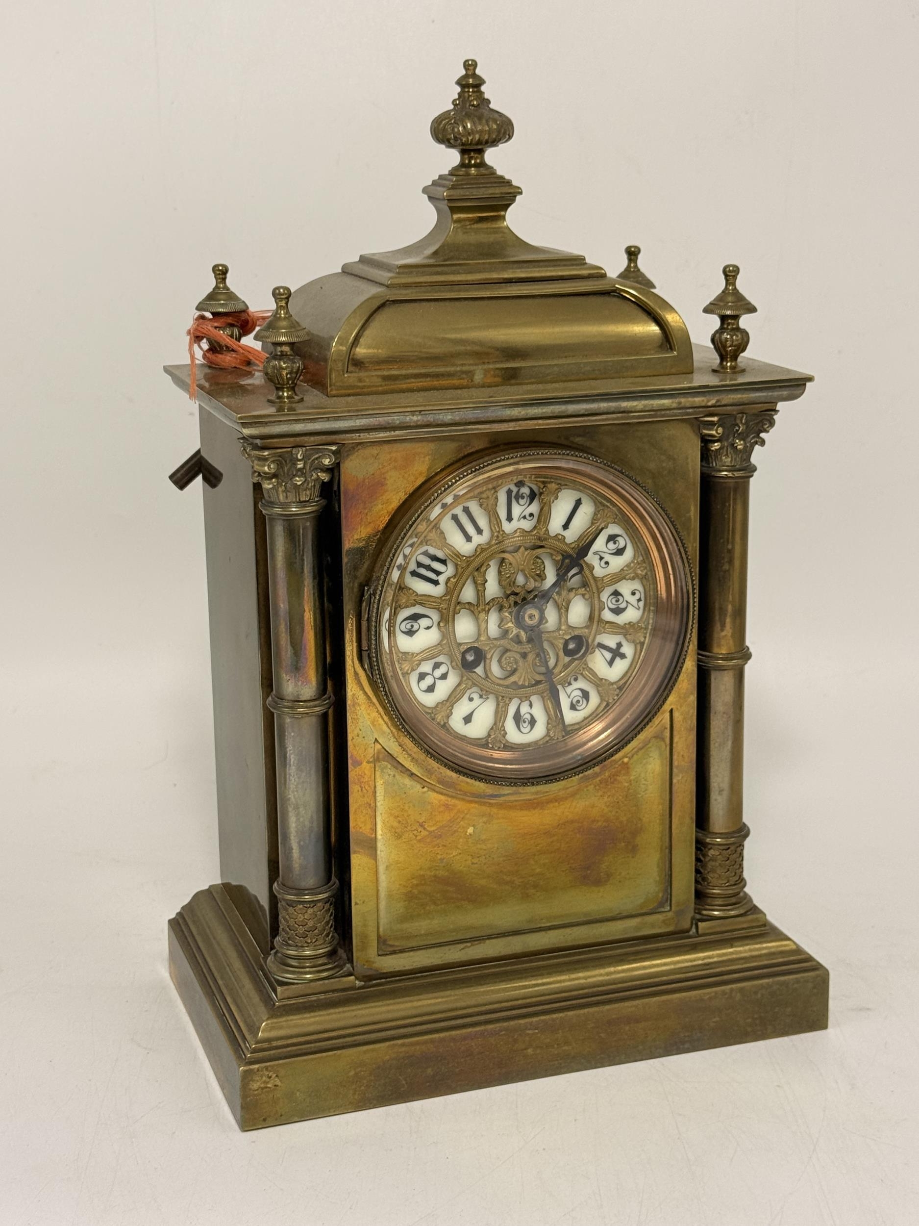 A French brass cased mantel clock, 19th Century, the white enamel dial with black Arabic numerals beneath a decorative gilt-metal grille, the architectural case with Corinthian columns flanking the dial, finials to each corner, the domed top surmounted by a foliate finial, to a stepped rectangular base, the two-train movement stamped A.D. Mougin, striking on a gong, with pendulum and key. 34cm high overall, 22cm wide, 13cm deep