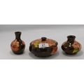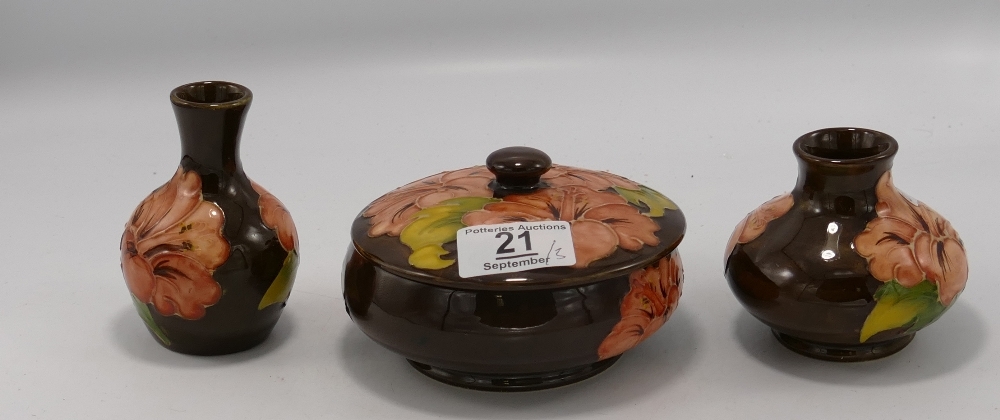 Moorcroft Hibiscus on Brown Ground items to include: Powder Dish & 2 small vases, height of largest 9cm(3)
