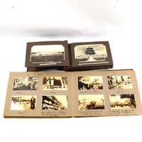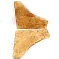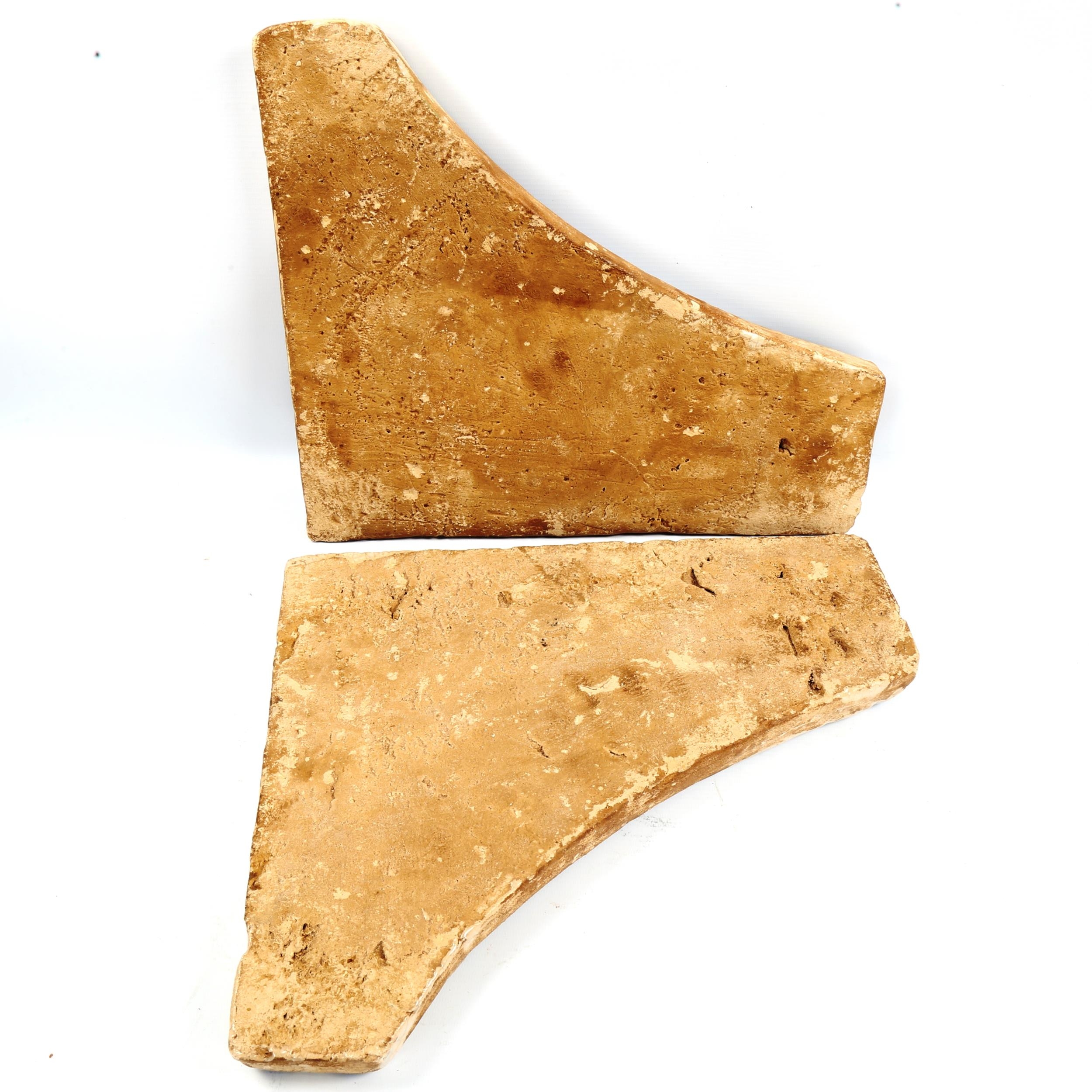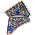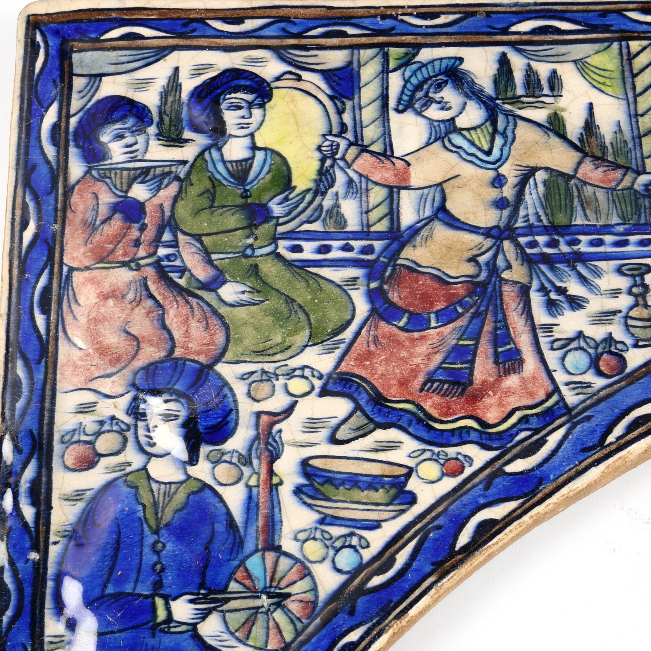 A pair of Islamic pottery over-door tiles, with hand painted musical scenes, each tile width 38cm, height 33cm