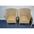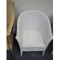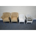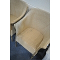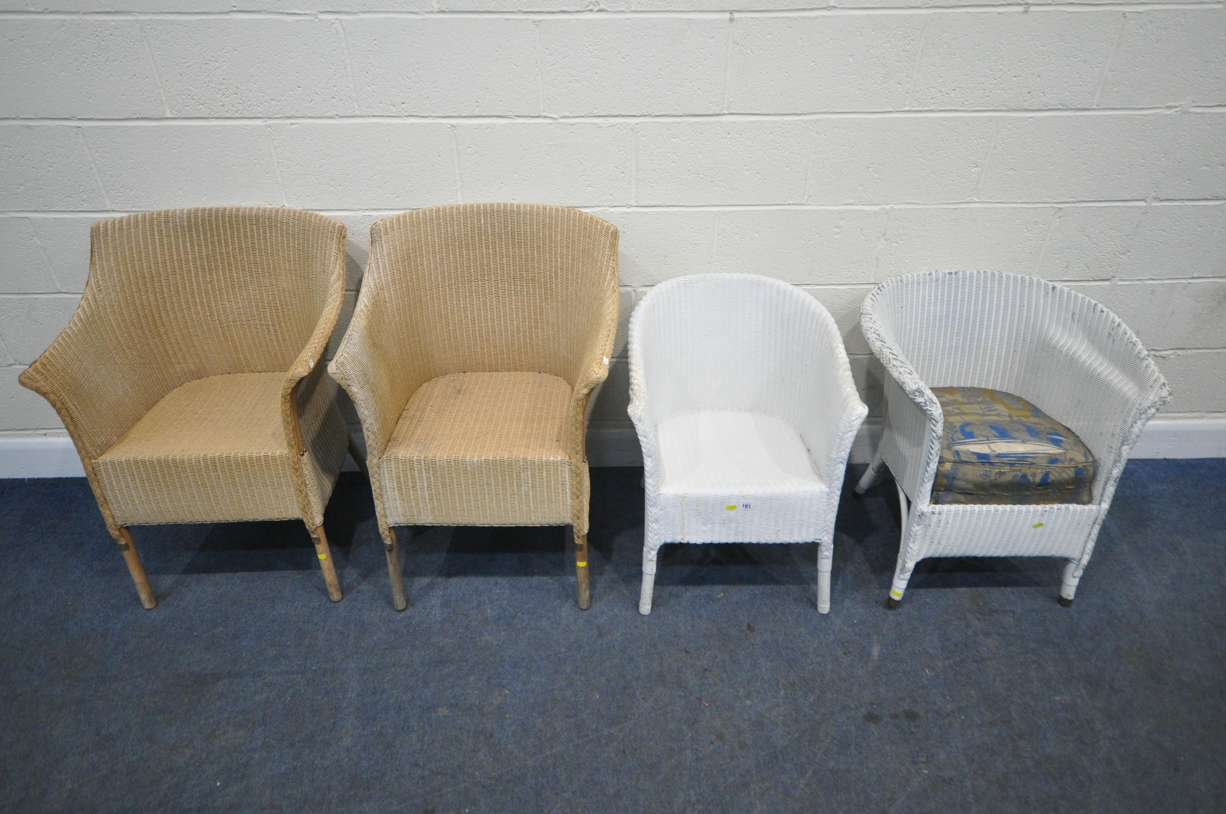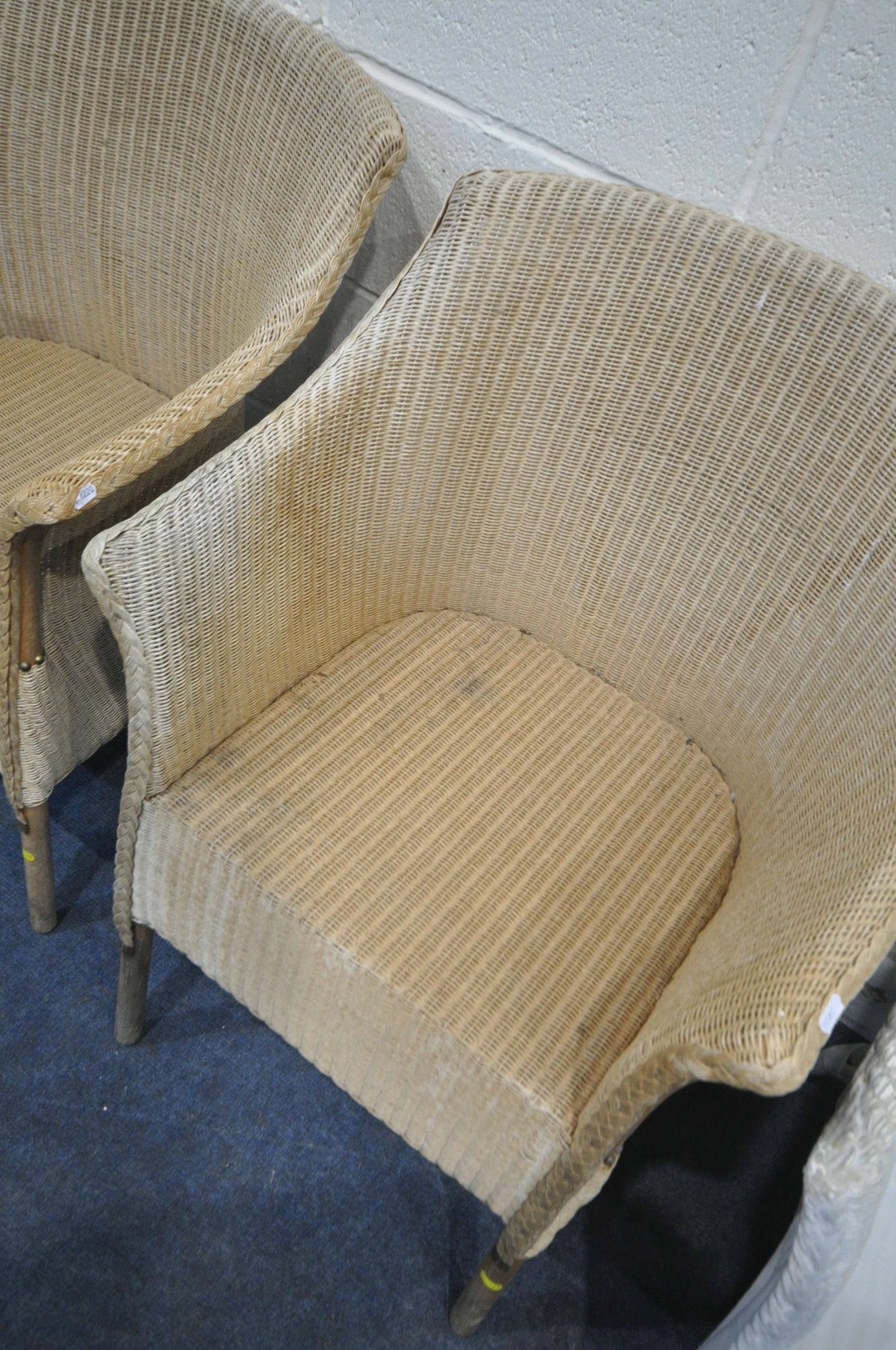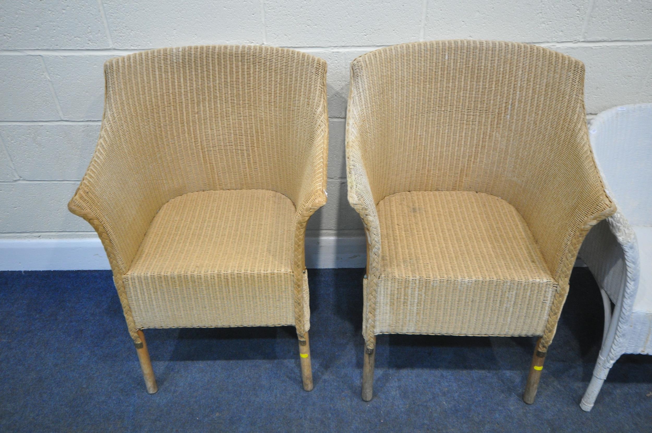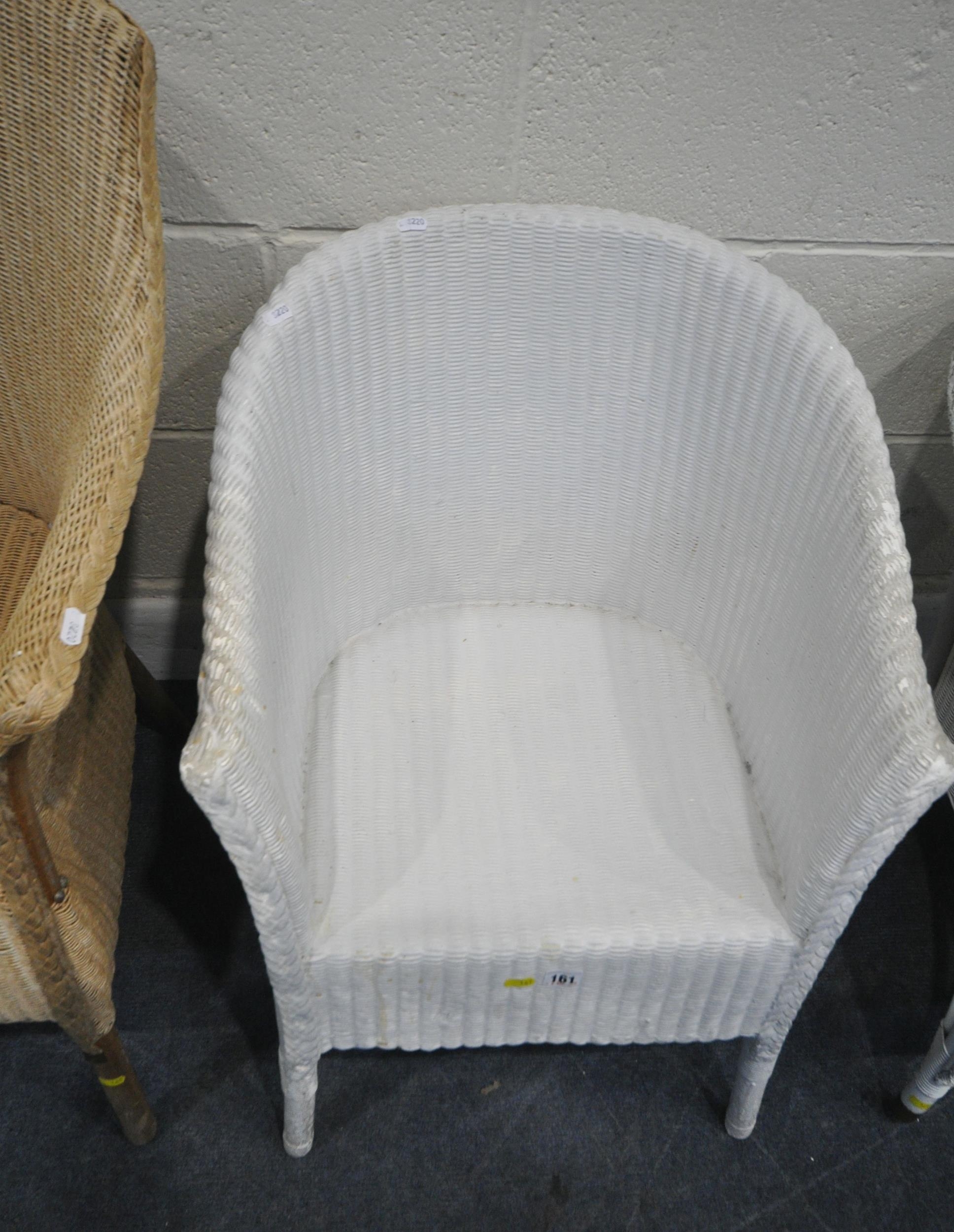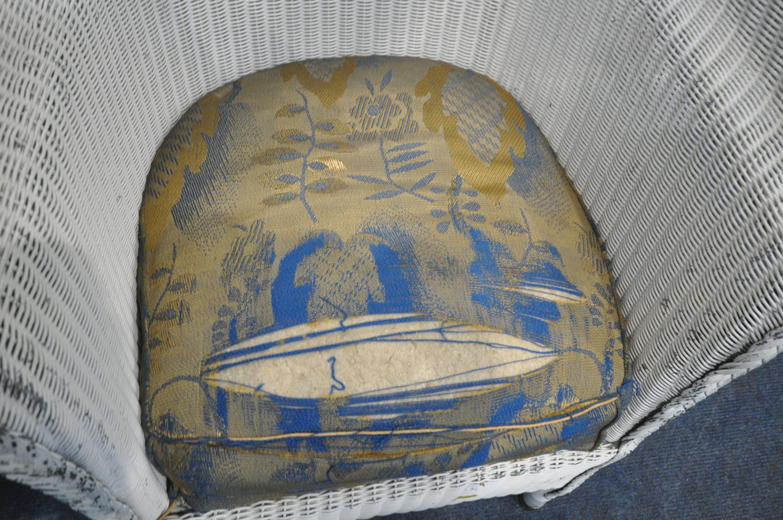 A PAIR OF WICKER ARMCHAIRS, a white painted armchair, along with a Lloyd Loom armchair, with a drop in seat, condition report: all with marks, scuffs, stains, upholstery ripped, one armchair overpainted, other wear and usage (4)