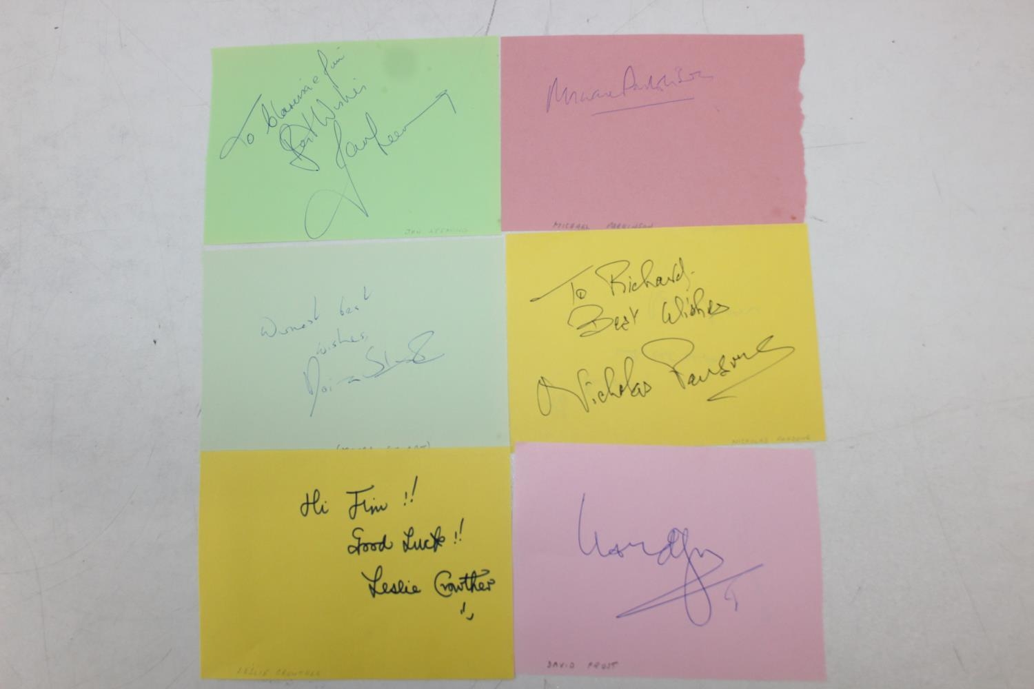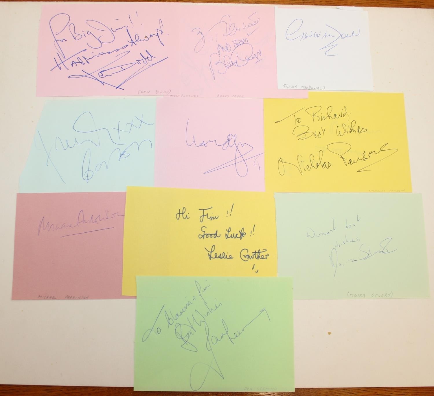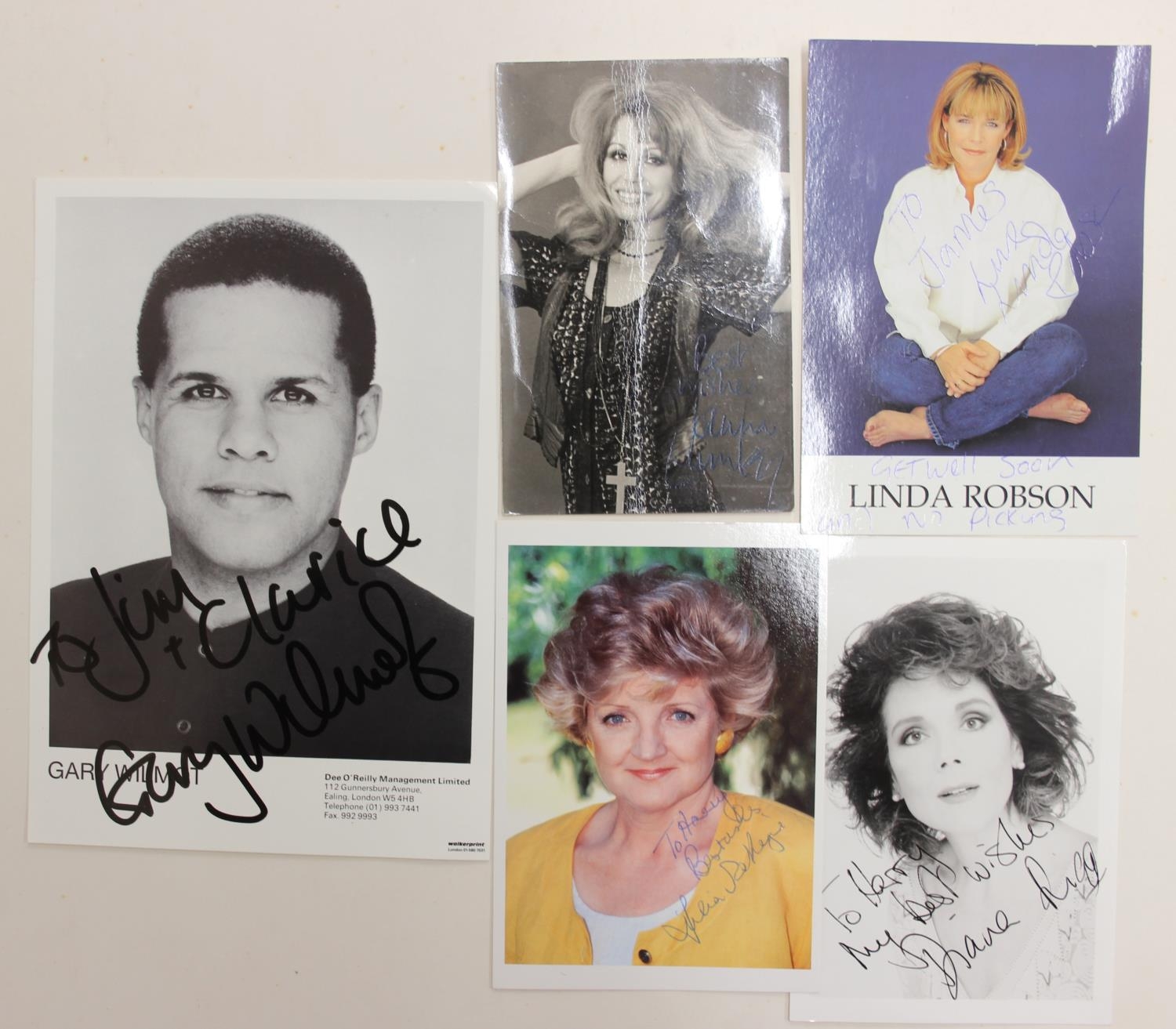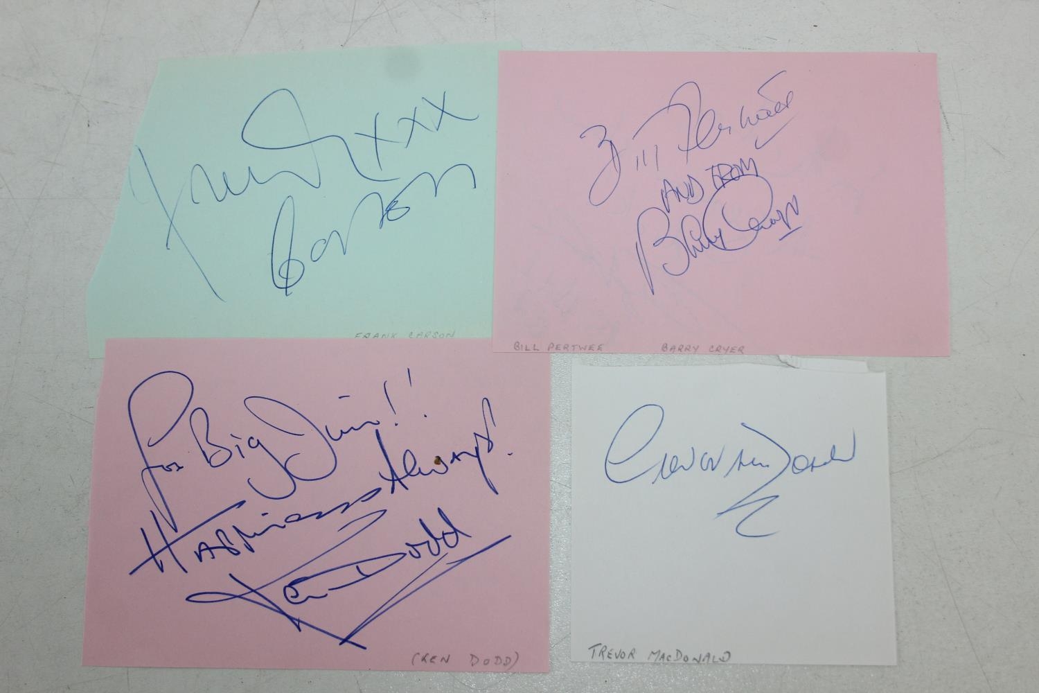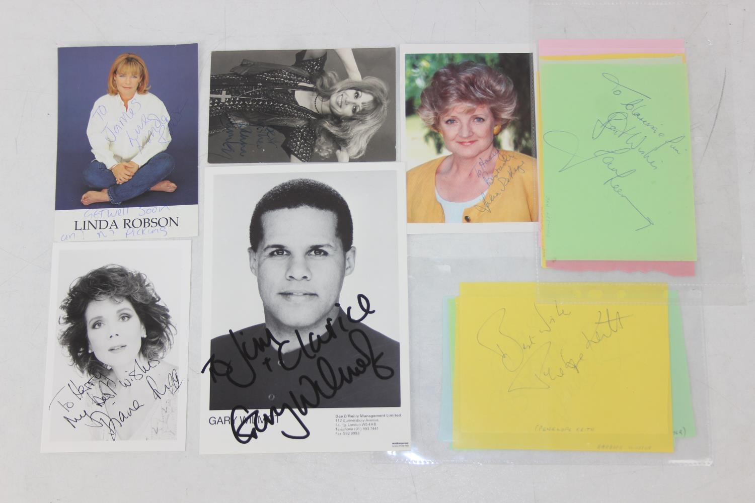 Autographs; Actors - British stage and screen star signed publicity photos to include Joanna Lumley, Diana Rigg, Linda Robson, Julia McKenzie and Gary Wilmot and other non photos to include British stage and screen star autographs to include Zoe Wannamaker, Barbara Windsor, Penelope Keith, Joanna Lumley, Maureen Lipman, Peter Sallis, Richard Briers, Geoffrey Palmer, Trevor McDonald, Moira Stewart, Jan Leeming, David Frost, Nicholas Parsons, Michael Parkinson, Leslie Crowther, Frank Carson, Barry Cryer, Bill Pertwee and Kenn Dodd [24]