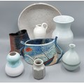 A studio pottery vase by Paul Jackson decorated with a costal scene, together with other studio pottery to include a jug by Linda Bloomfield, a vase by Annick Galimont, three vases by Diana Peyton and a dish