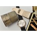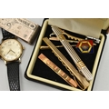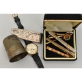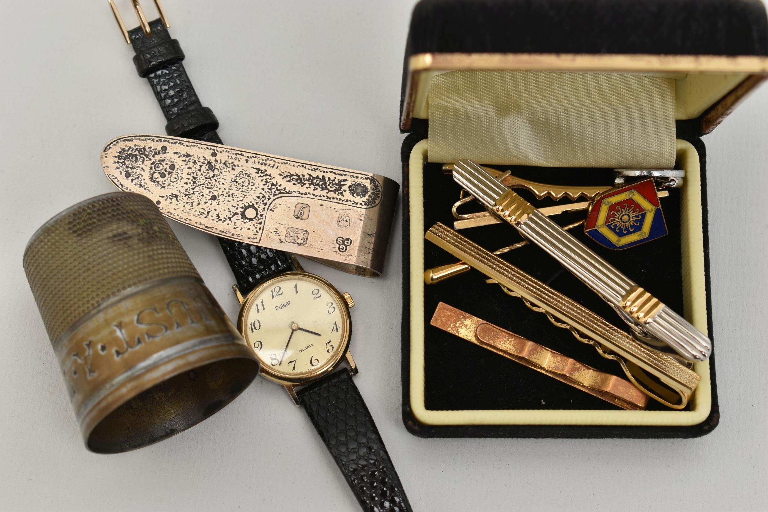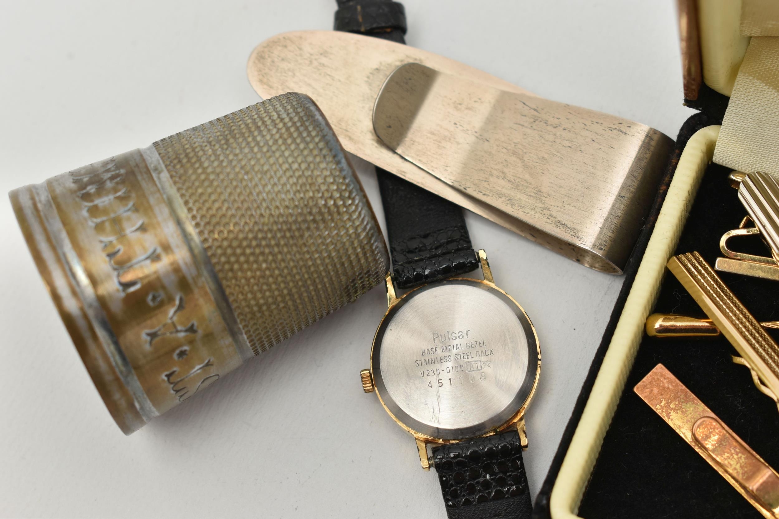 A SILVER MONEY CLIP AND OTHER ITEMS, textured pattern to the money clip, hallmarked 'GPS' London, approximate gross weight 14.9 grams, tie clips, stick pin, a 'Pulsar' quartz wristwatch fitted with a black strap, and a white metal cup 'Just A Thimble Full'