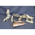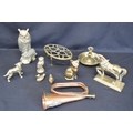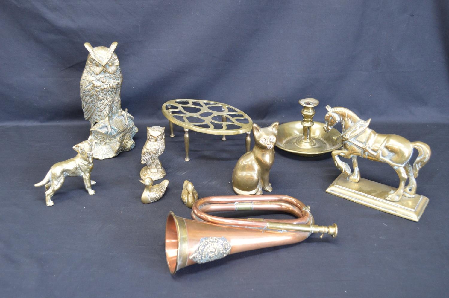 Quantity of brass and copper ware to comprise: seven brass animal figures, chamber stick, trivet and copper bugle