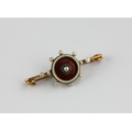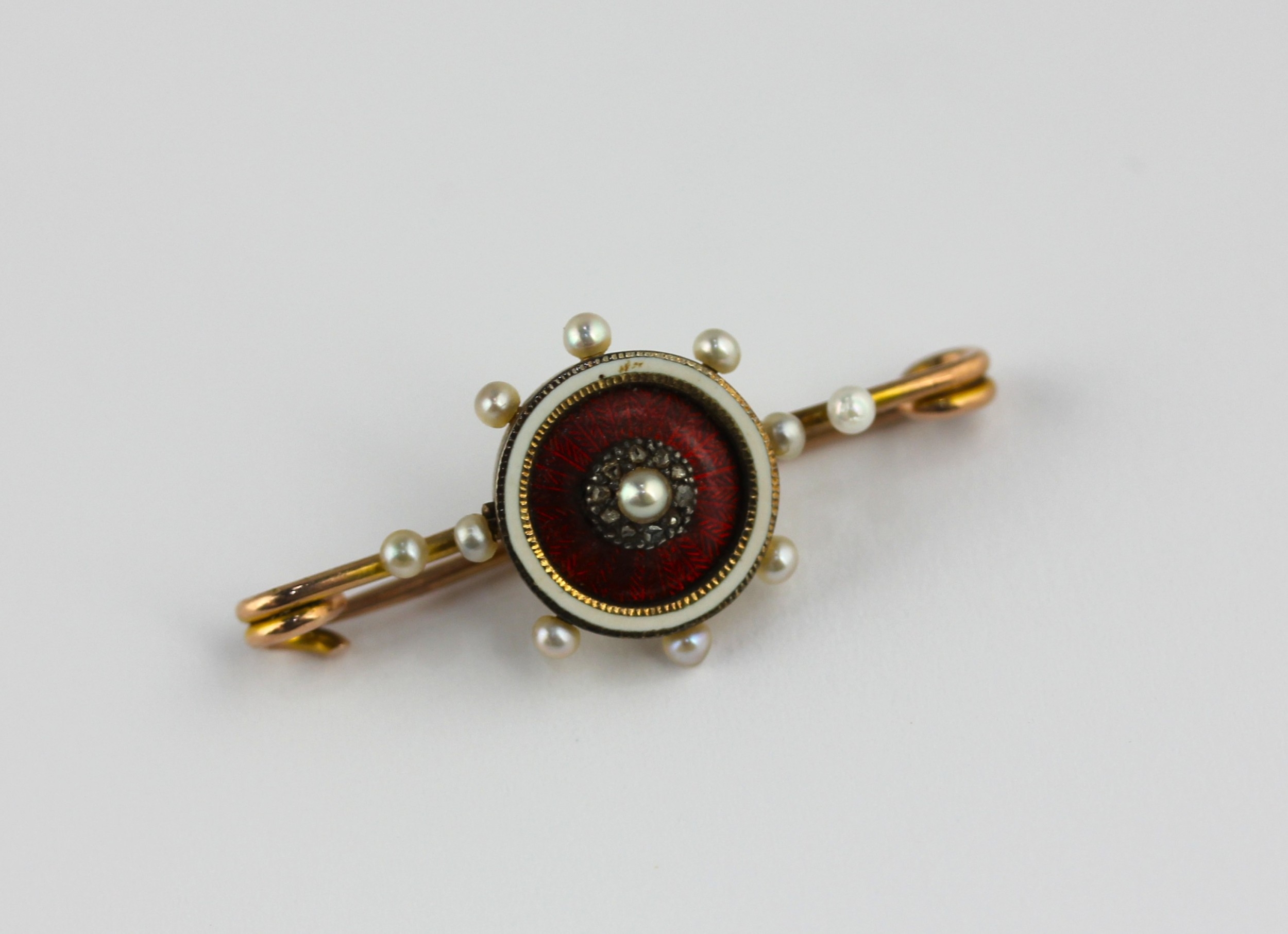 A gold, diamond and seed pearl set, red and white enamel bar brooch gross weight 3.9g