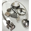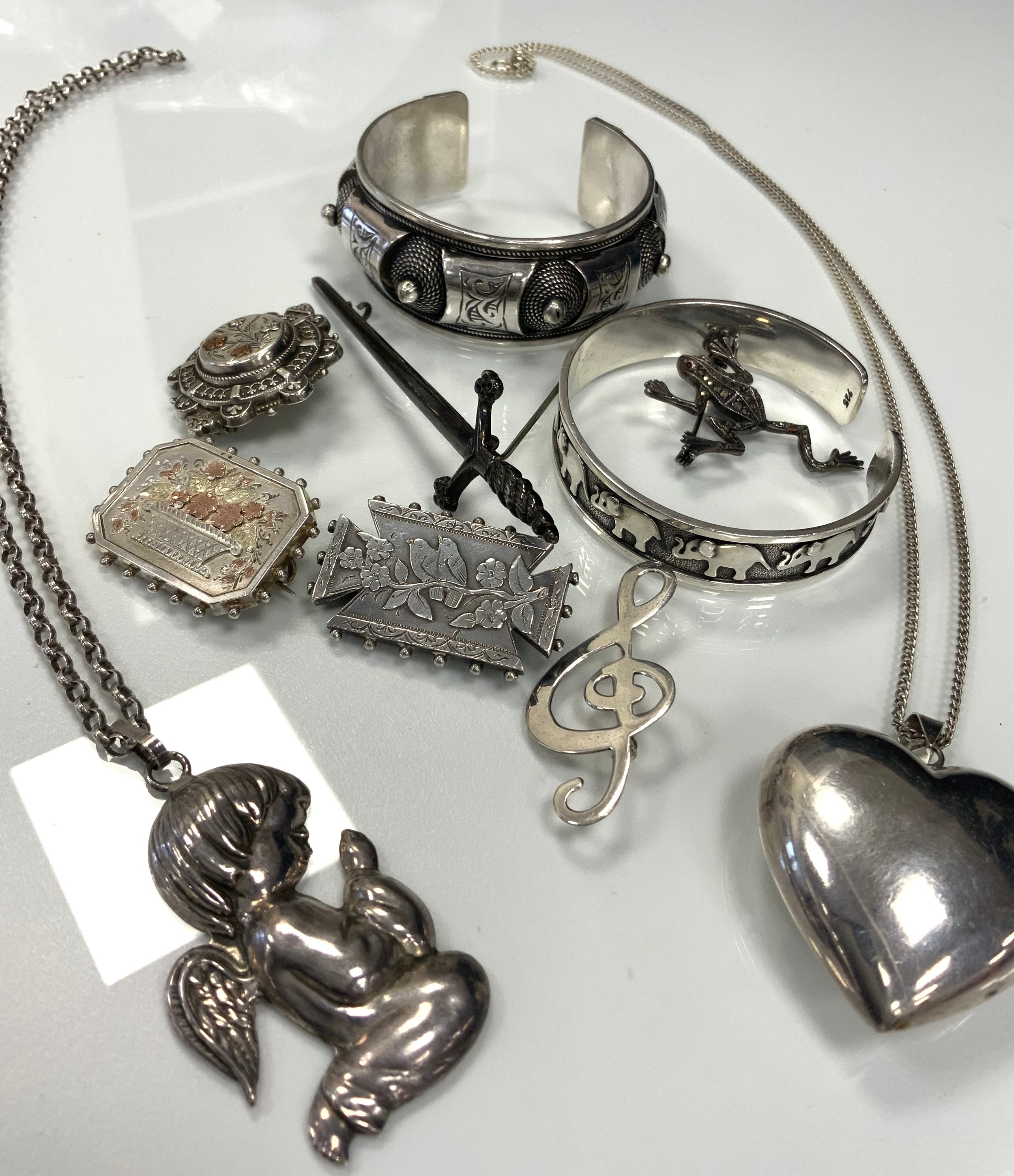 An Victorian silver Aesthetic movement brooch, Birmingham 1888, another 1889, silver coloured metal bangle, Cherub pendant, Heart pendant, Frog brooch etc, part unmarked 145g gross