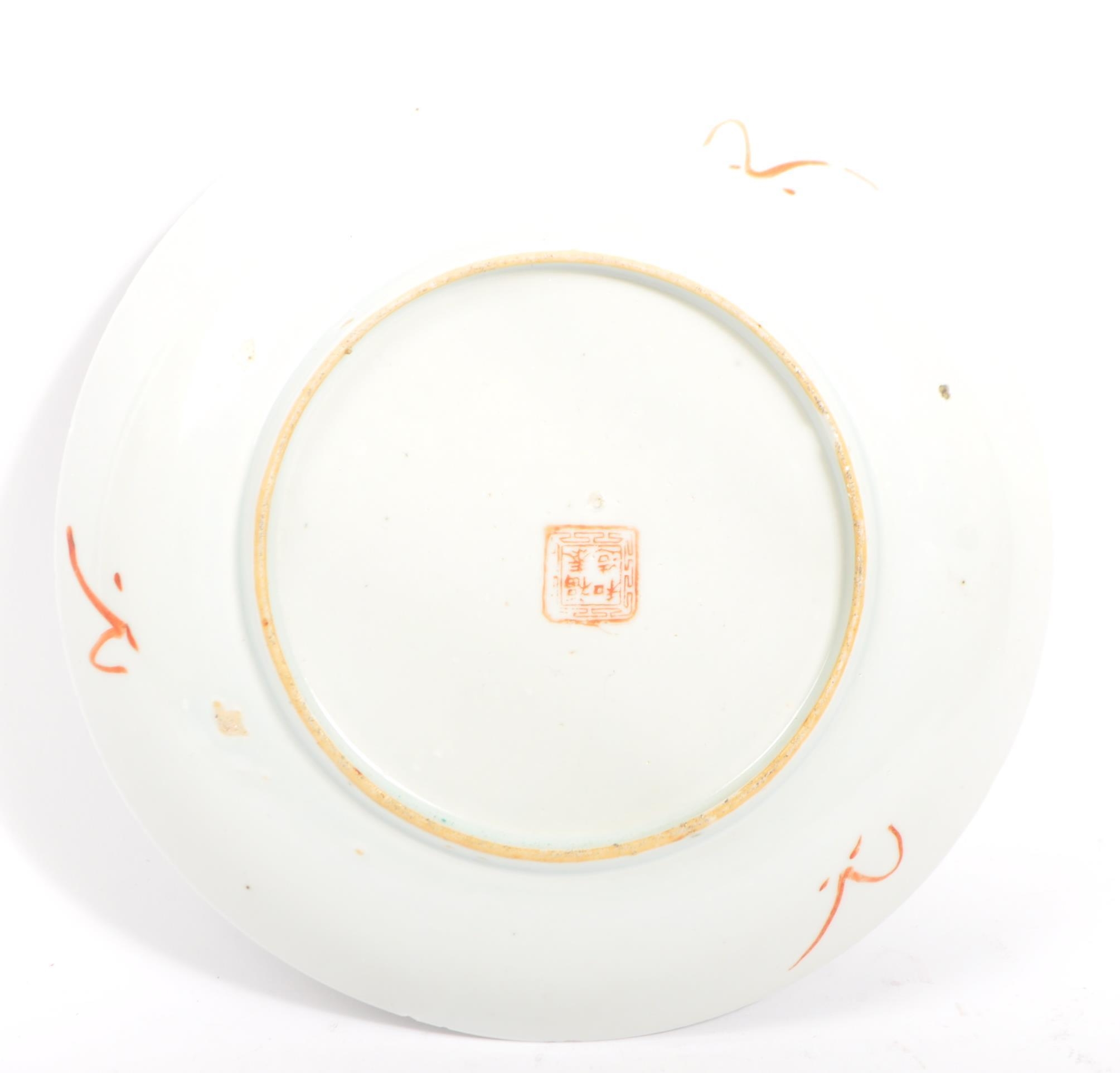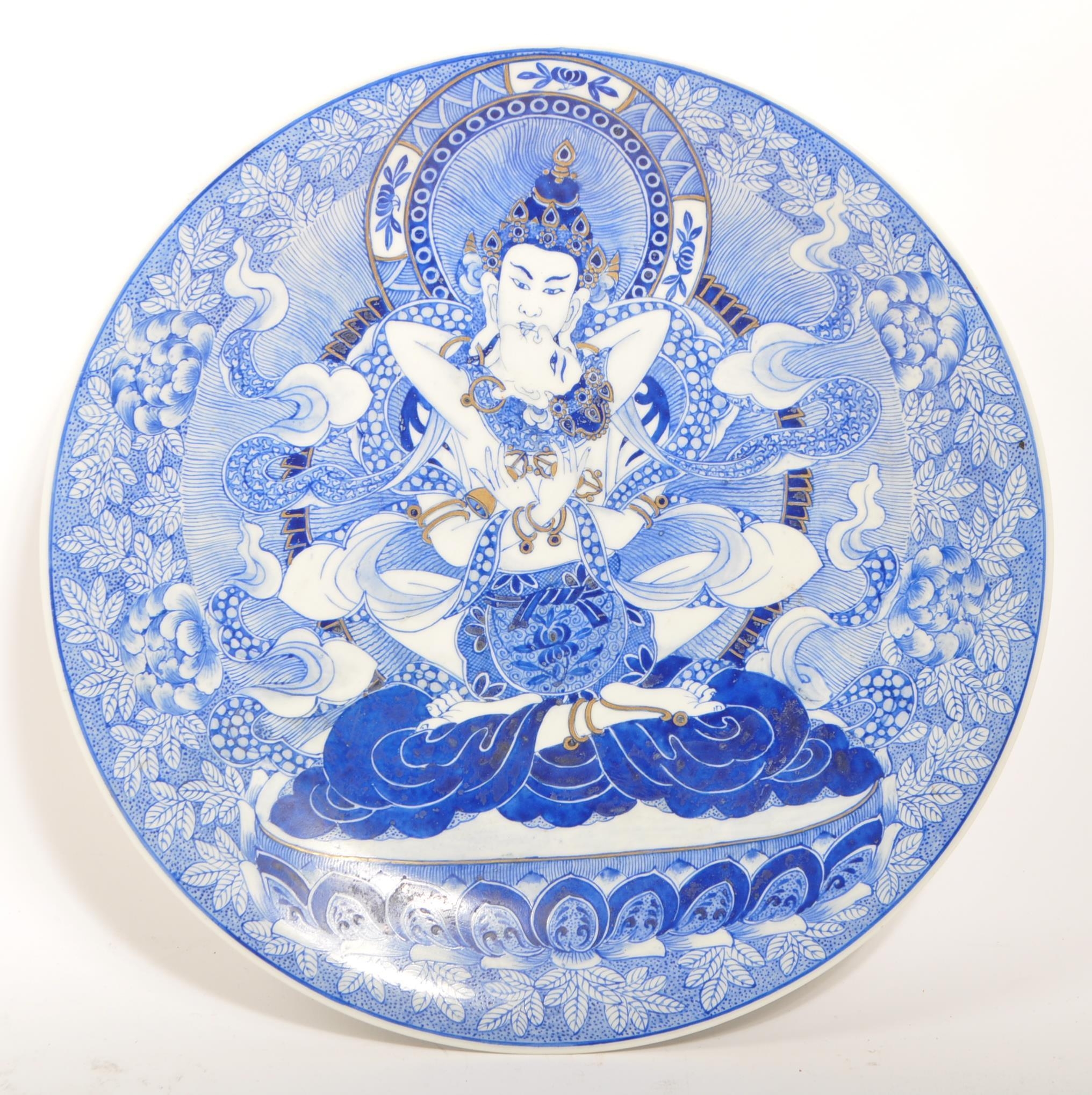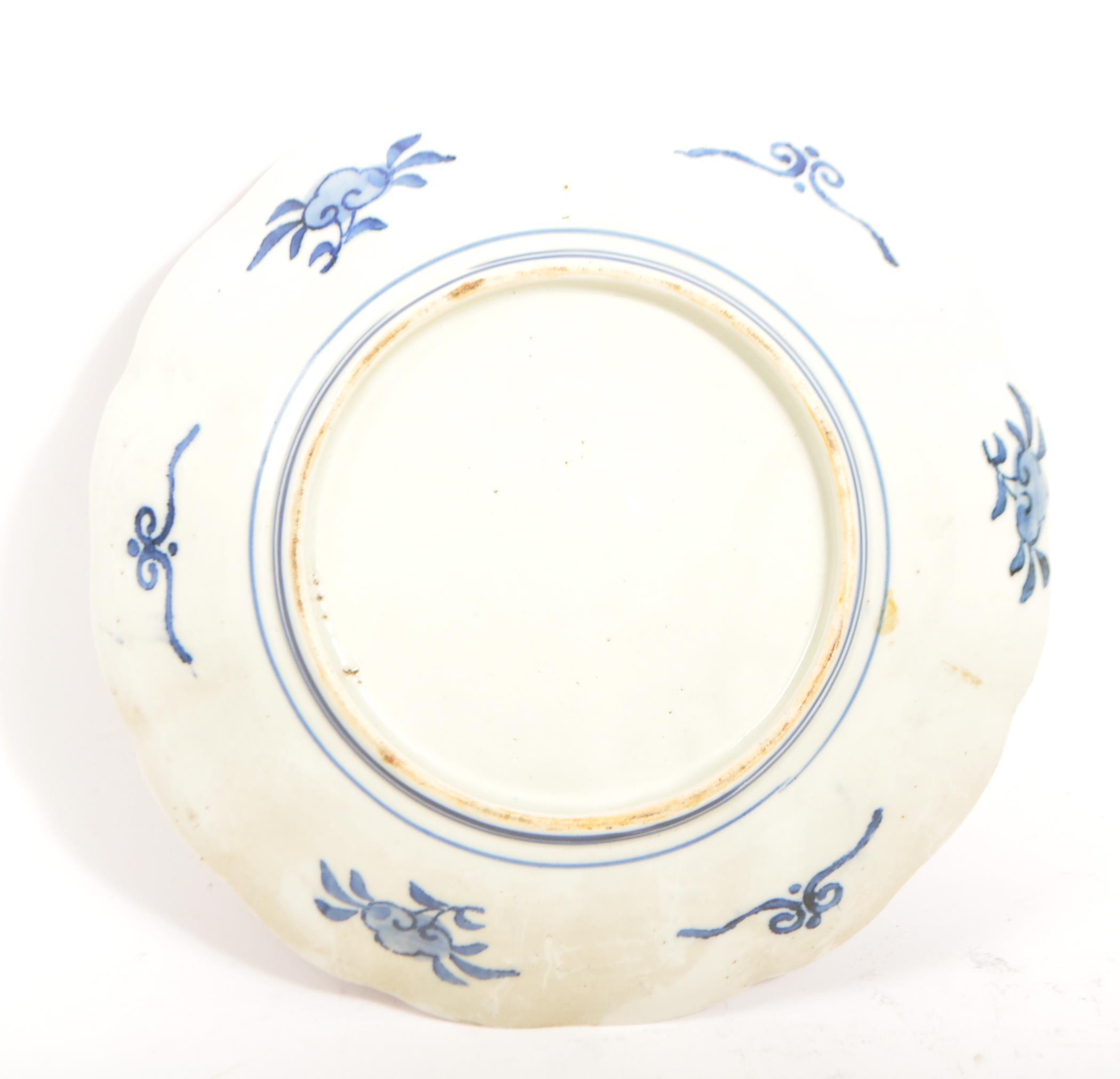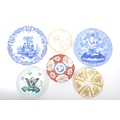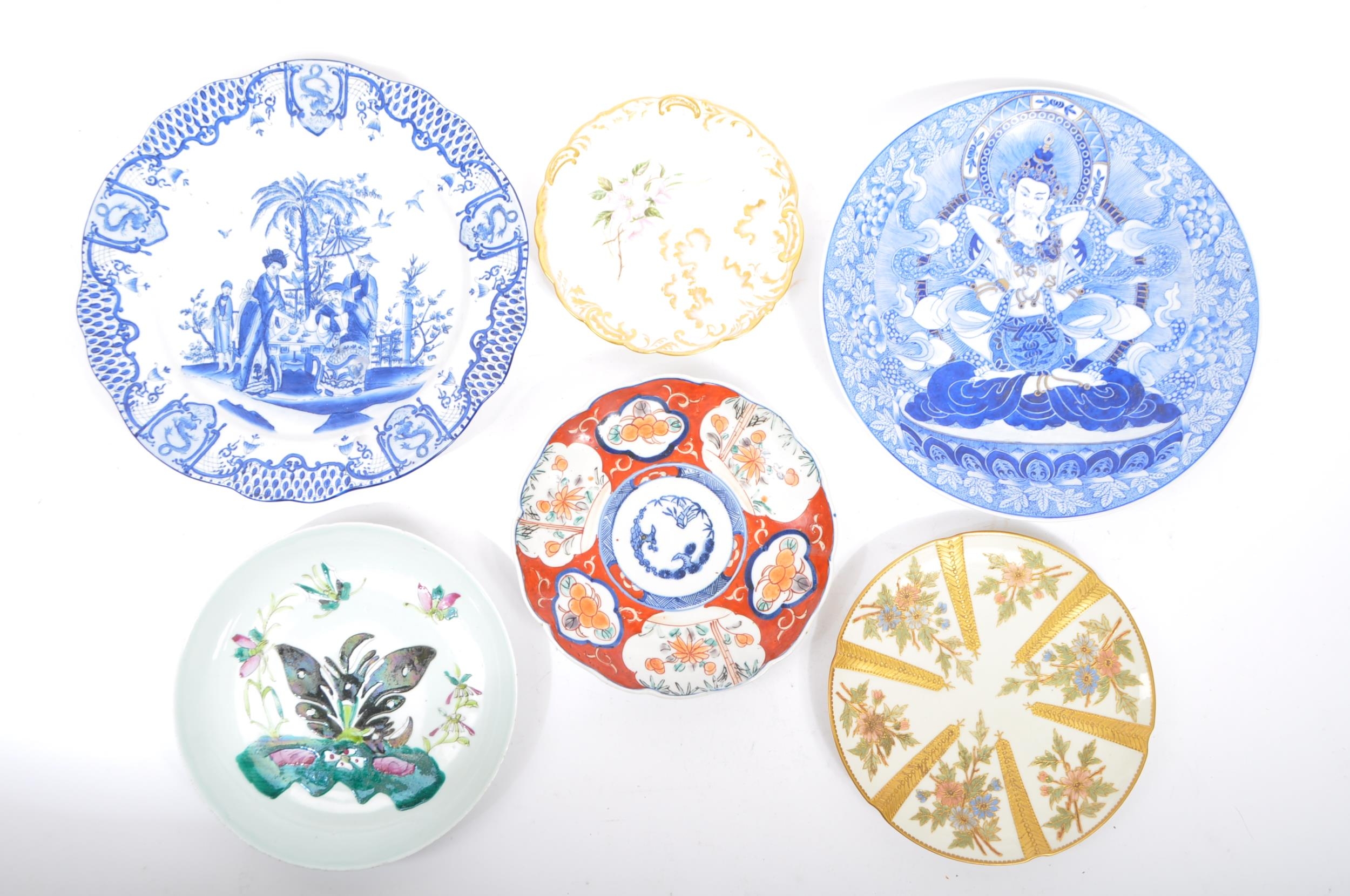 A collection of 19th century and later Asian / English ceramic display cabinet plates. Including blue and white Asian oriental plates, imari style plate, 1892 English dedicated plate and another unmarked plate, with hand painted floral design with gilt finish. Largest measures approx. 31cm diameter.