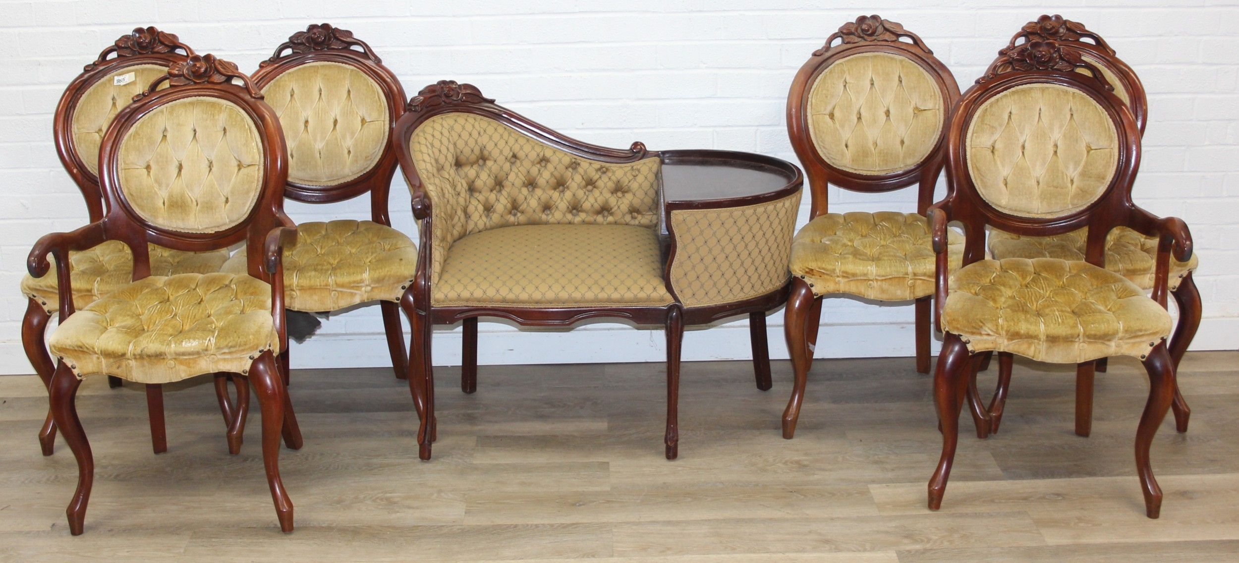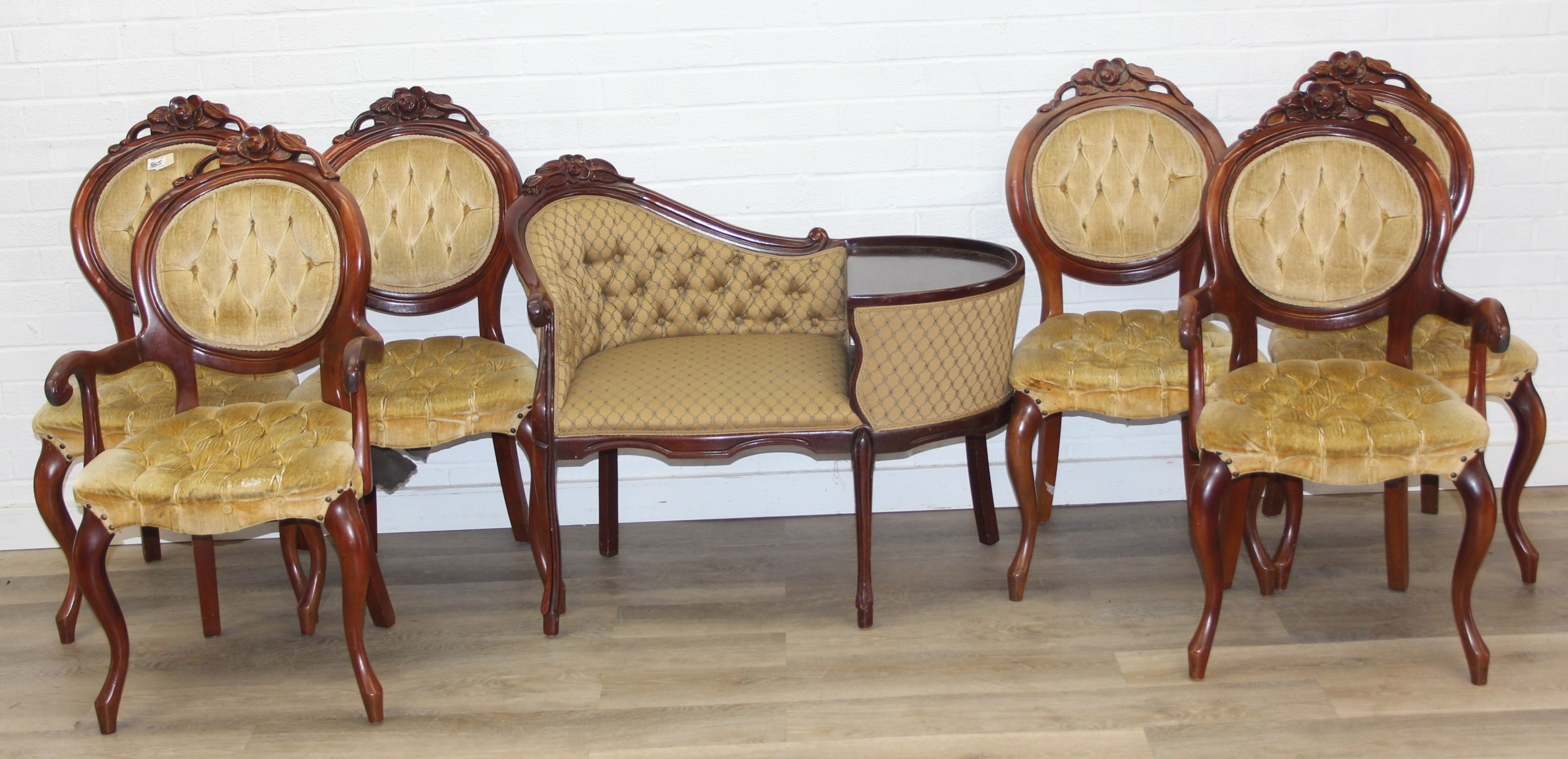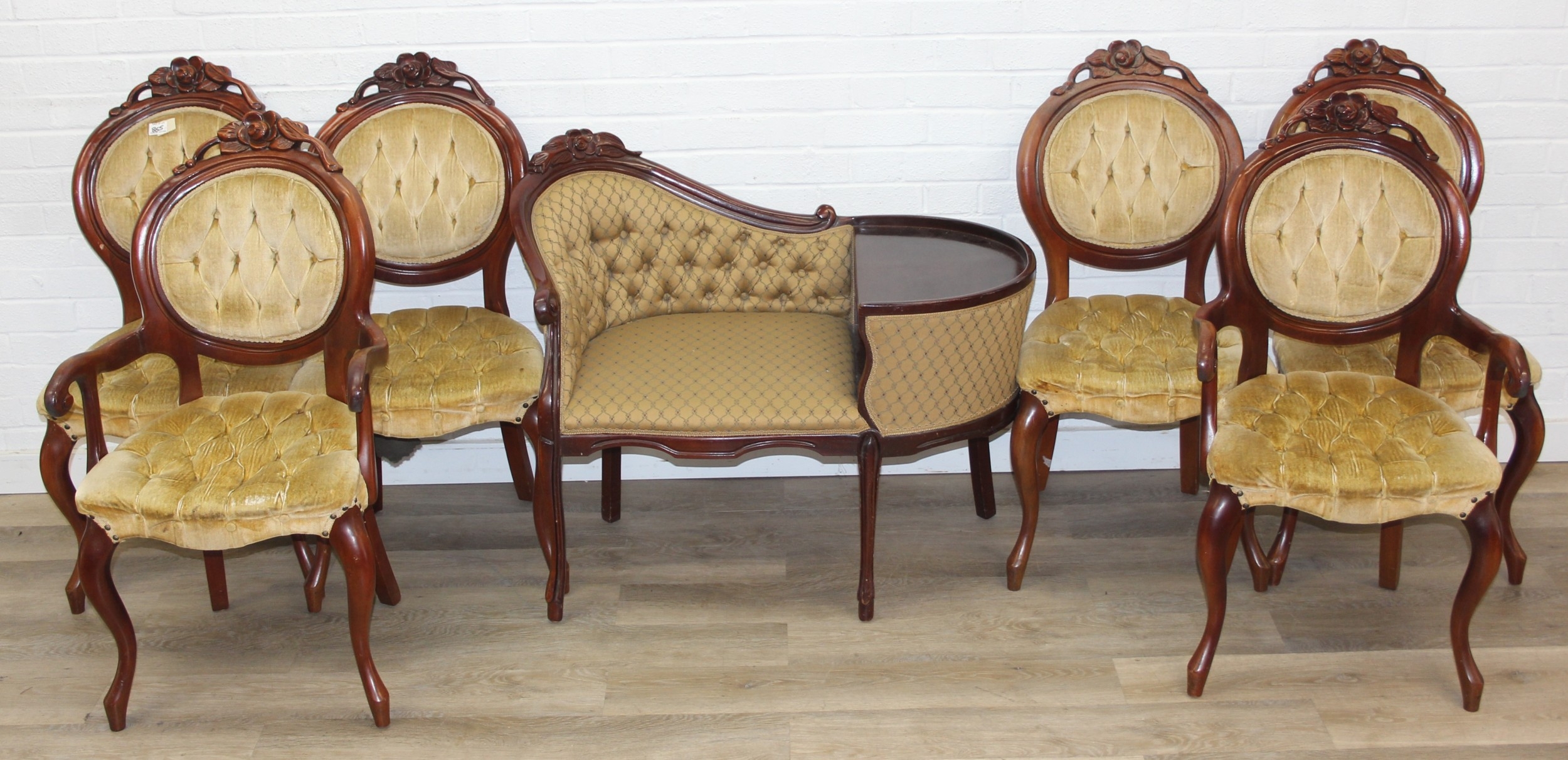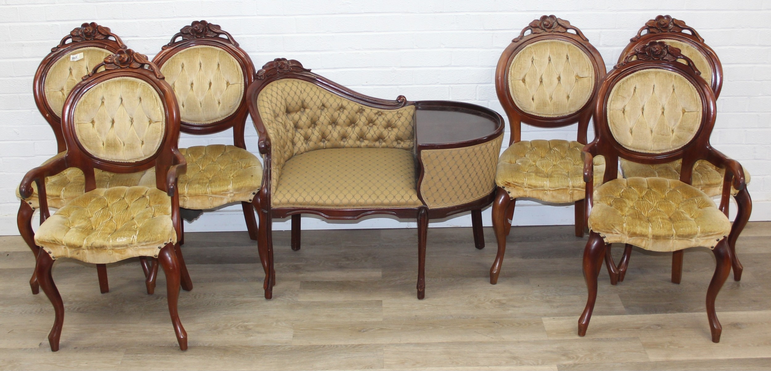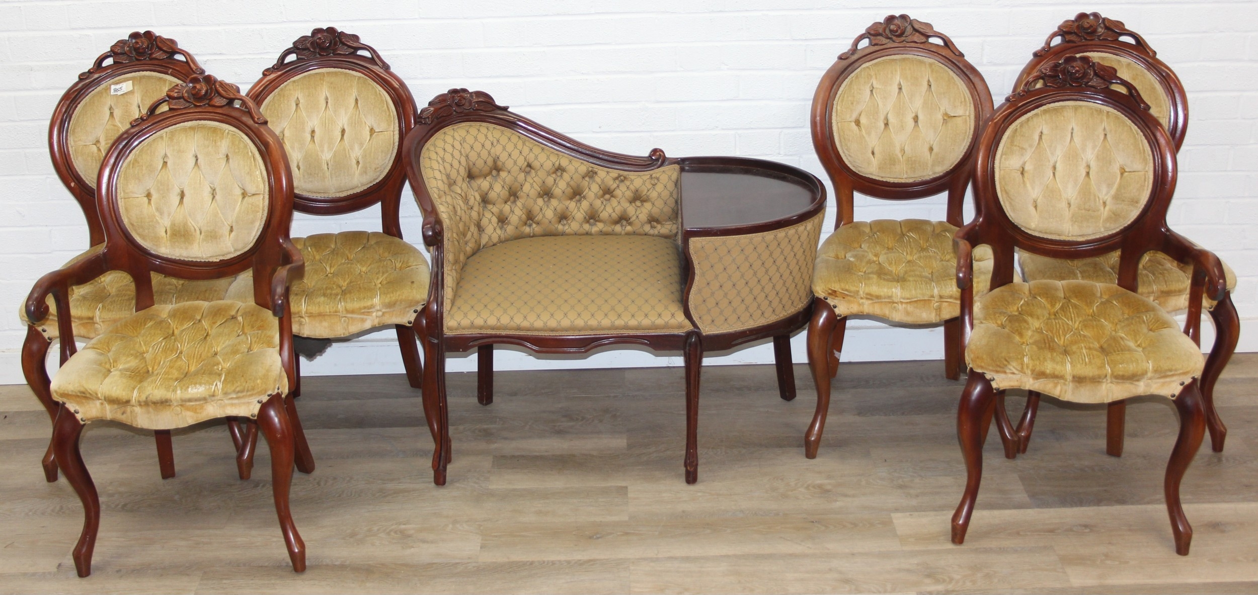 An antique style telephone table and a similar designed set of six upholstered button back chairs, the telephone table 97cm x 54cm x 84cm [7]