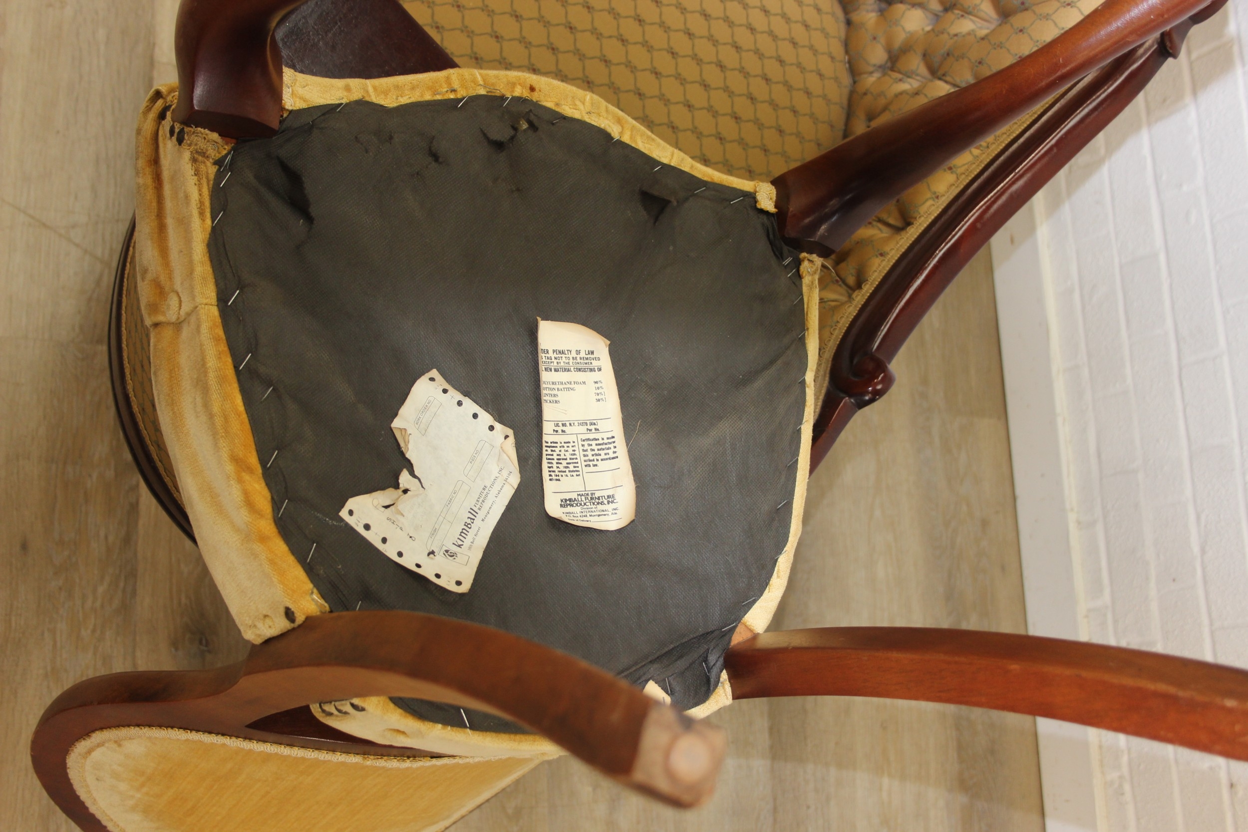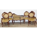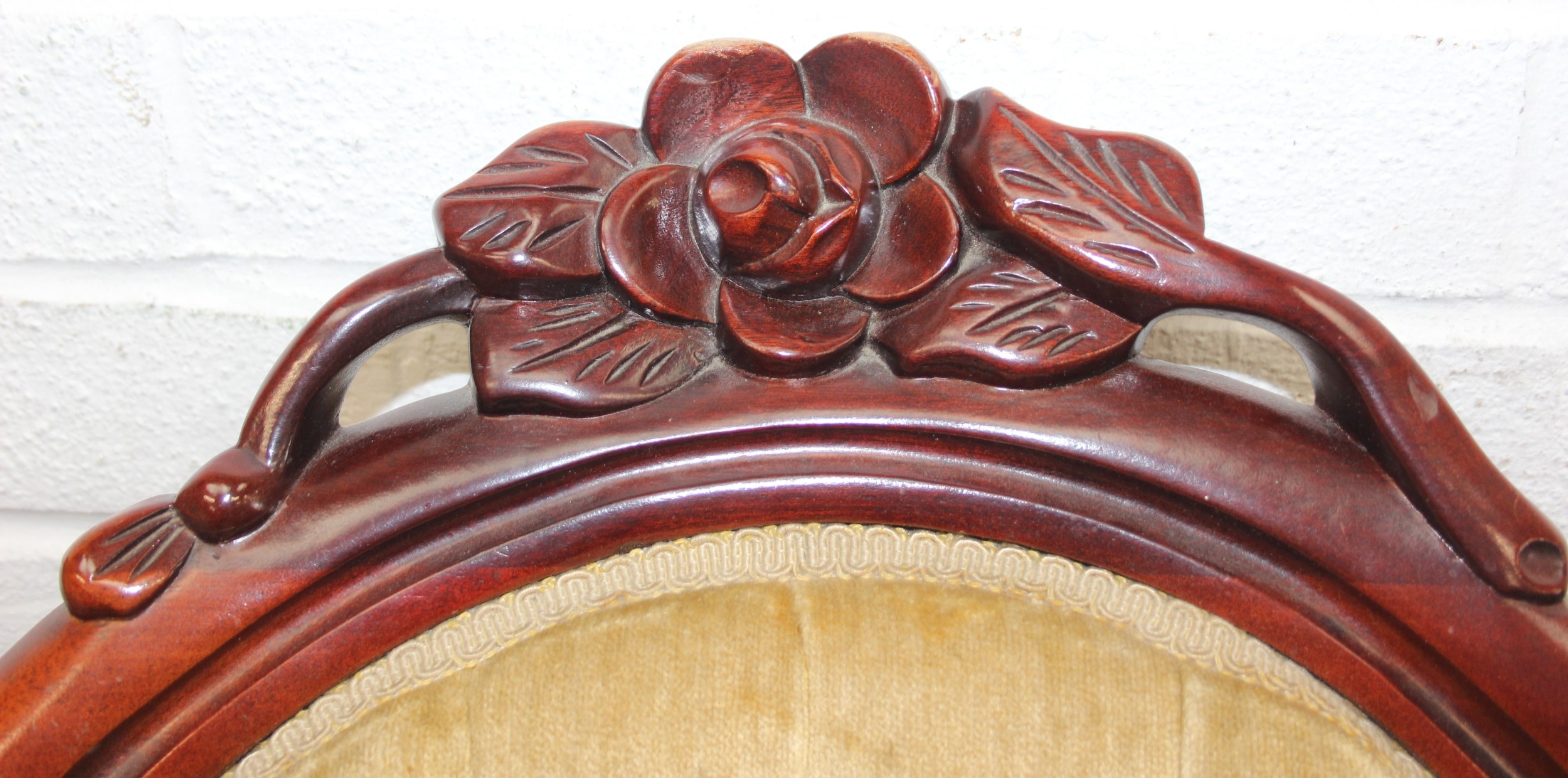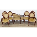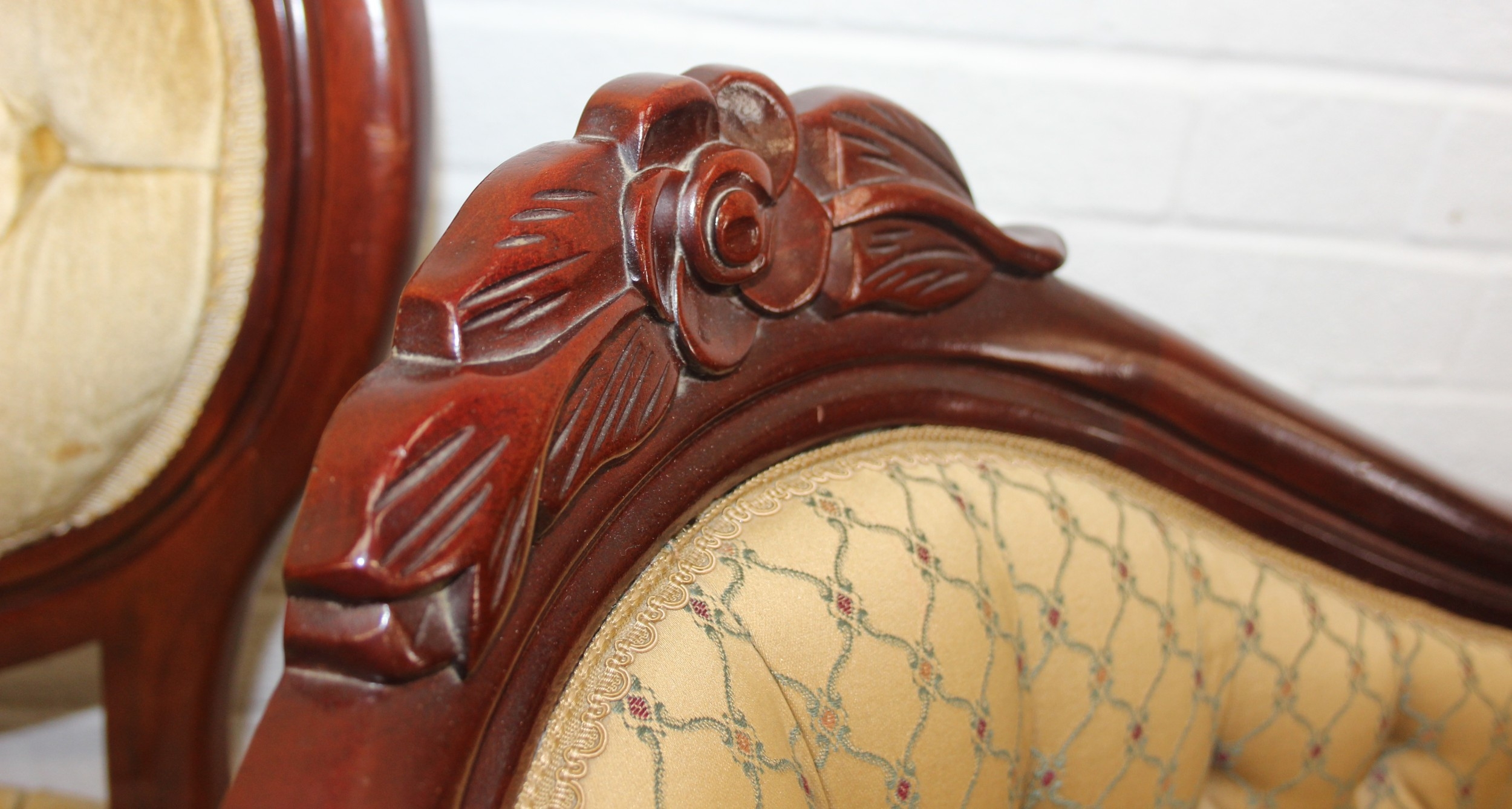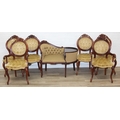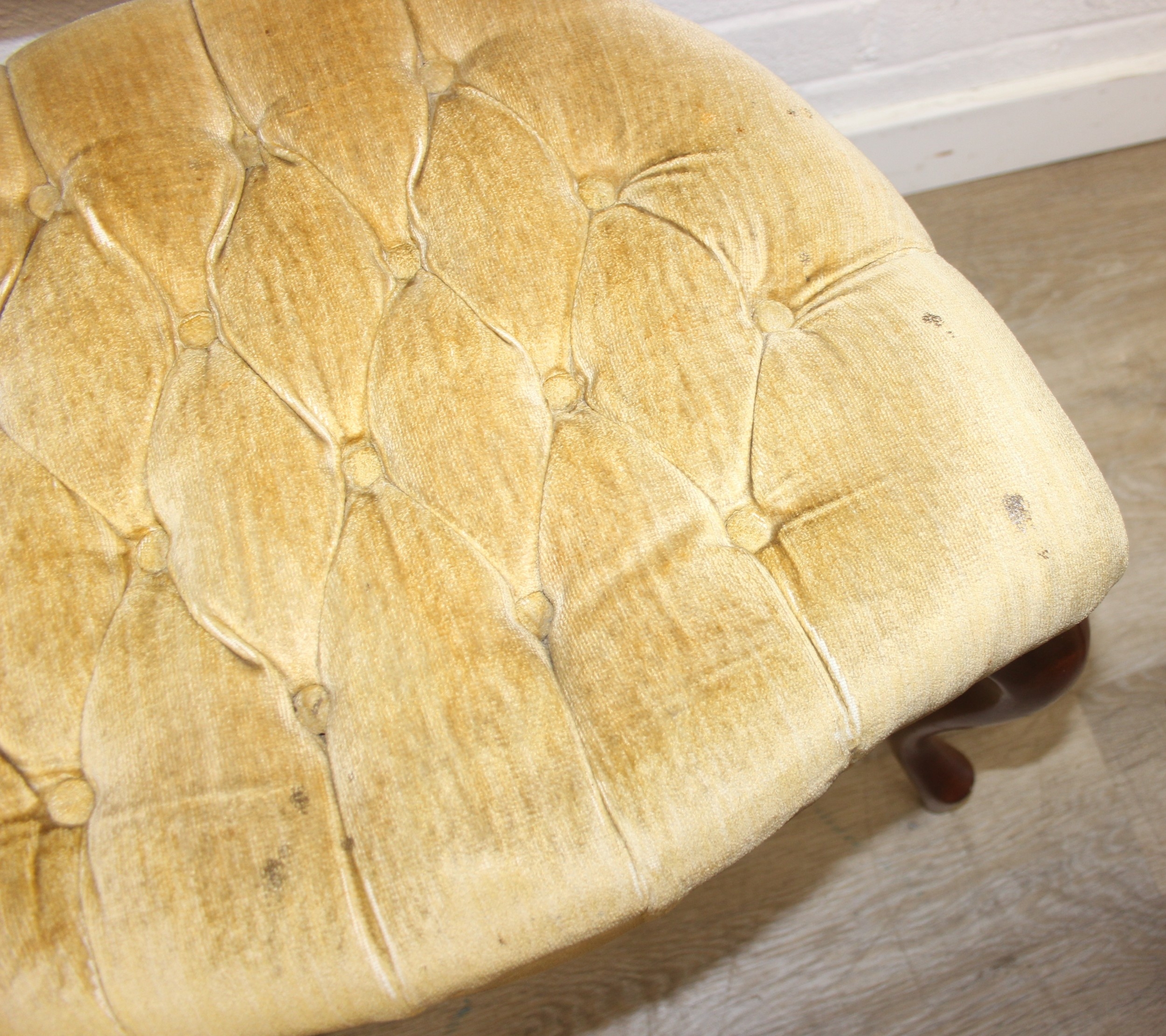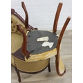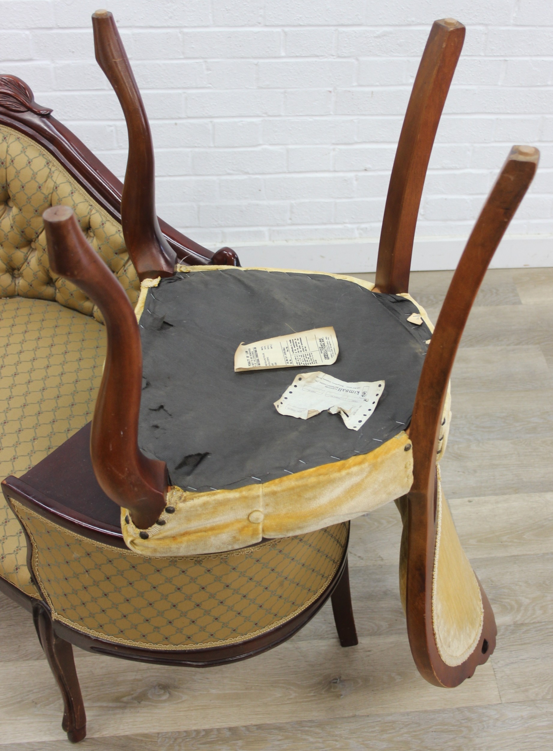 An antique style telephone table and a similar designed set of six upholstered button back chairs, the telephone table 97cm x 54cm x 84cm [7]