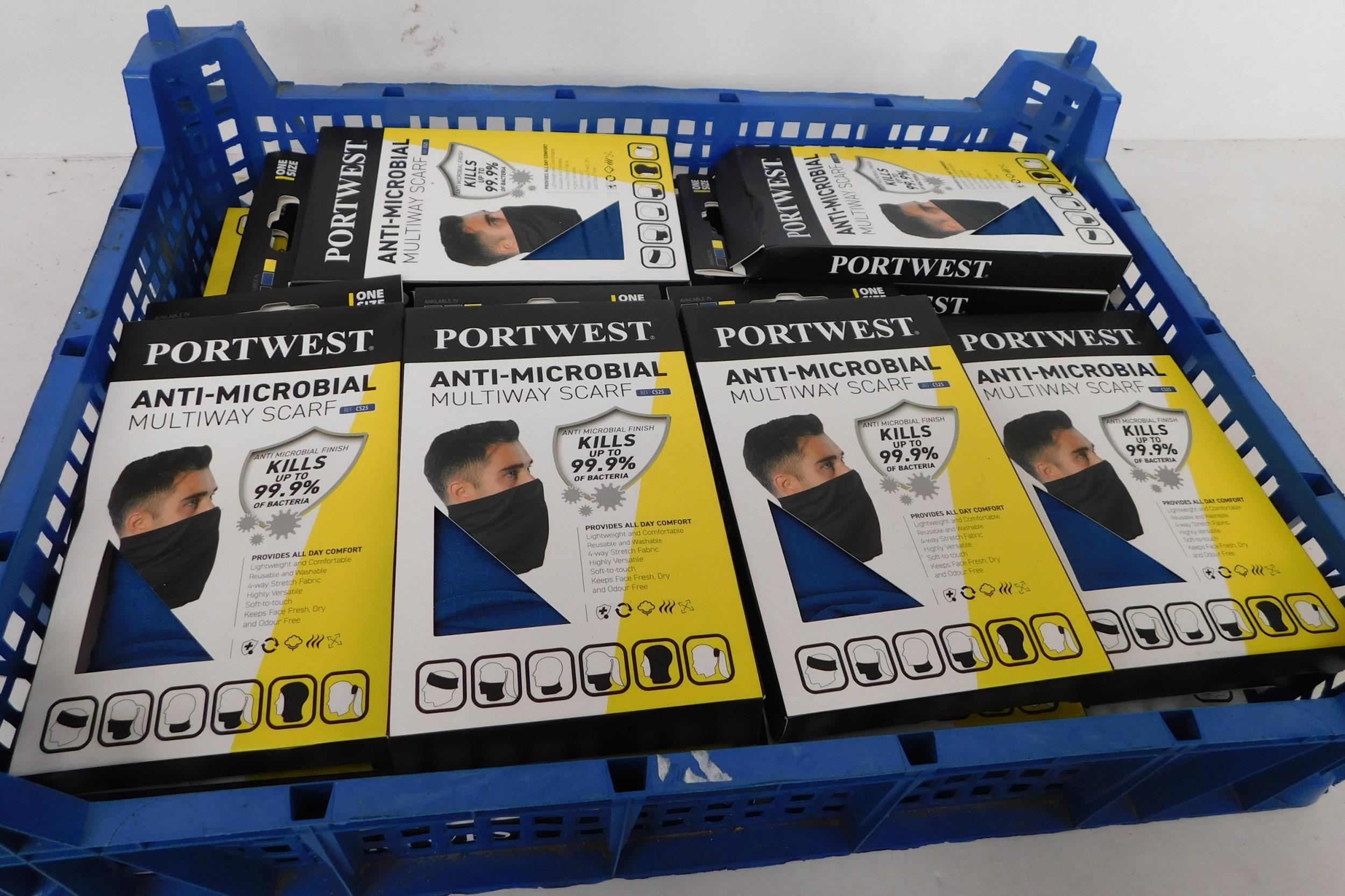 Tray of 15+ new Portwest anti-microbial multiway scarves
