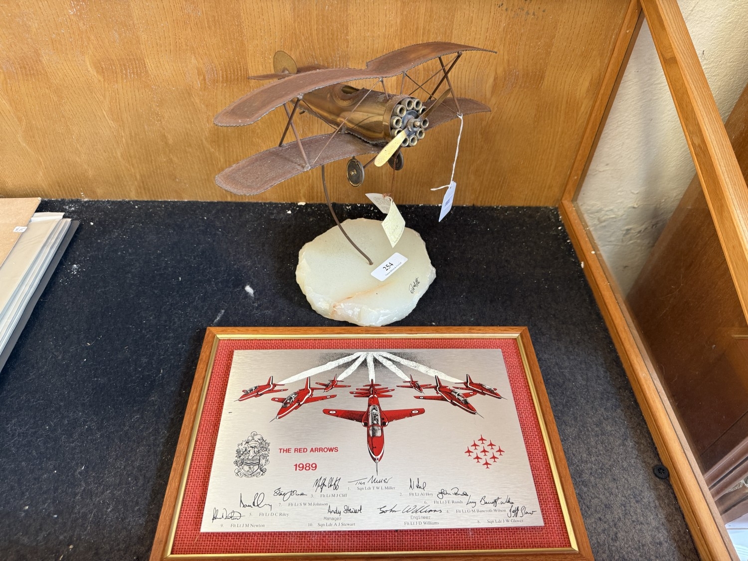 A metallic sculpture of a bi-plane by De Mott together with a commemorative Red Arrows plaque