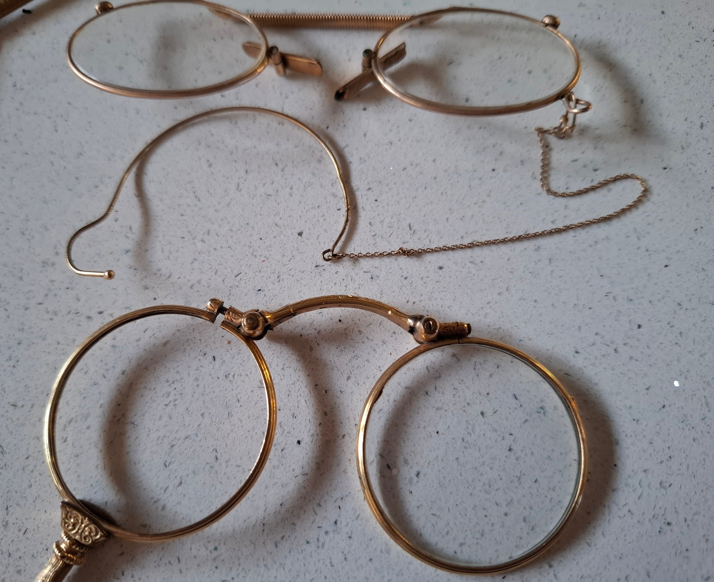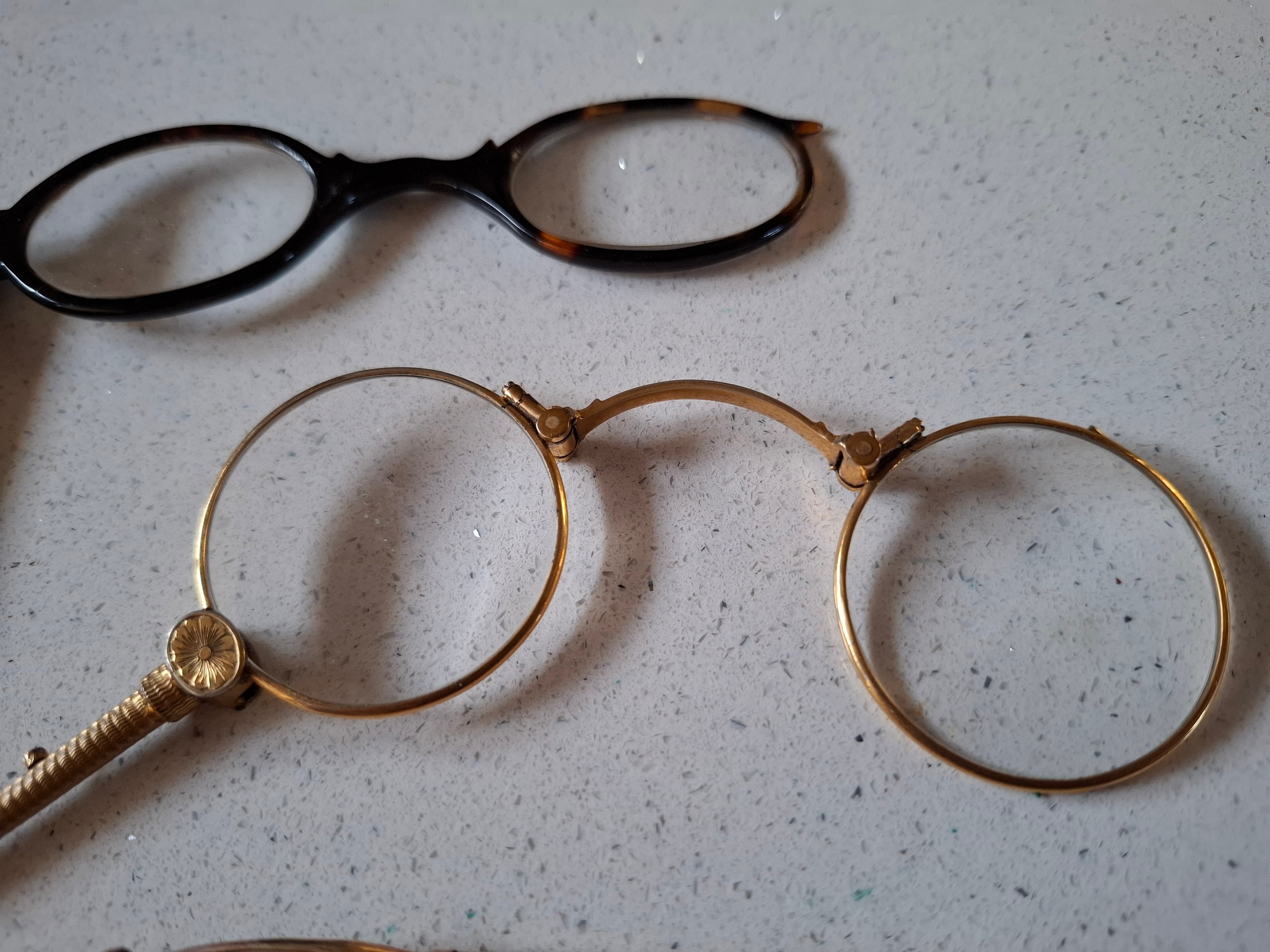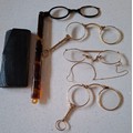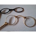Three pairs of early 20th Century yellow metal spectacles and a faux tortoiseshell pair