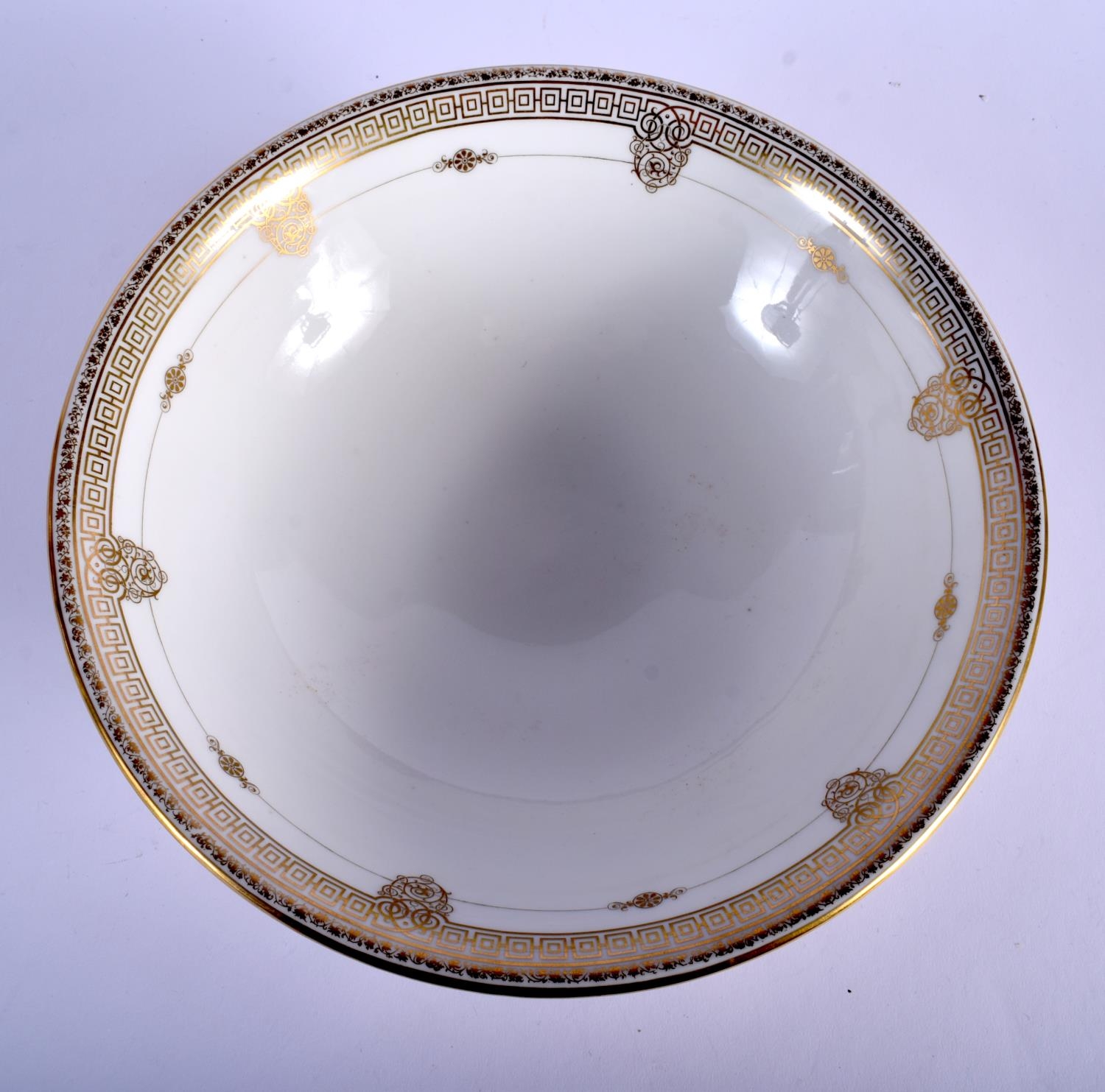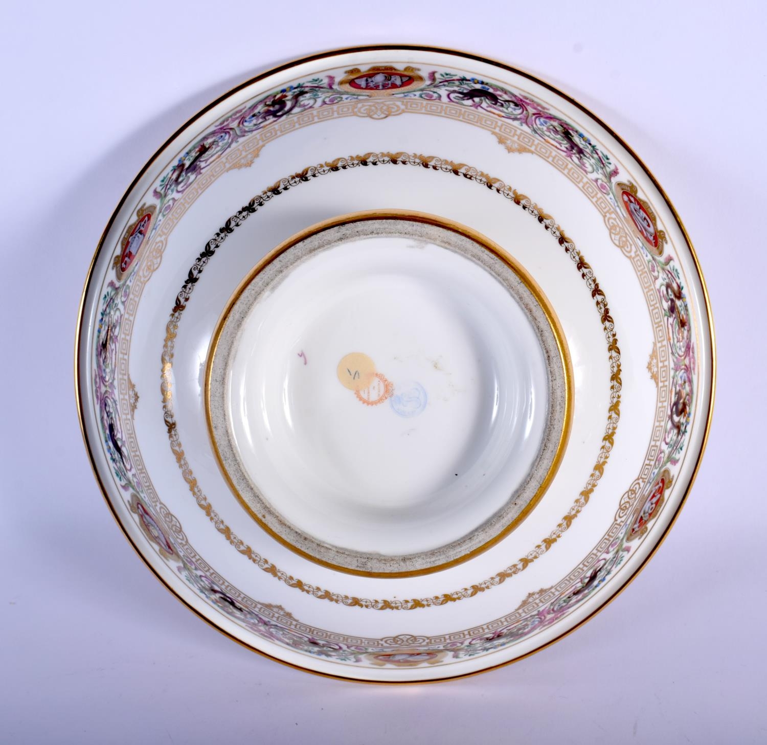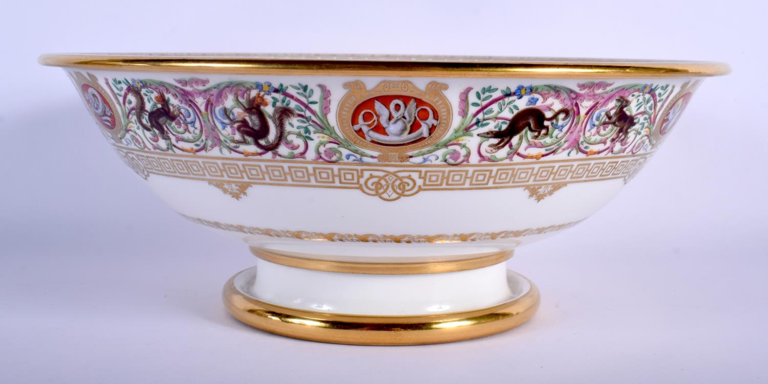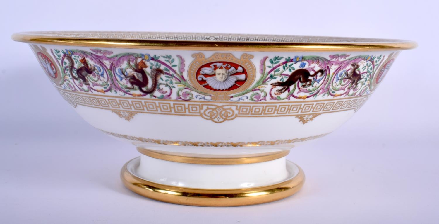 SEVRES BOWL DATED 1846 PAINTED IN THE HUNTING SERVICE PATTERN OF LOUIS PHILLIPE, WITH DETAILED BORDERS OF SCROLLING FOLIAGE AND ANIMALS, PRINTED MARKS.9.5cm high, 25cm diameter