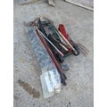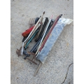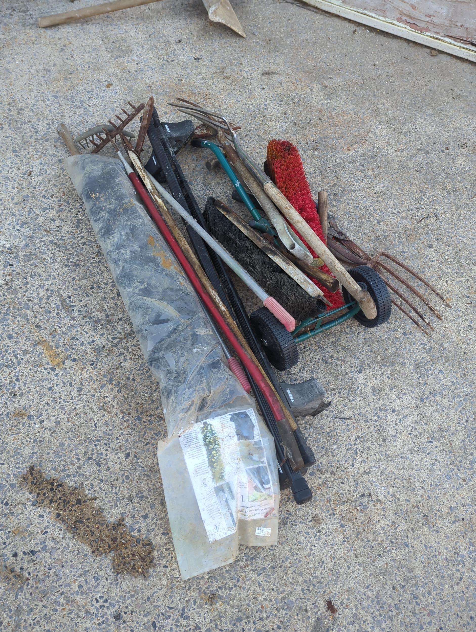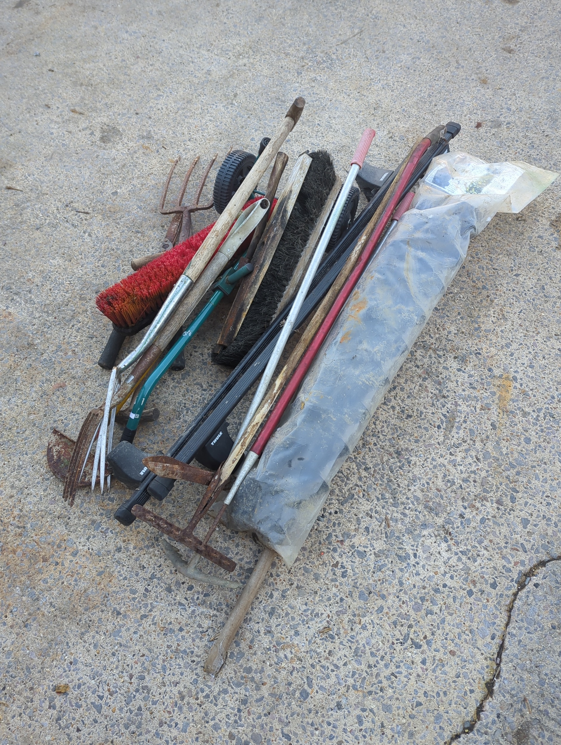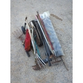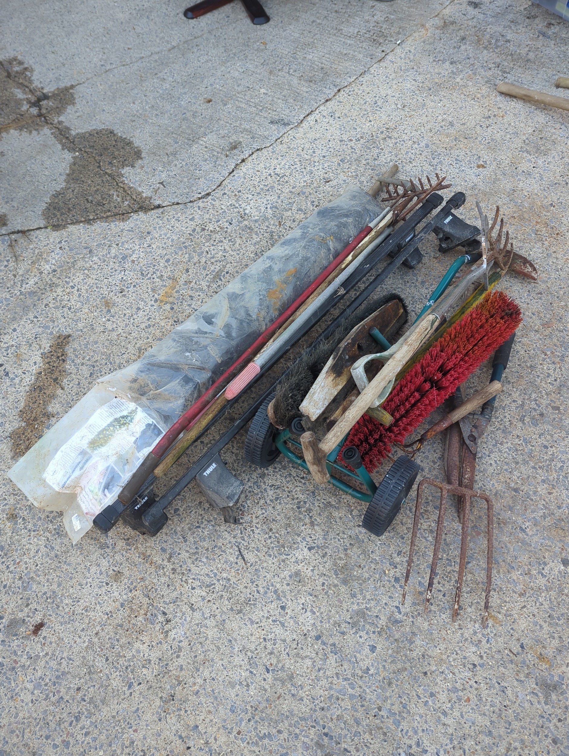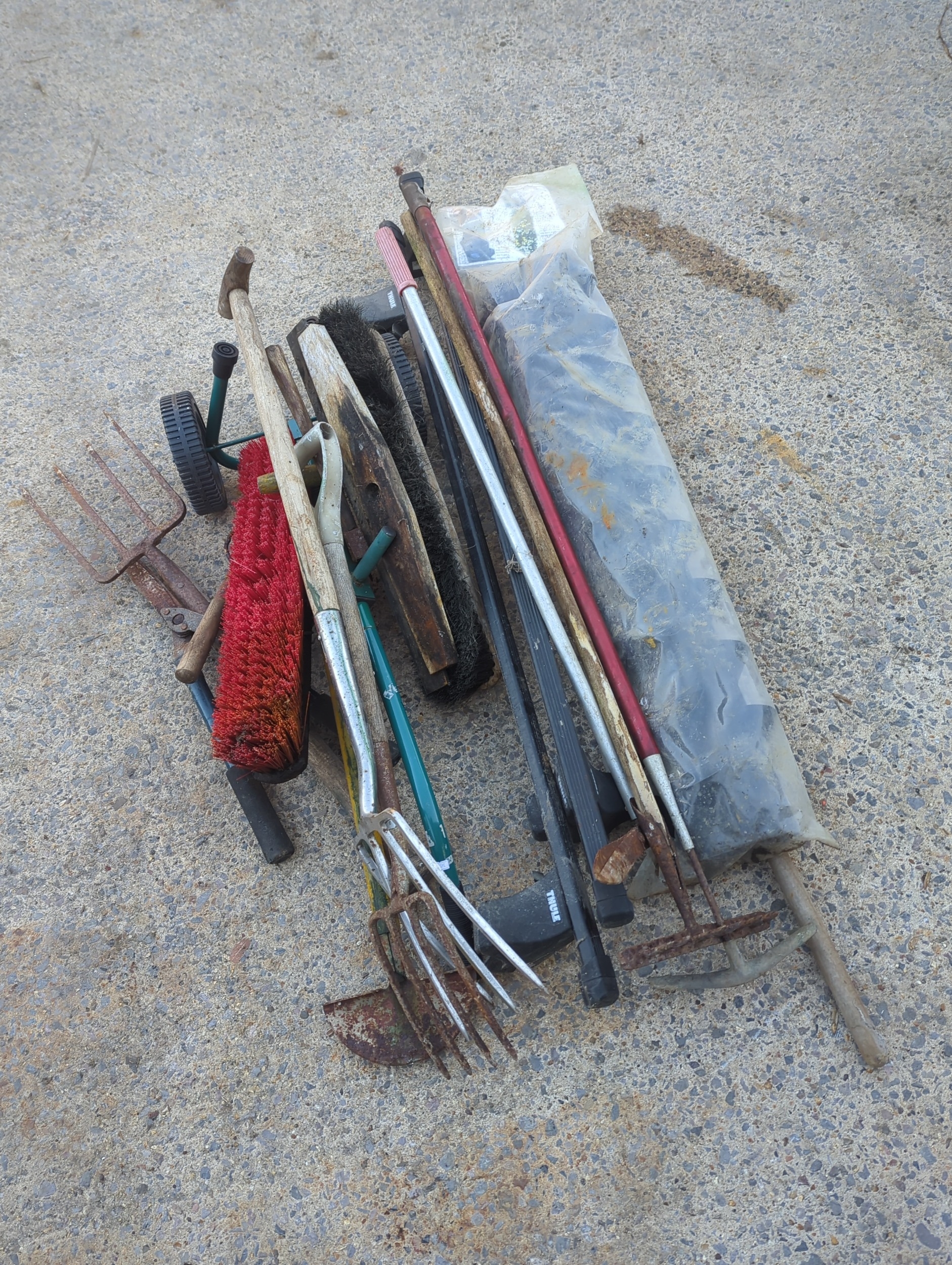 This collection features a variety of garden tools, including multiple hoes, rakes, and brushes. The tools vary in size and function, with some showing rust on their metal parts. Ideal for anyone looking to upgrade their garden equipment.