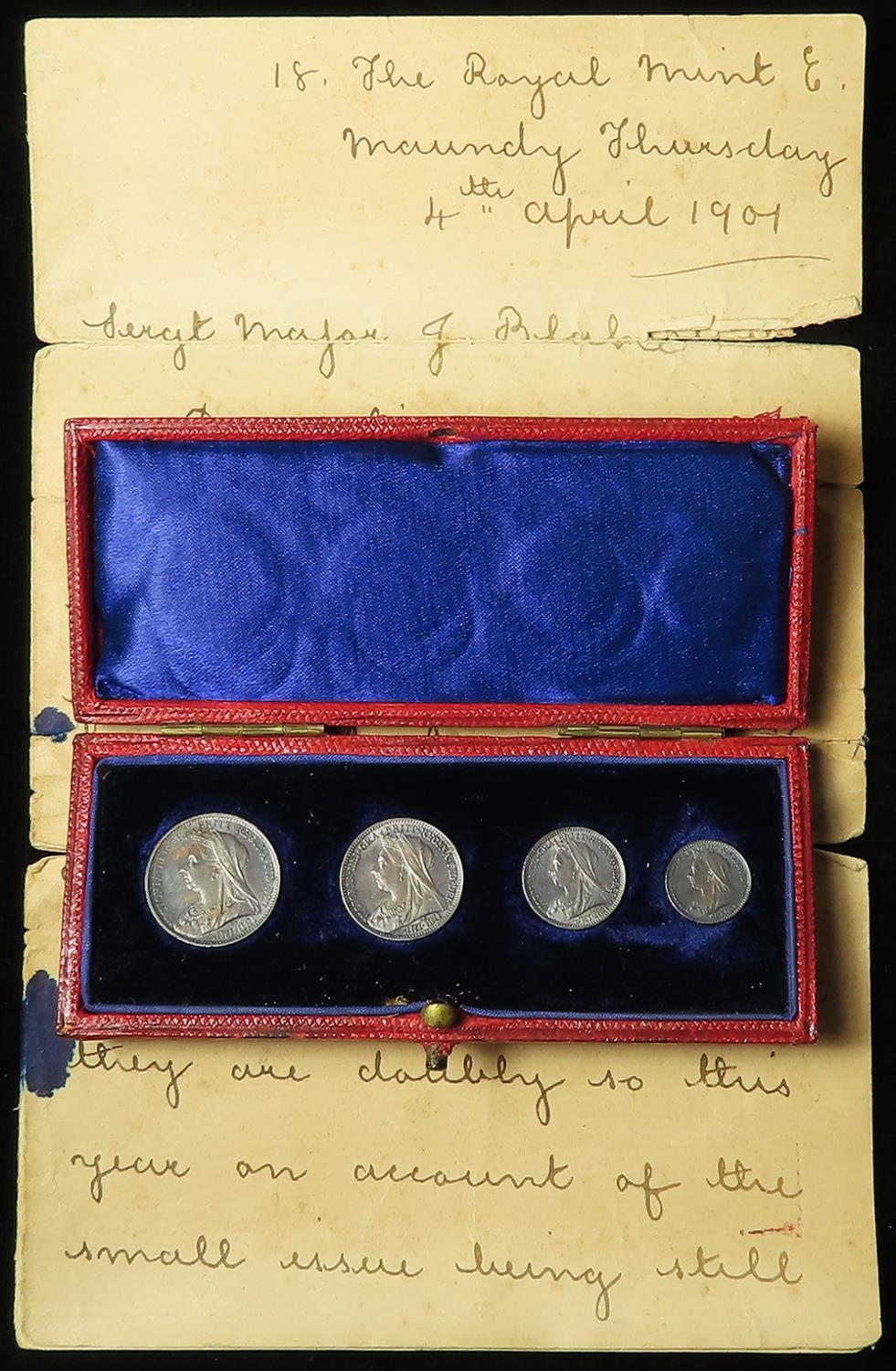 Maundy Set 1901 toned aFDC with a plush dated Royal Mint case, along with a letter dated 4th April 1901 from L.J. Ward of the Royal Mint to Sergt Major J. Blake "an old comrade in arms" concerning this being the last issue to bear the effigy of Queen Victoria.