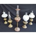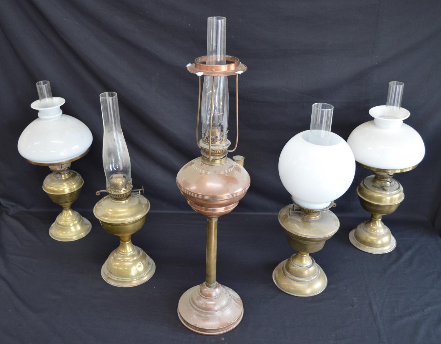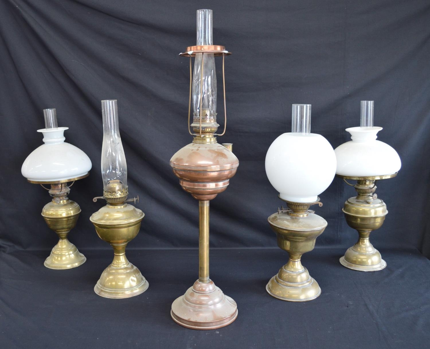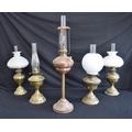 Group of five various brass and copper oil lamps - tallest 75cm including chimney