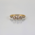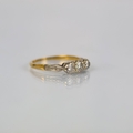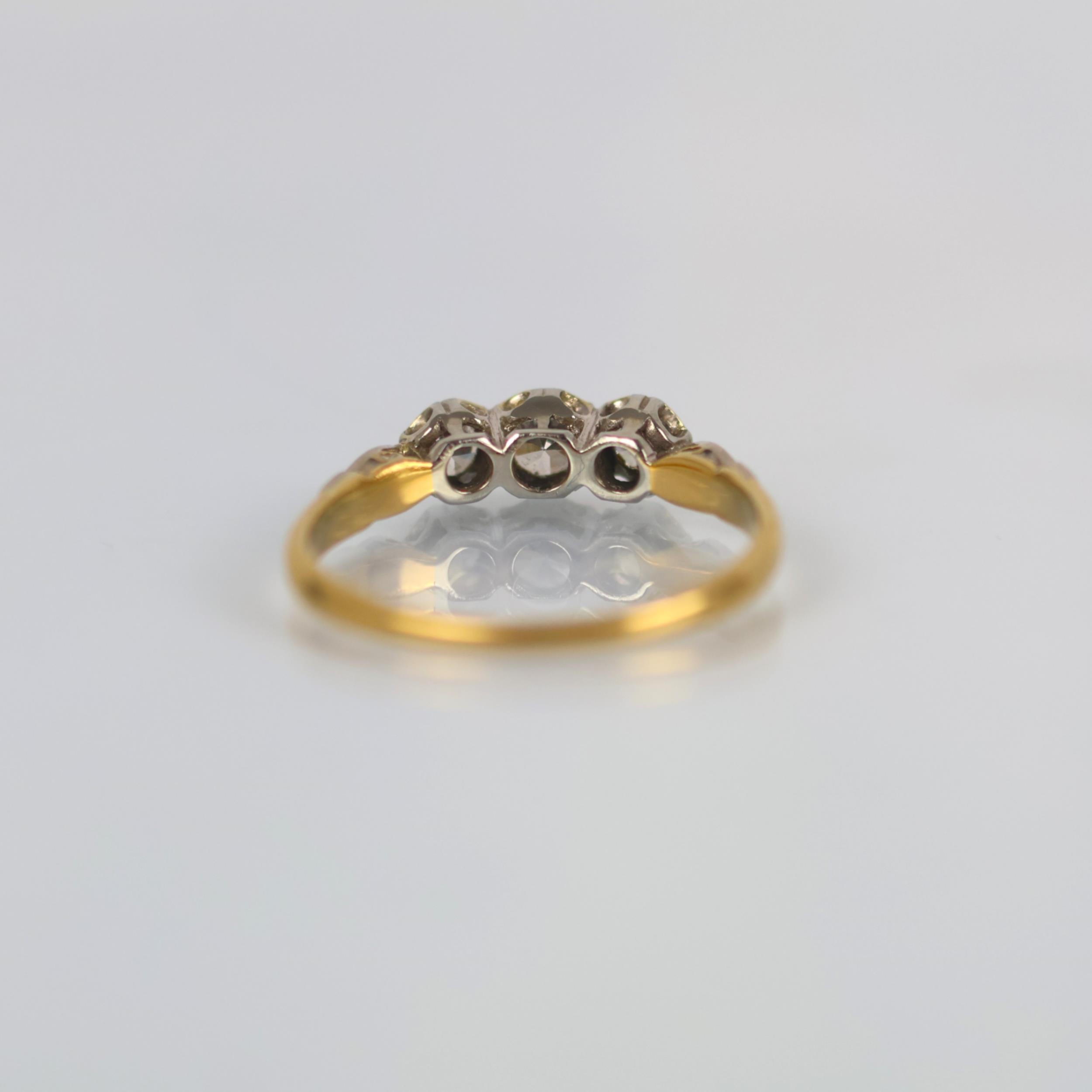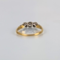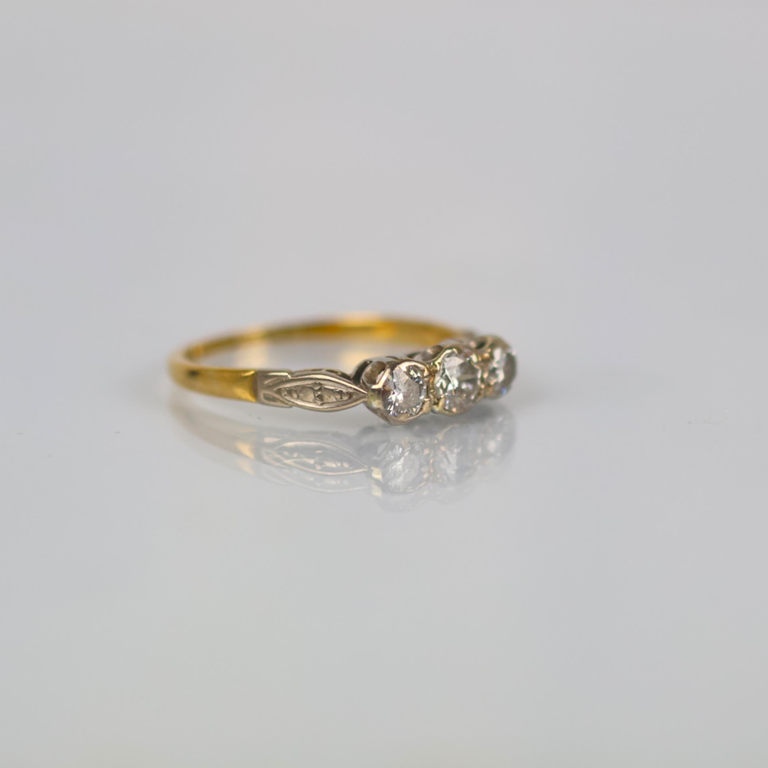 A mid 20th century diamond three stone ring, the central round cut diamond with smaller diamond to each side, set in white metal leading to plain polished yellow metal shank, indistinctly marked, ring size O1/2, 2.3gms, total diamond weight estimated 0.40ct