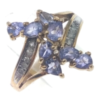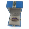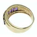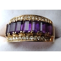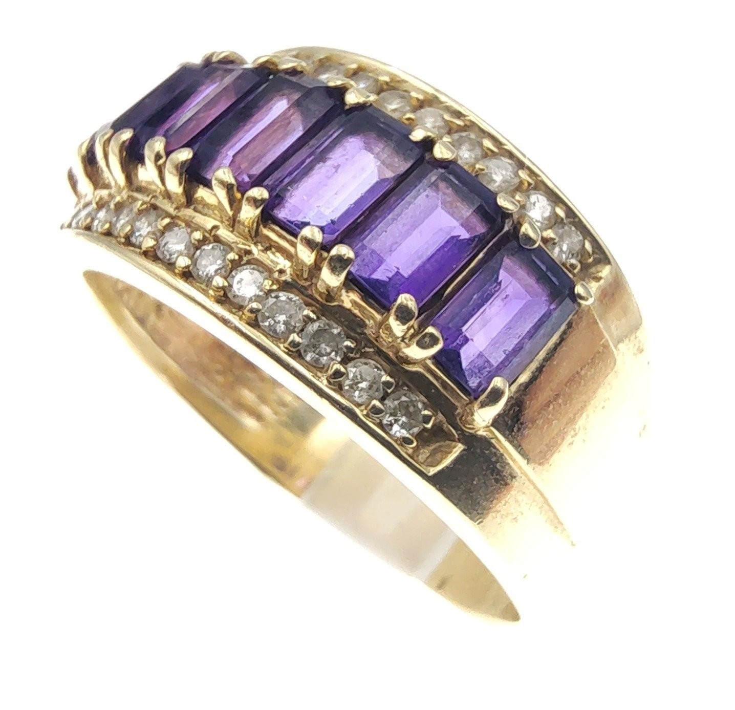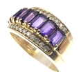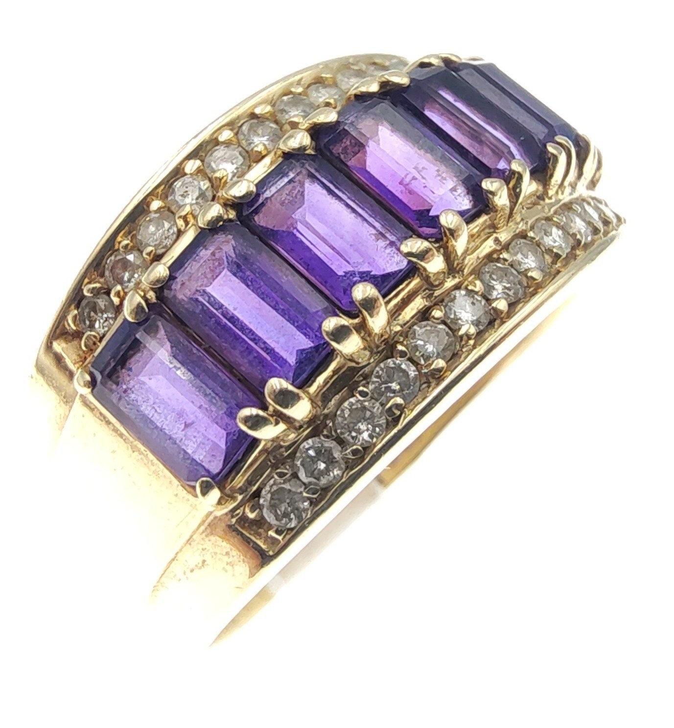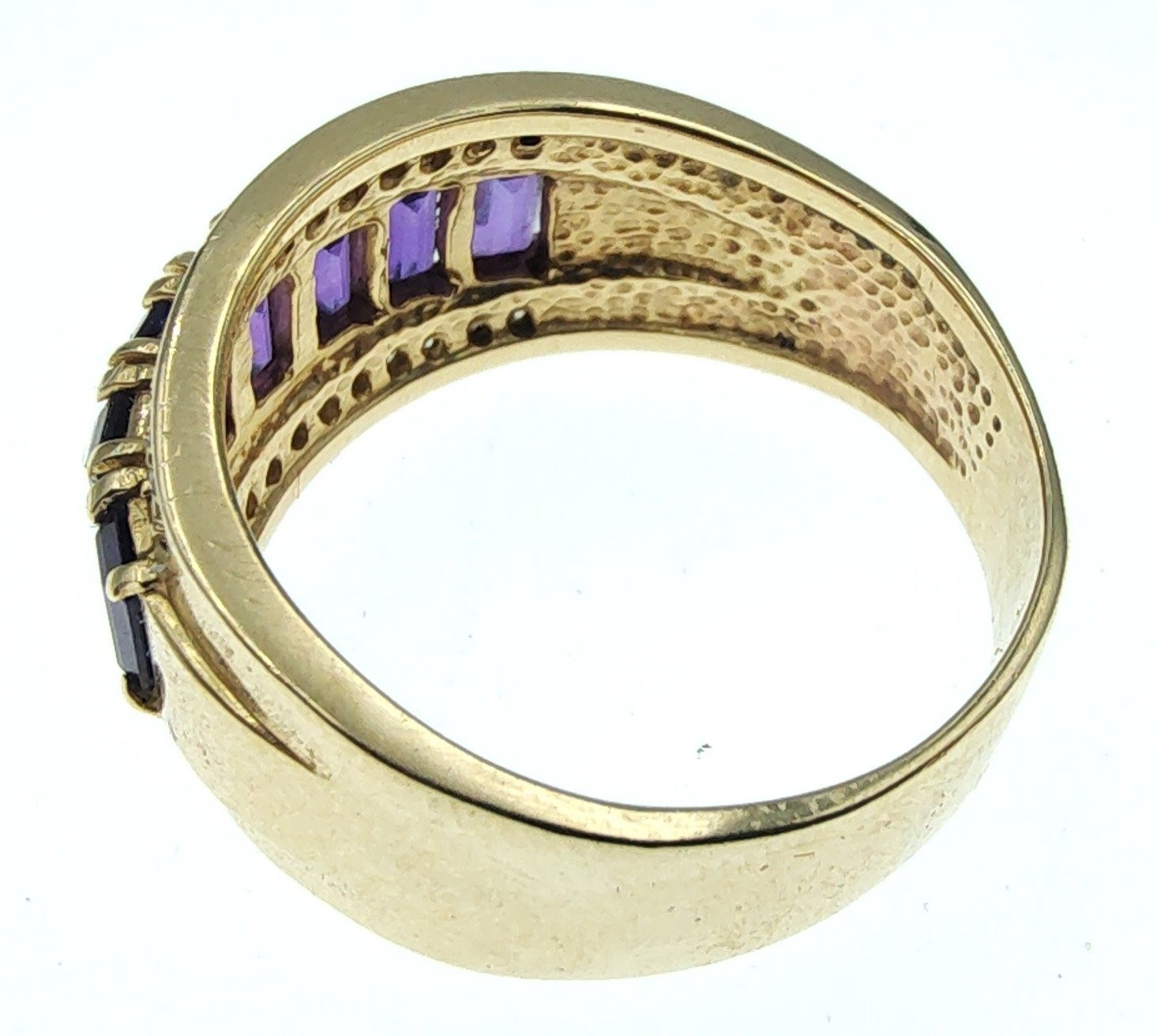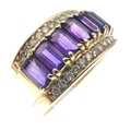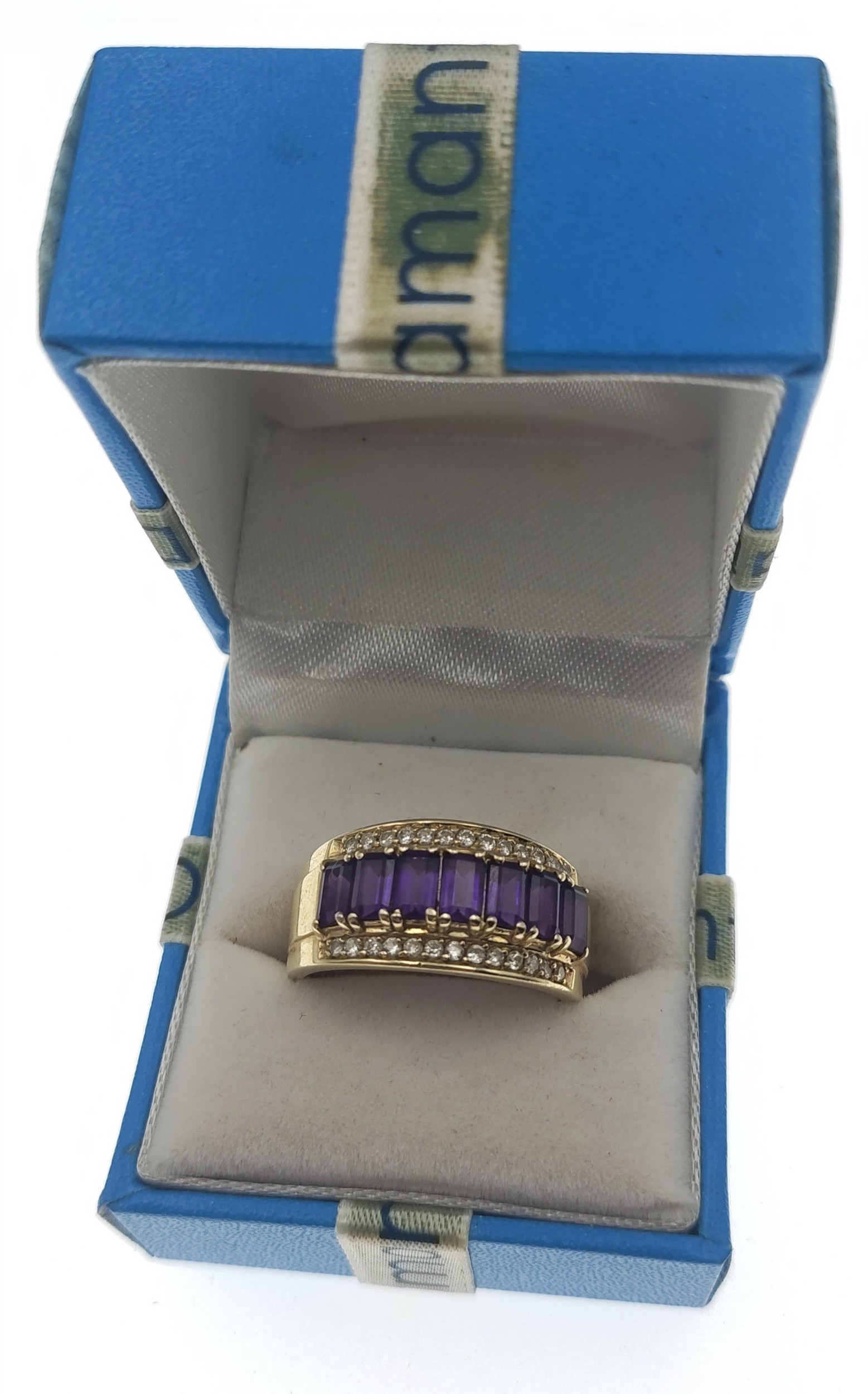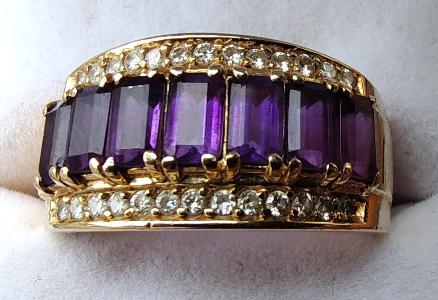 Lovely unmarked yellow metal ring (purchased in America and tests as 14ct) with seven Amethyst stones with 26 small diamond (tested) highlights. Size U Gross weight 8.5g approx.