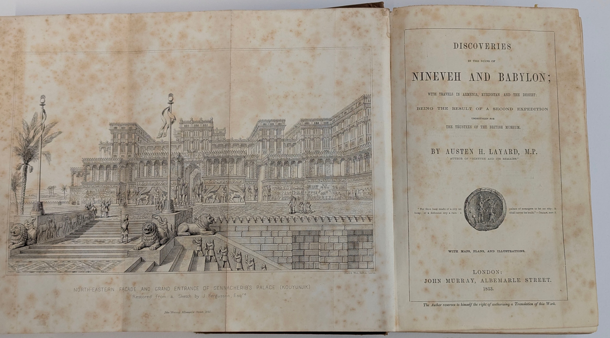 ARCHAEOLOGY. A rare book. LAYARD, Austen H., 'Discoveries in the Ruins of Nineveh and Babylon with Travels in Armenia, Kurdistan and the Desert', 'with Maps Plans and illustrations', Murray, 1853. In sound condition. With most fold-outs, we understand. There is a note of details in bookseller's hand. A/F.