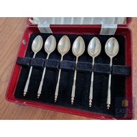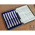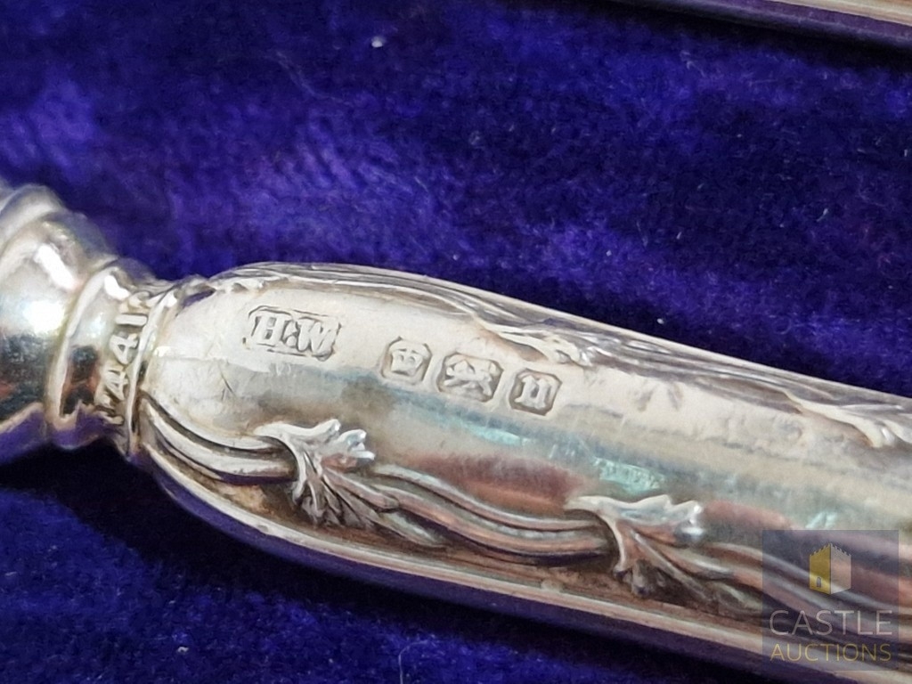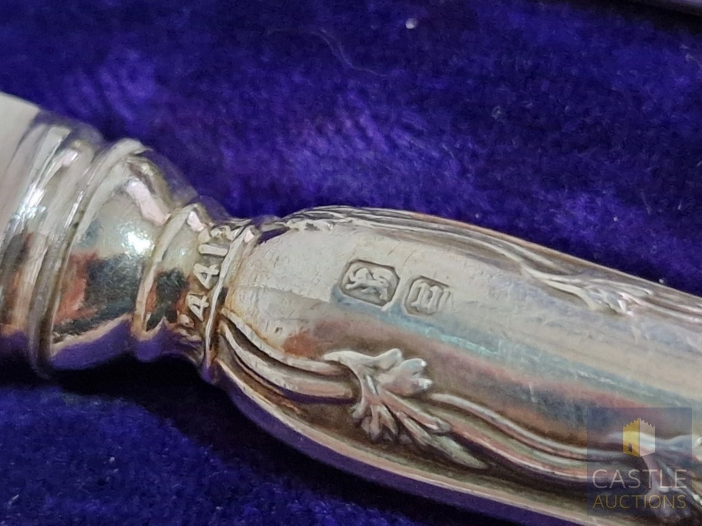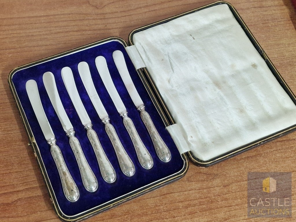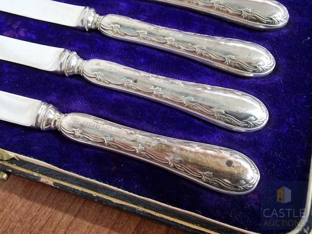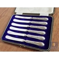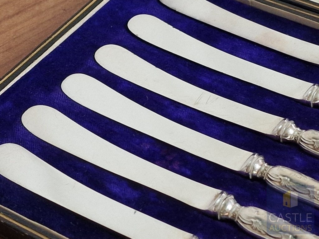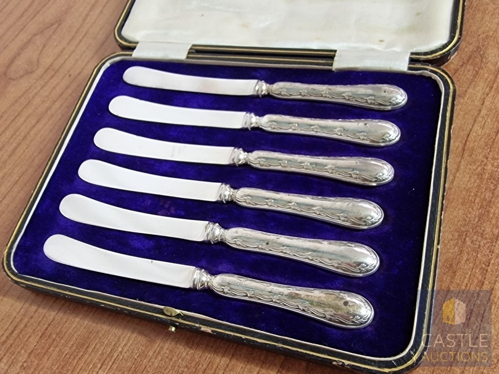 Set of 6 x Antique Sterling Silver Butter Knives with Decorative Handles, (Approx. L: 16.5cm, Total Weight 120g, Believed to be Sheffield, Circa 1912, by Makers 'Henry Wigfull'), in a Fitted Presentation Case