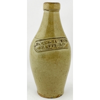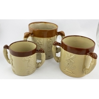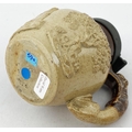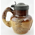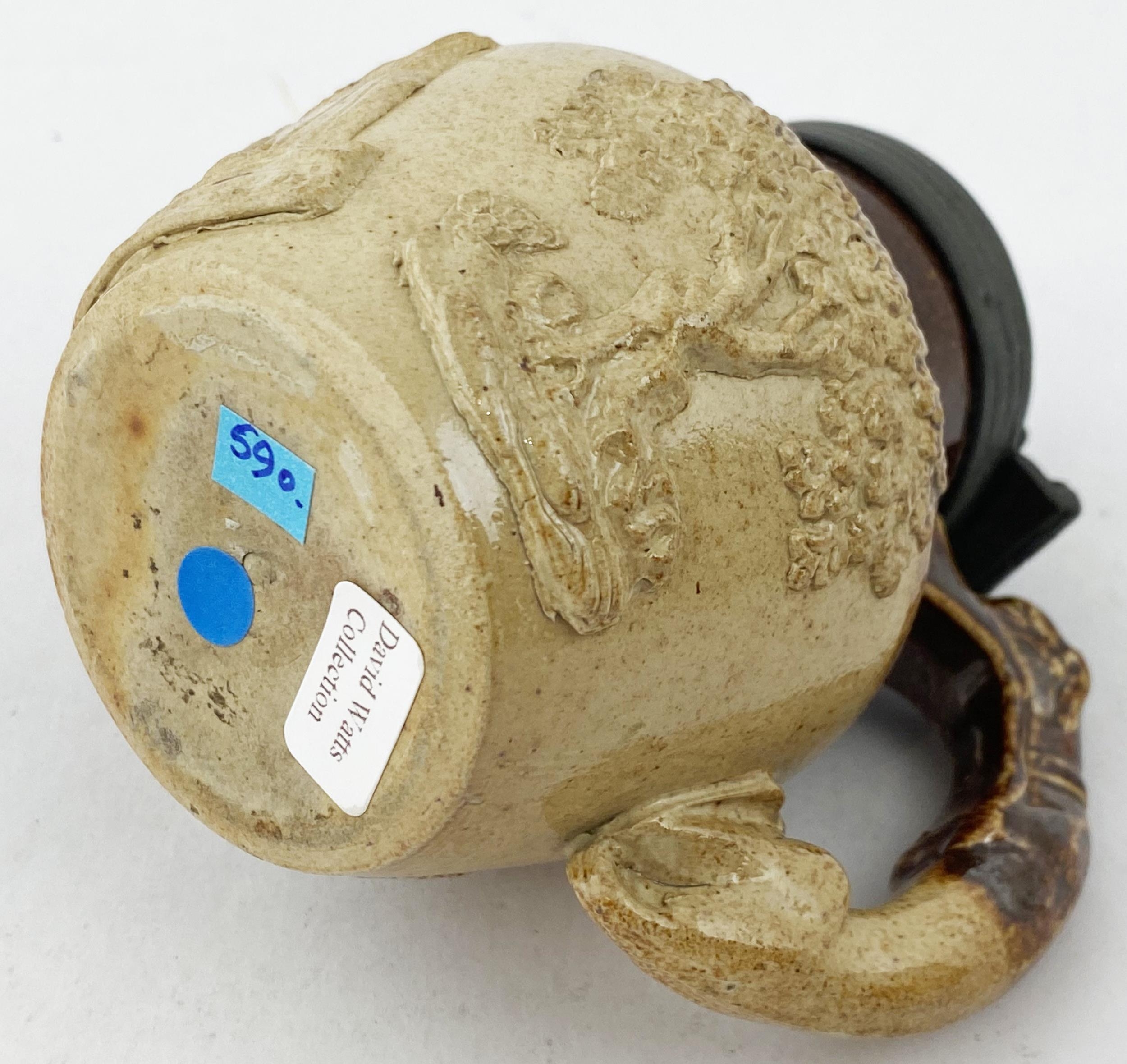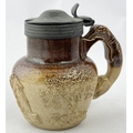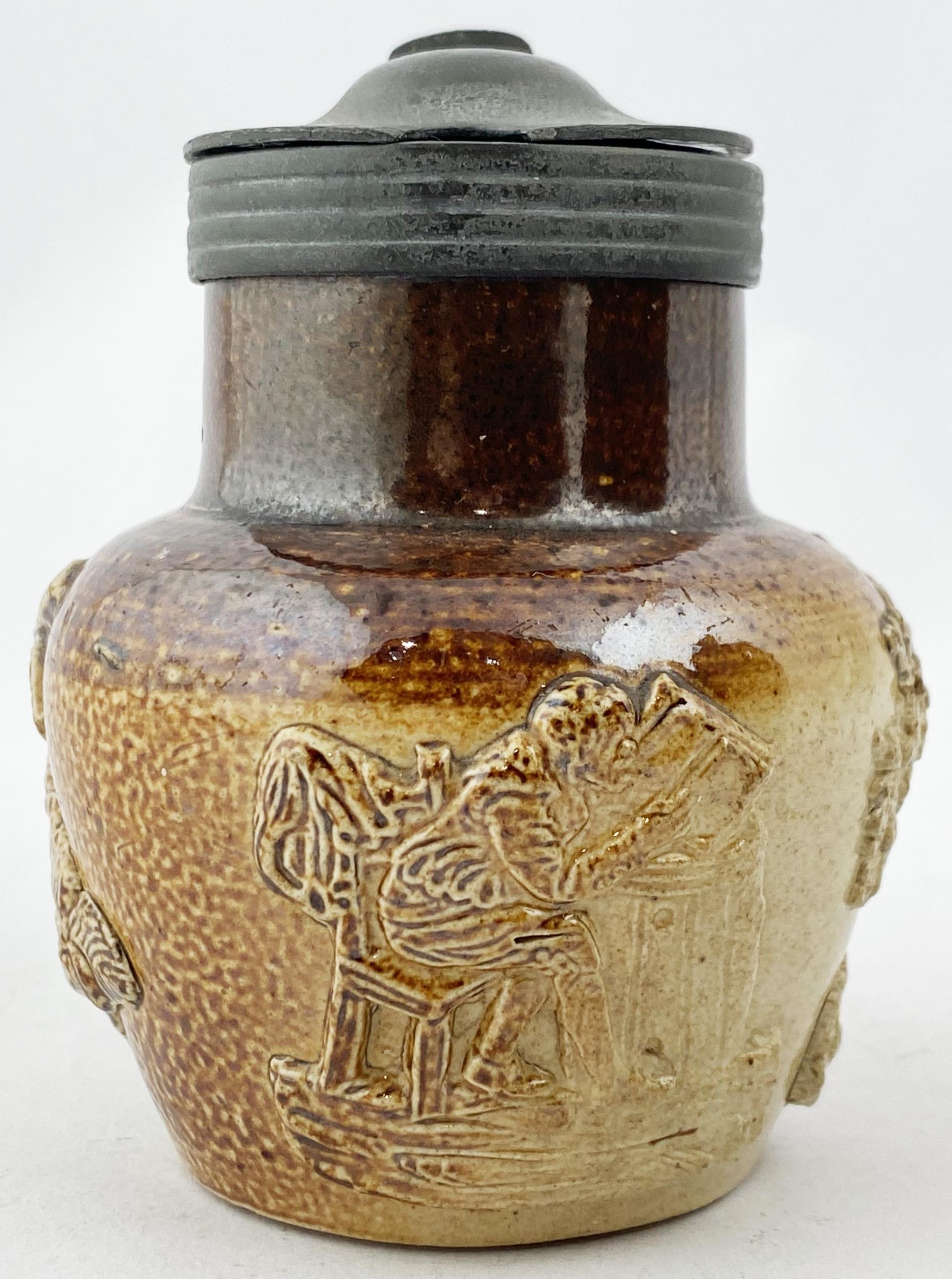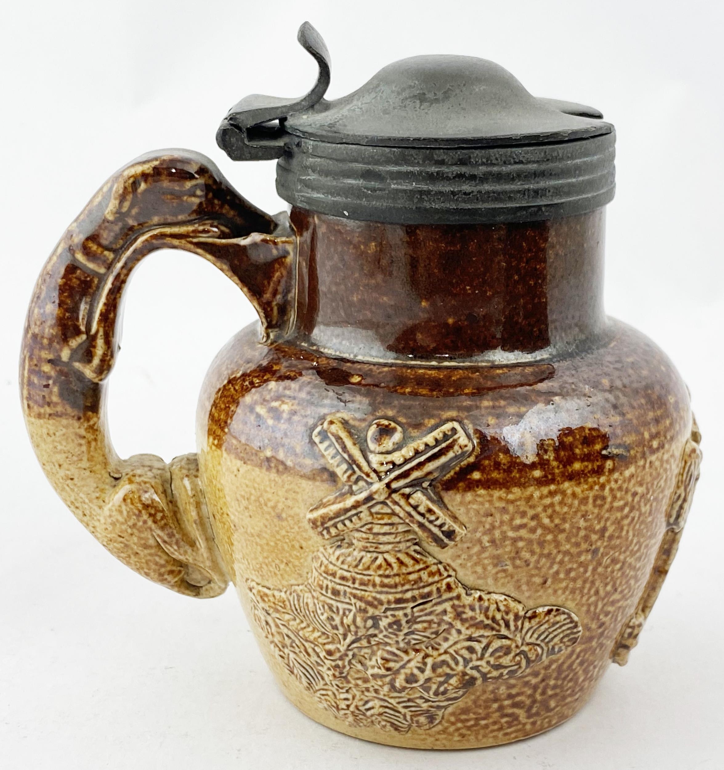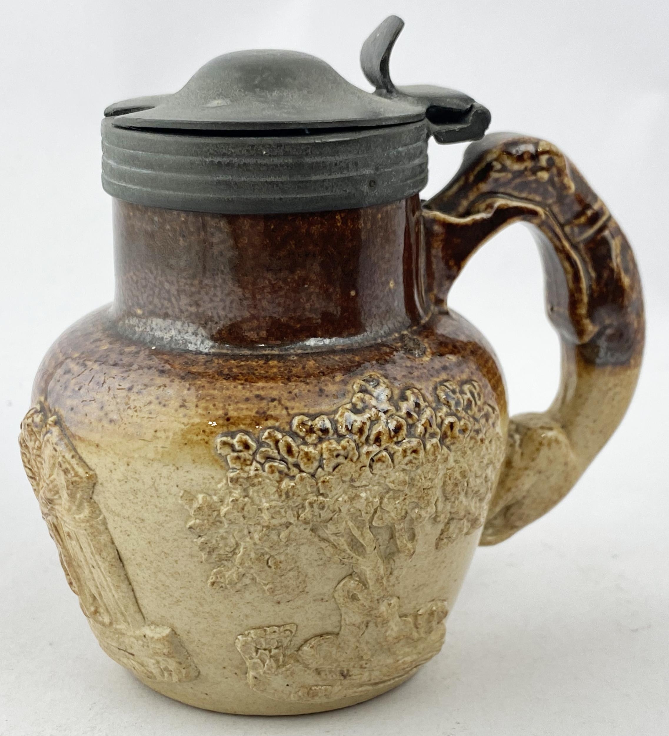 SALT GLAZED JUG. 3.6ins tall. A truly delightful small size sprigged t.t. salt glazed jug with pewter lid,very well modelled trio of sprigs (they barely fit!), greyhound handle