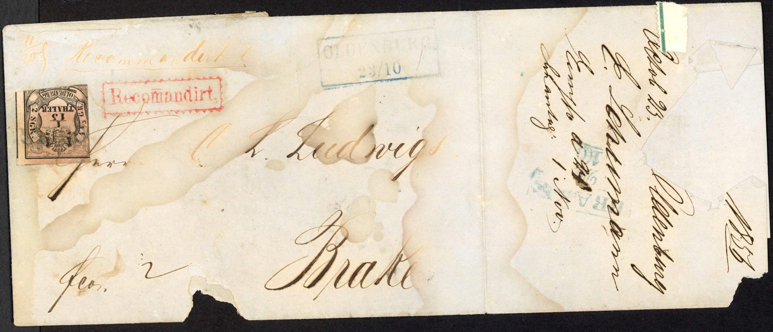 OLDENBURG 1/15th THALER: imperf. two margin on wrapper to Brake; faded boxed blue 'OLDENBURG 23/10', an arrival 'BRAKE 24/10' and a red boxed 'RECOMMAMDIRT' cachet. Appearance of water damage, otherwise fair for age.