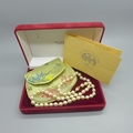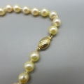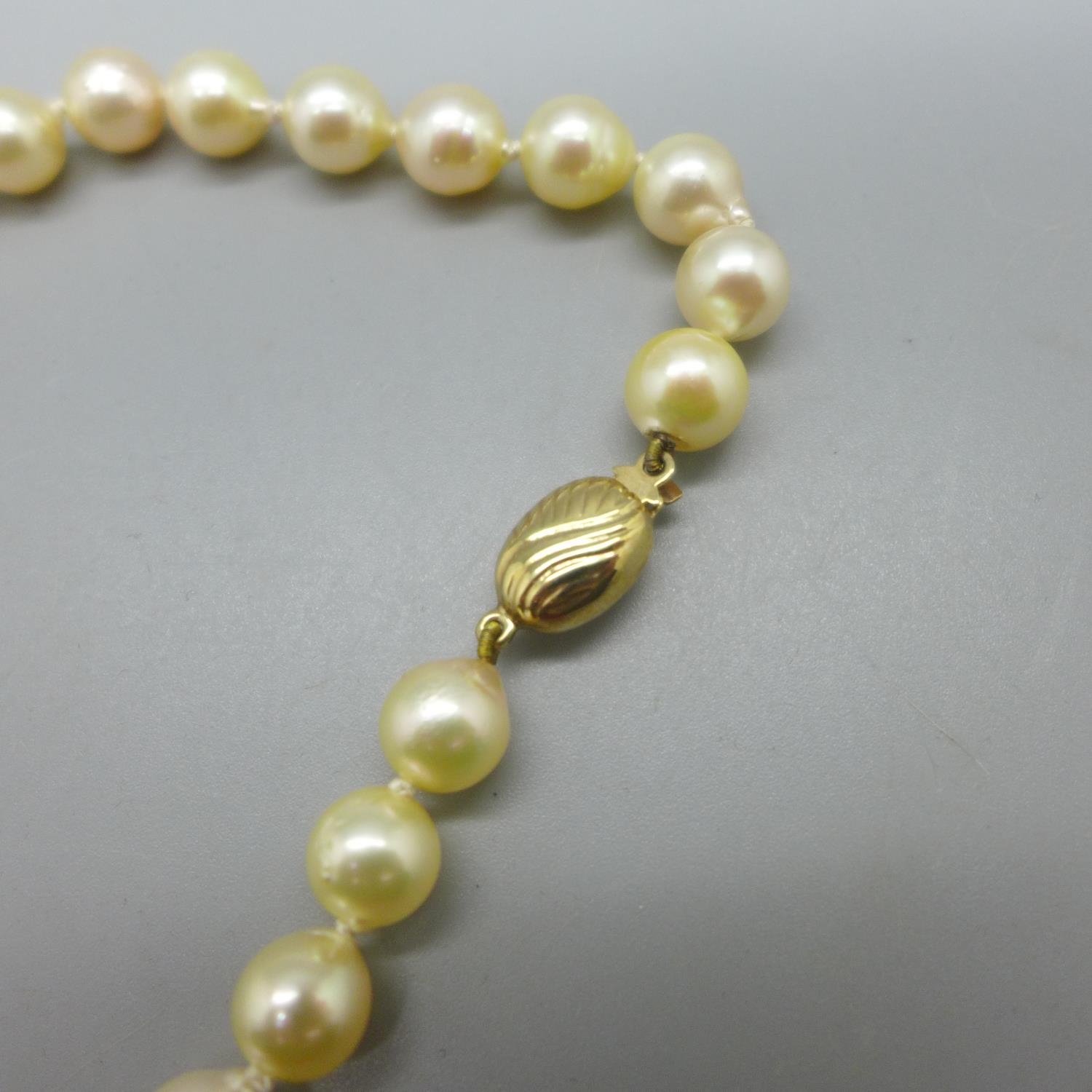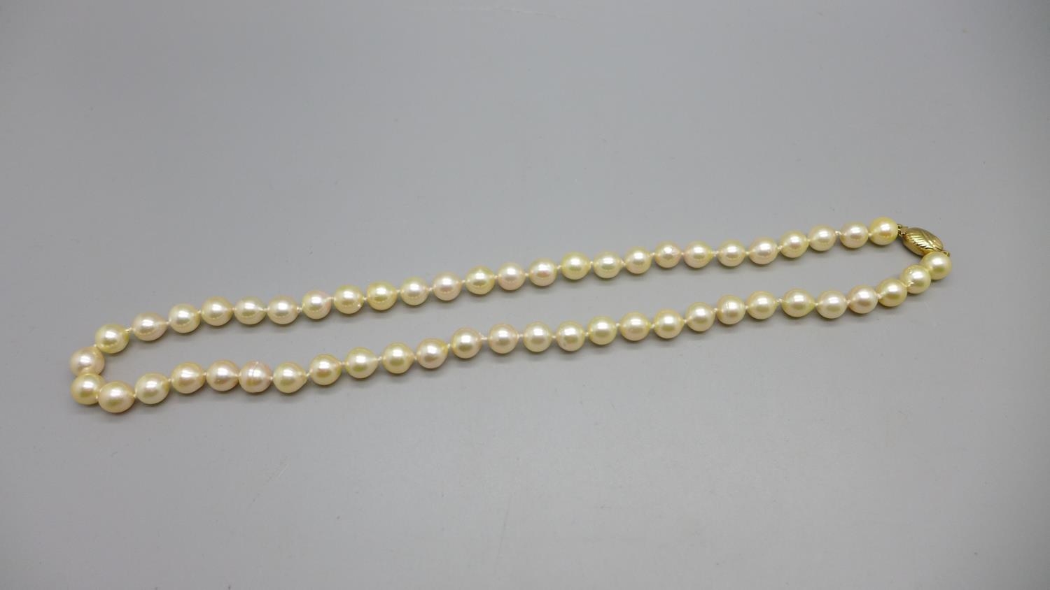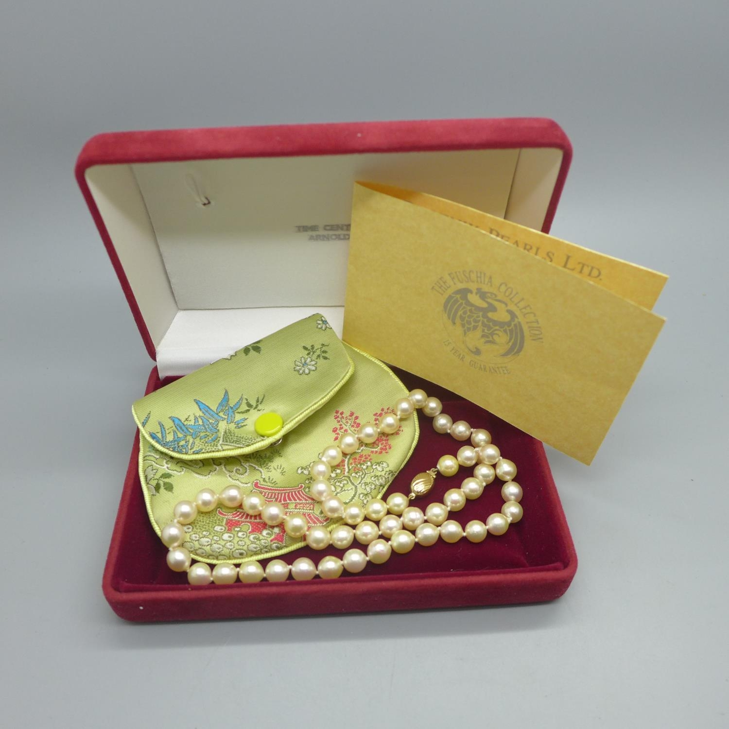 A cultured pearl necklace with 9ct gold clasp, with original gift bag and box