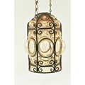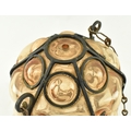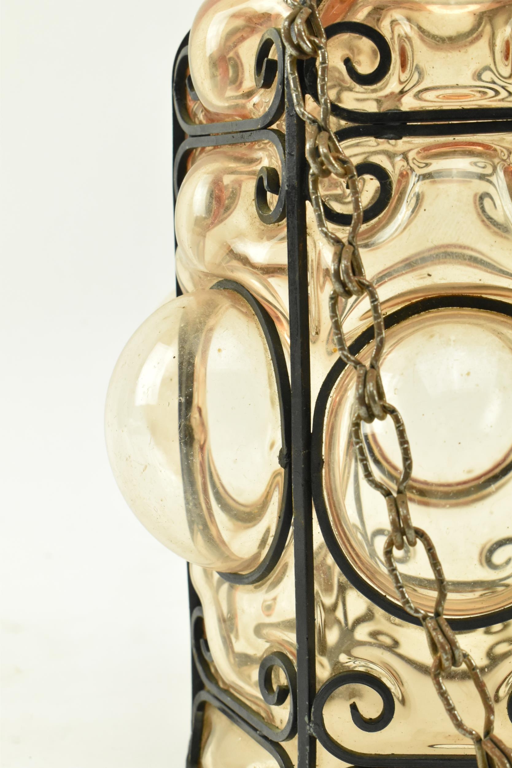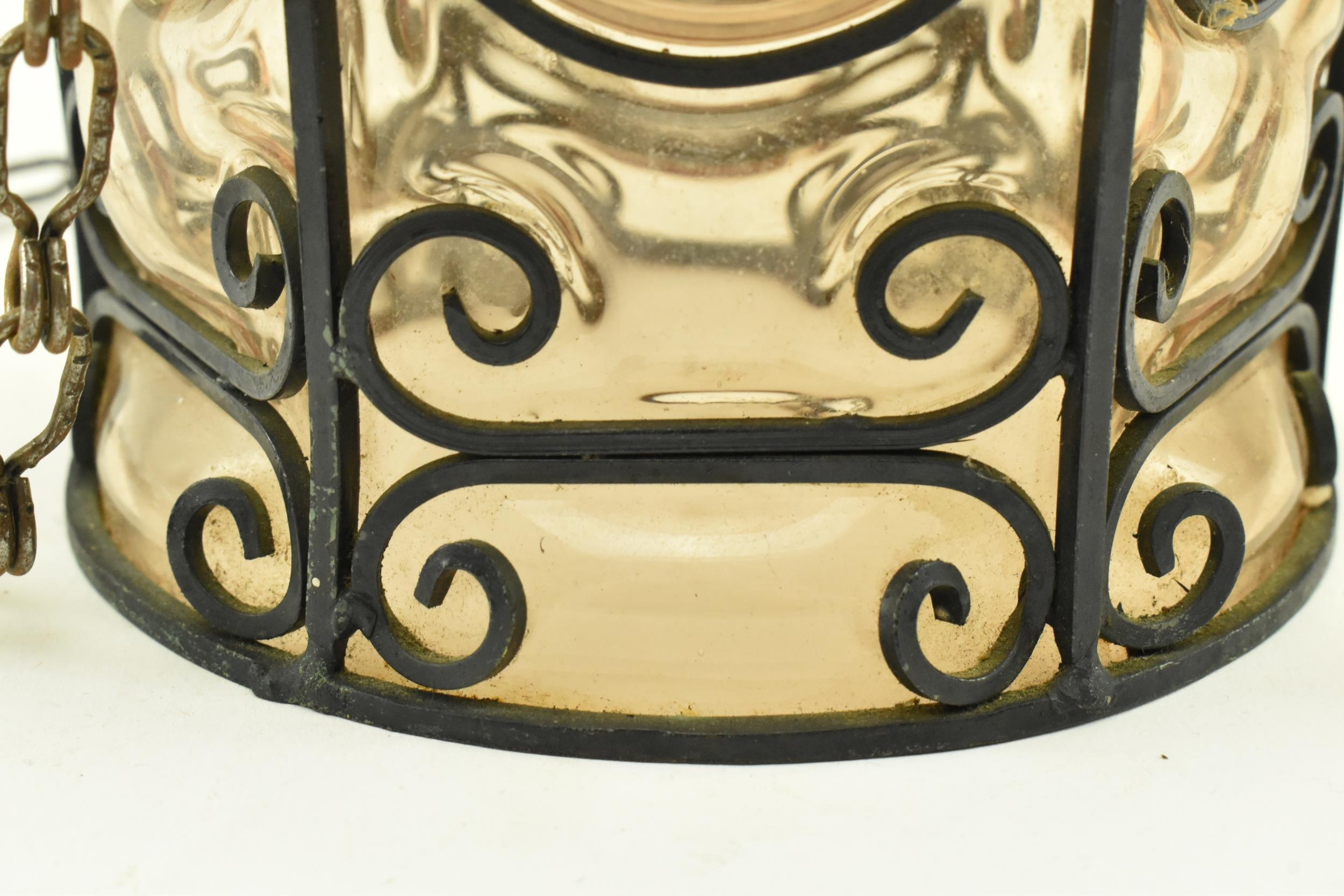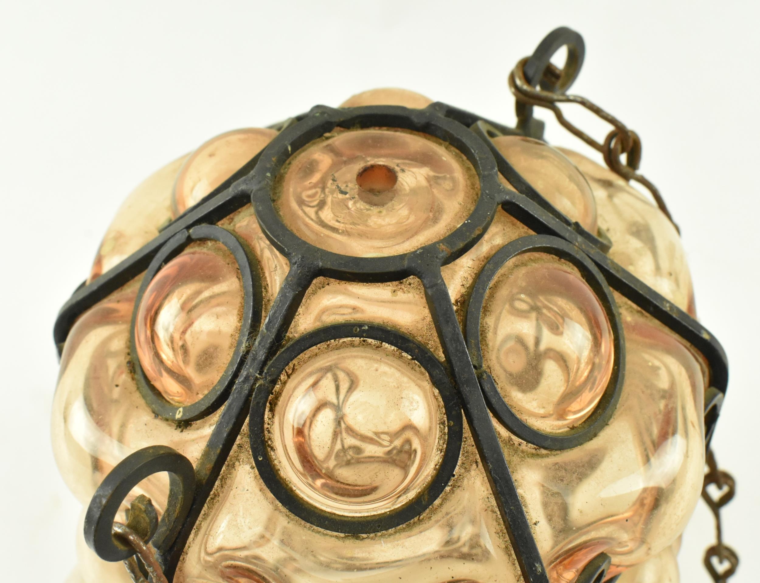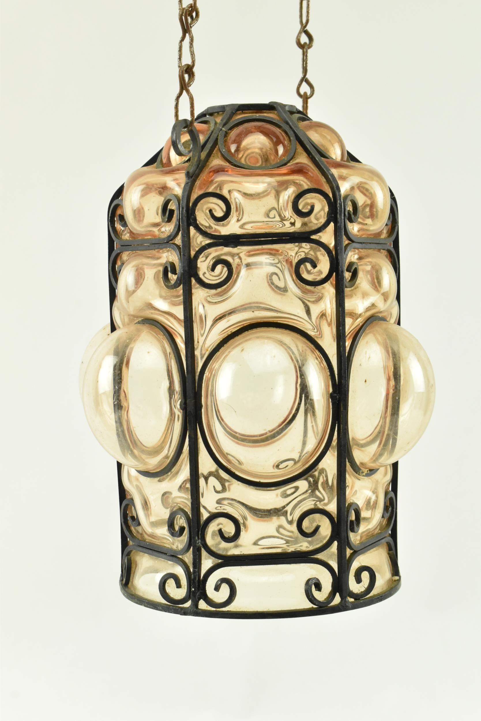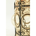 A French inspired early 20th century amber hand blown glass bubble porch lantern light. The lantern having a metal wirework around the blown glass shade. The shade being of amber colour. Measures approx. 23cm tall x 14cm diameter.