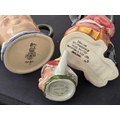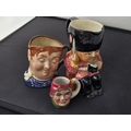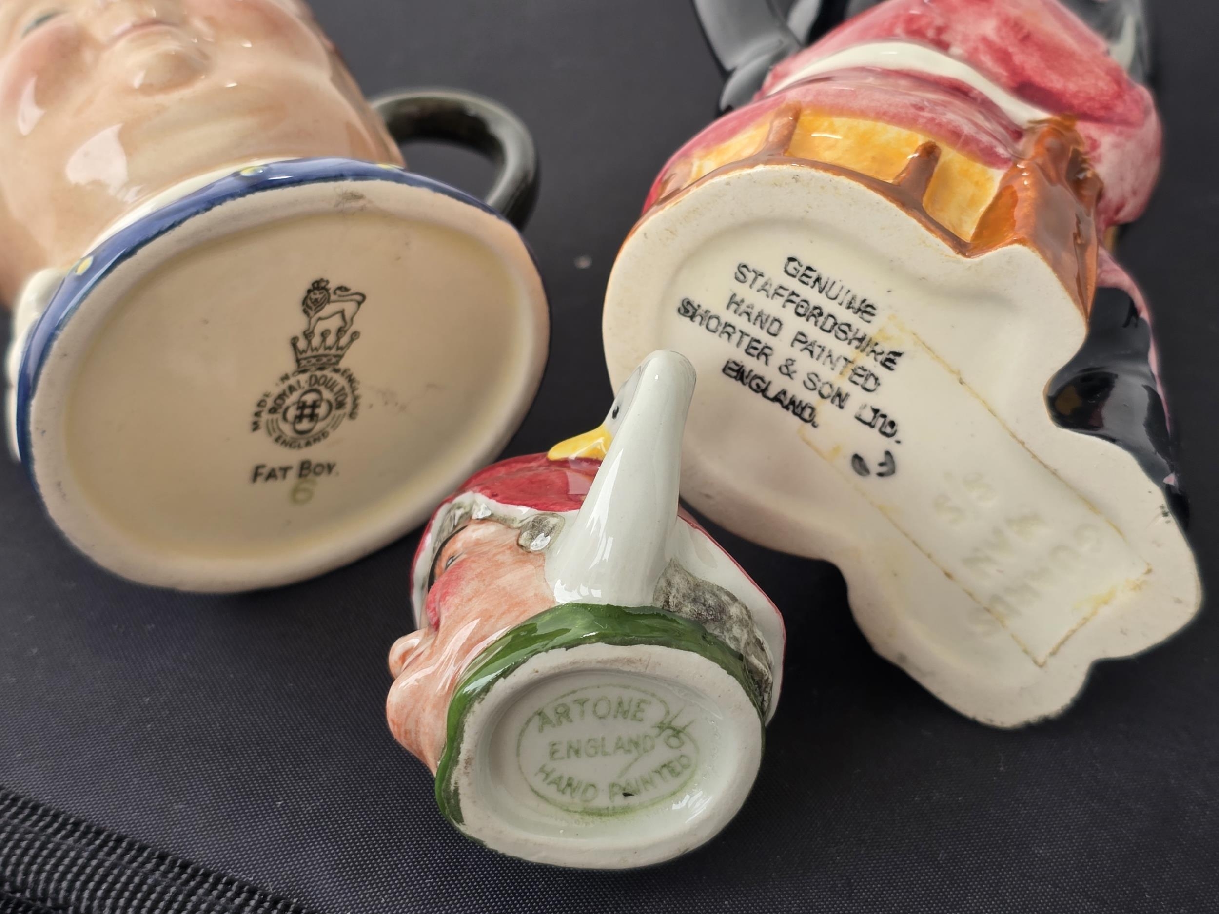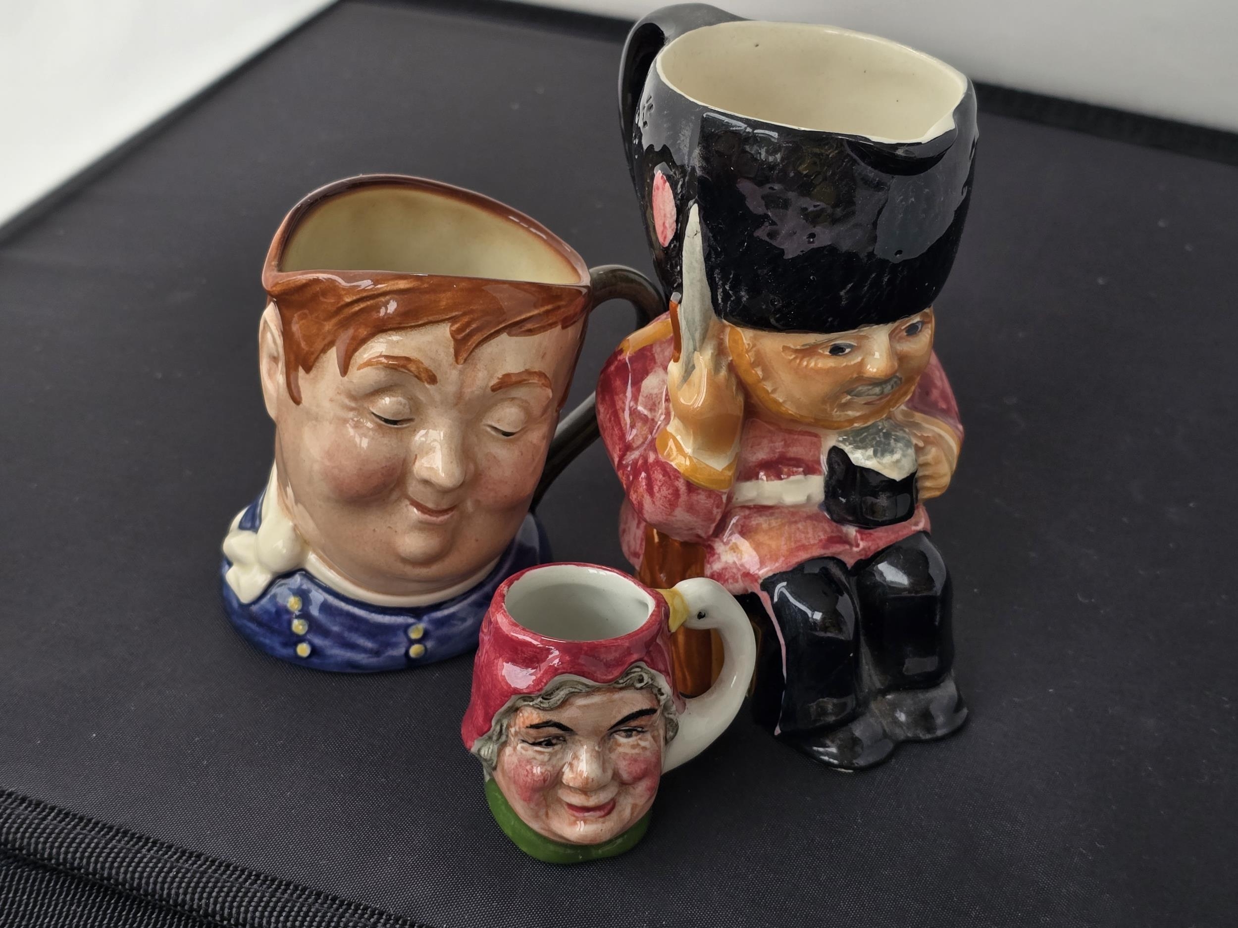 Toby Jug & two Character Jugs. GuardsMan by Shorter & son Ltd, 12cms high, Fat Boy by Royal doulton, 8cms high, Artone Woman with swan or goose, 4 1/2 cms high. No chips or cracks.