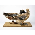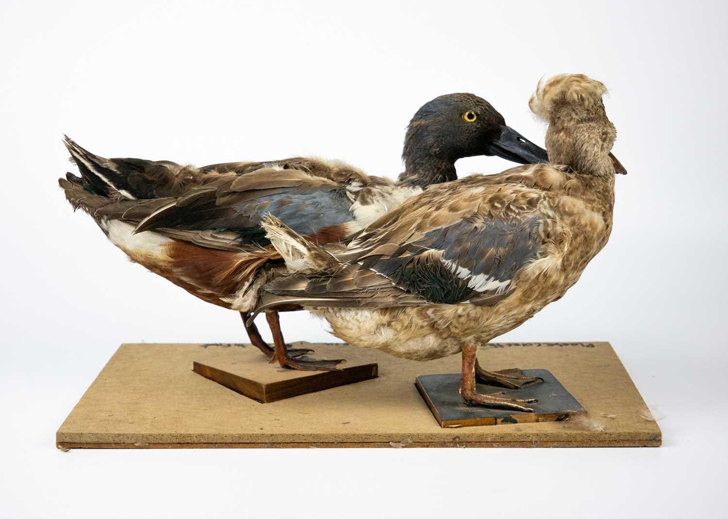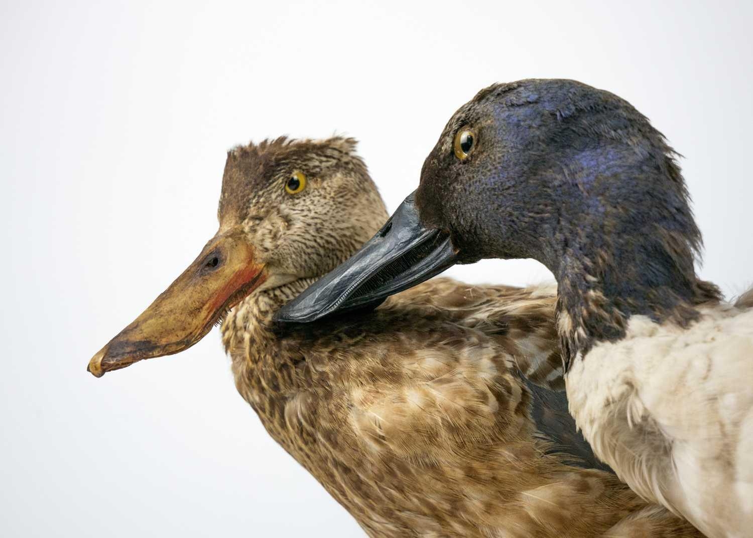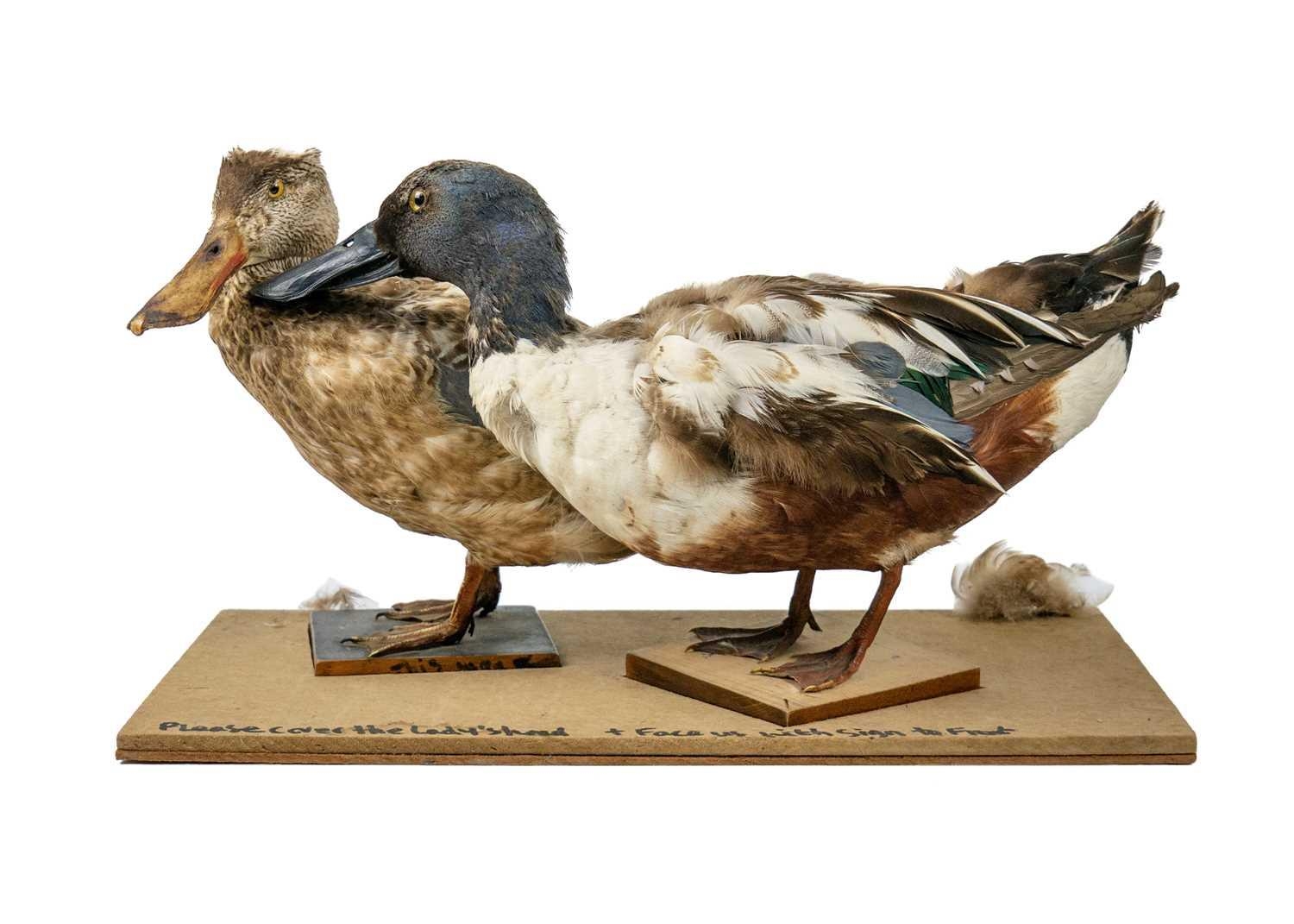A pair of taxidermy shovelers, male and female. Positioned on wooden plinths, 21cm tall including the wooden base, purportedly by Kenny Everett, Wooden case measures 26cm high x 44cm wide x 25cm in depth.