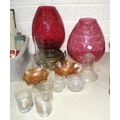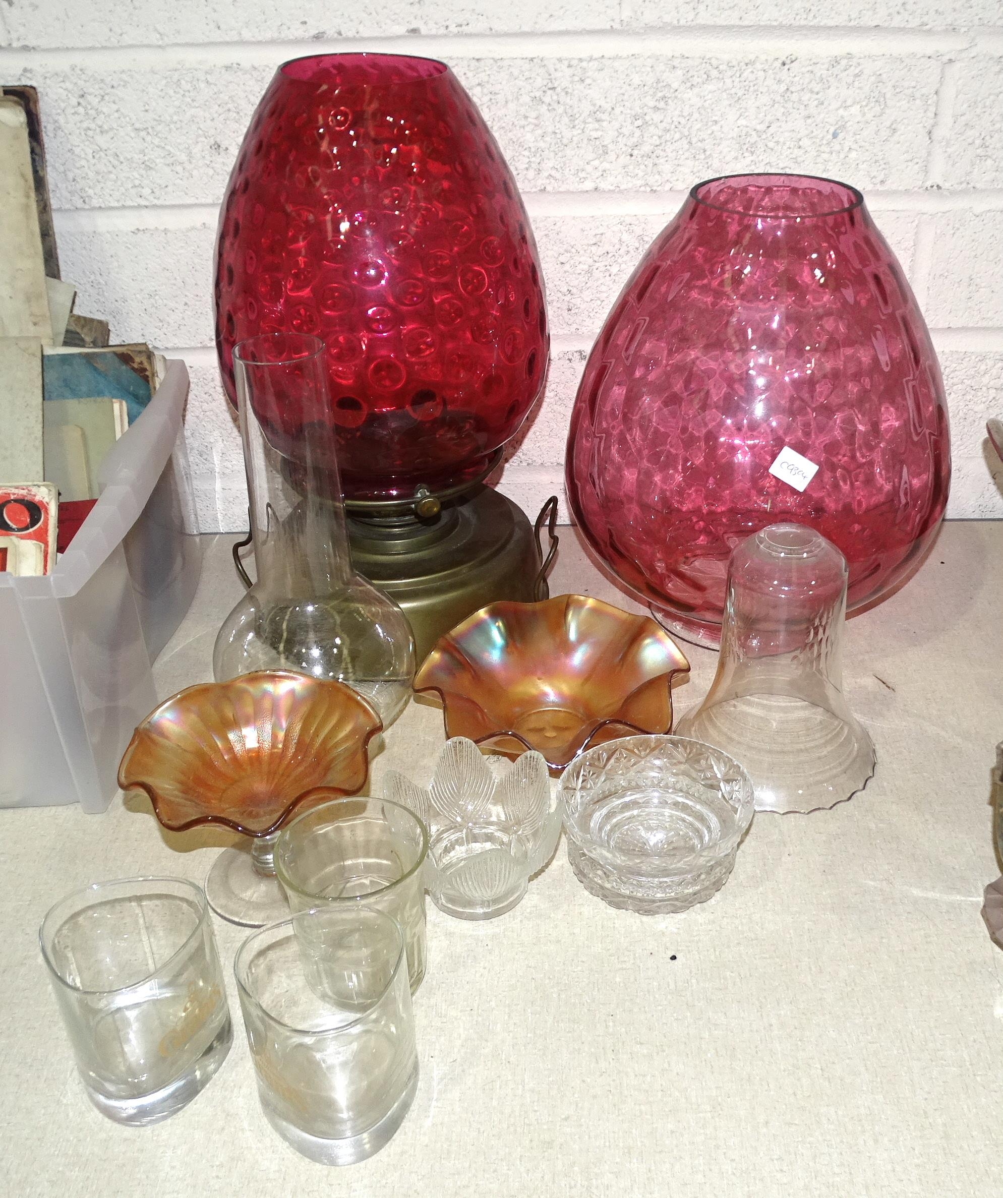 A brass oil lamp with large ruby glass shade, 40cm high overall, another ruby glass shade, 32cm high and other glassware.