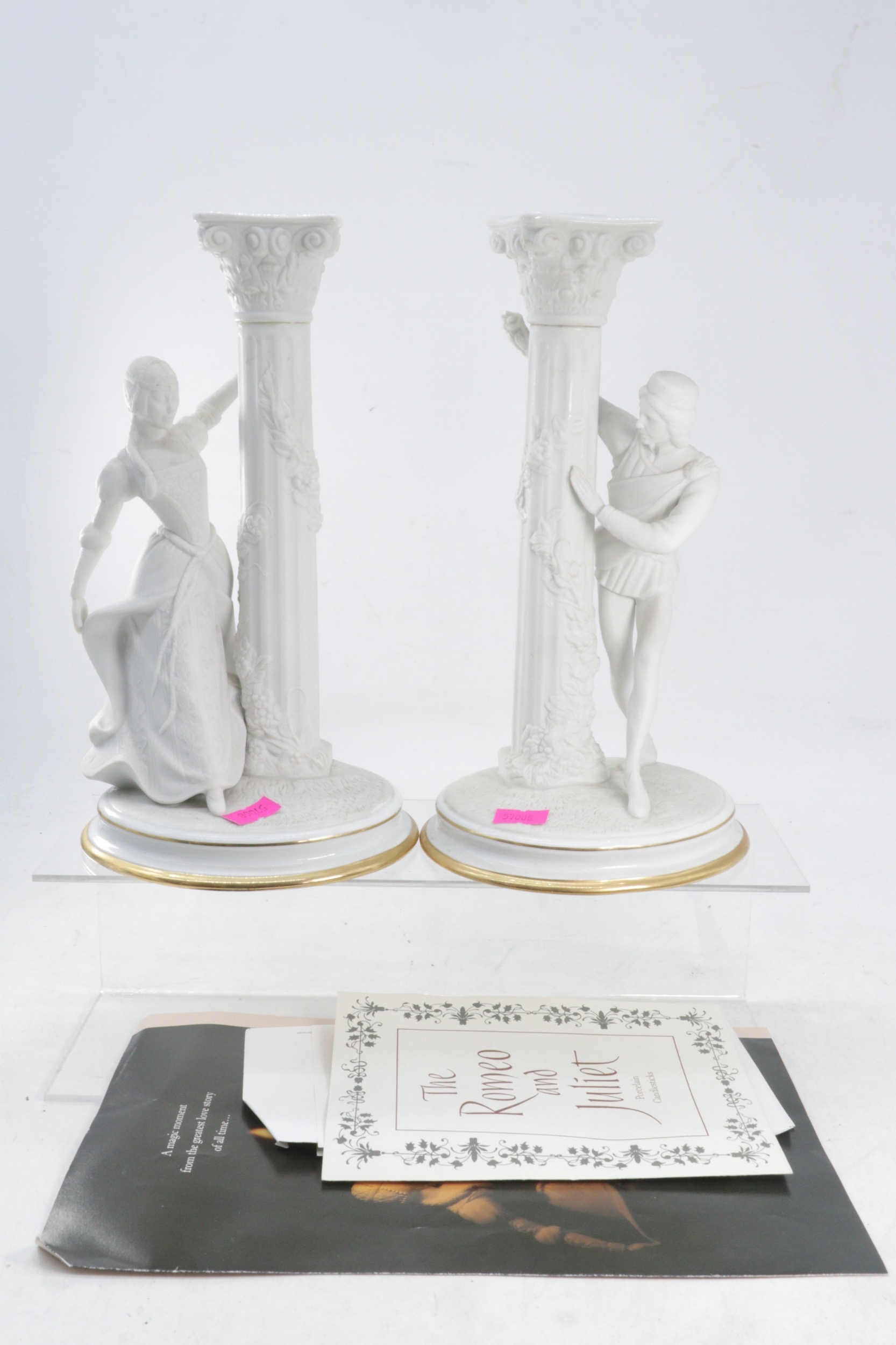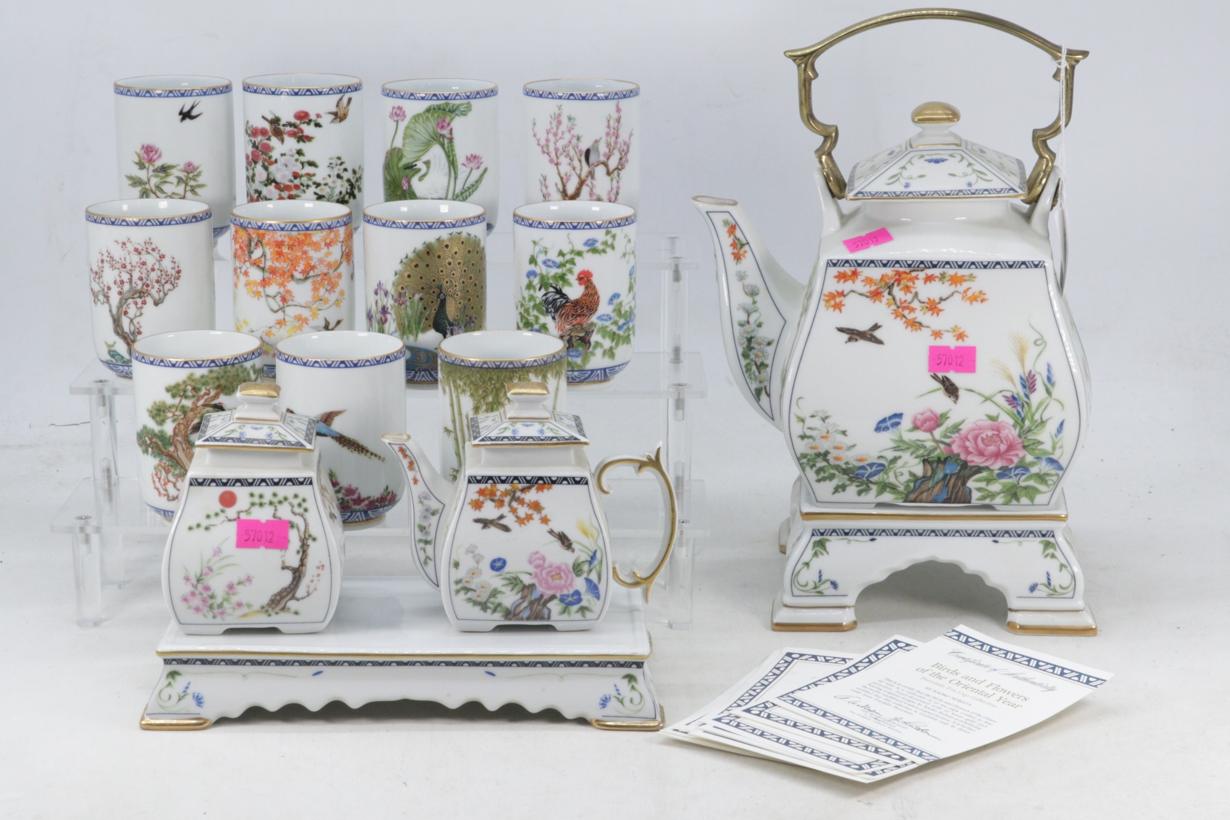 Franklin mint, The Birds and flowers of the Orient tea stand other similar items together with Franklin porcelain miniature plate set with plate rack and certificates, Franklin Mint pair of porcelain candlesticks Romeo and Juliet with certificate