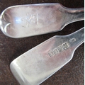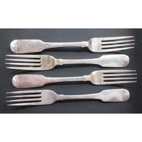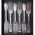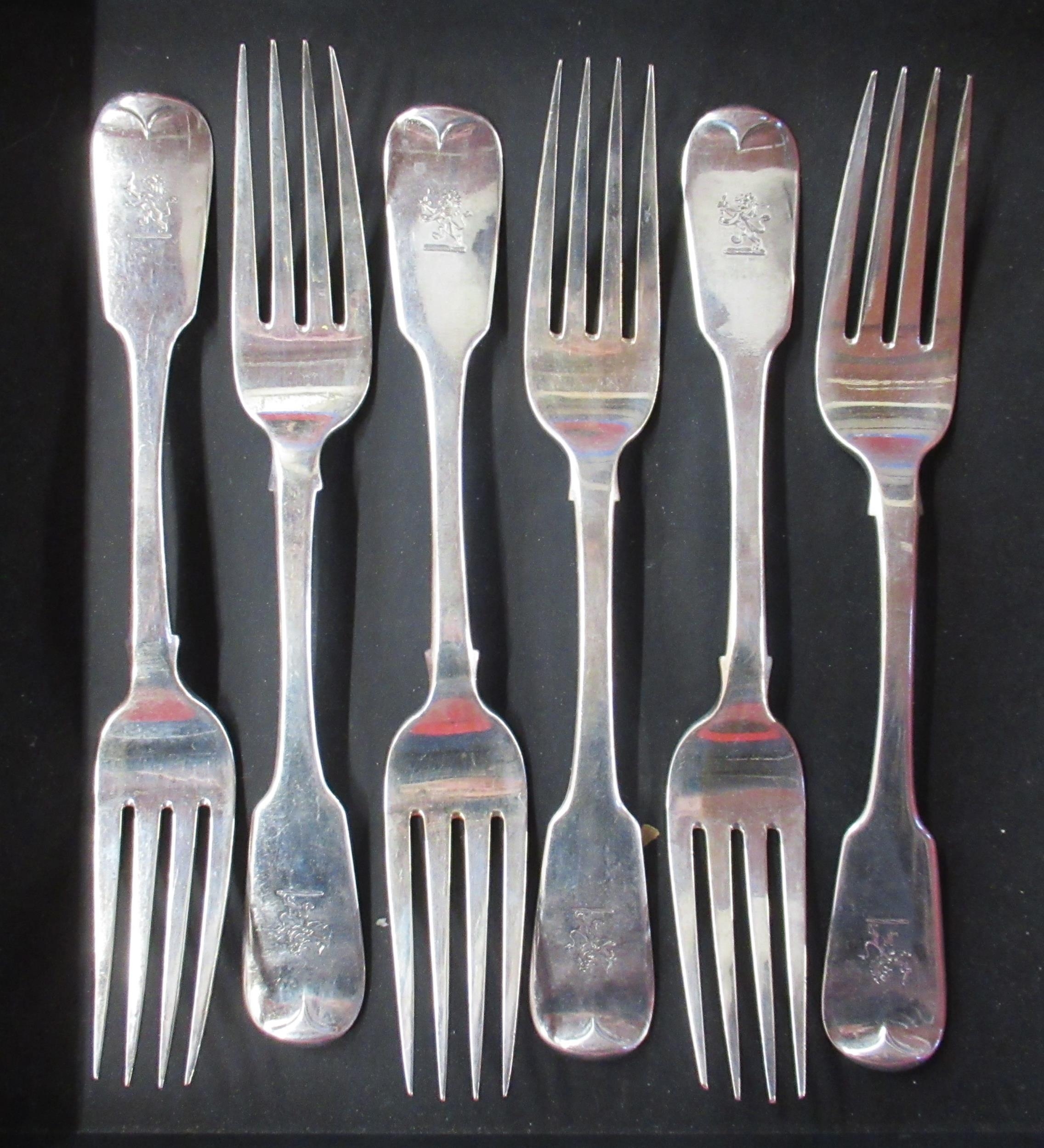 A set of six Georgian Irish silver fiddle pattern dinner forks, engraved with a crest, weight 14oz