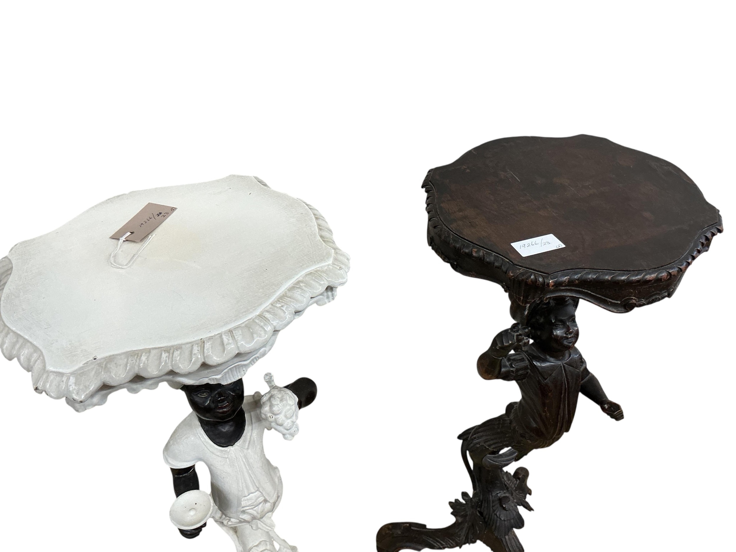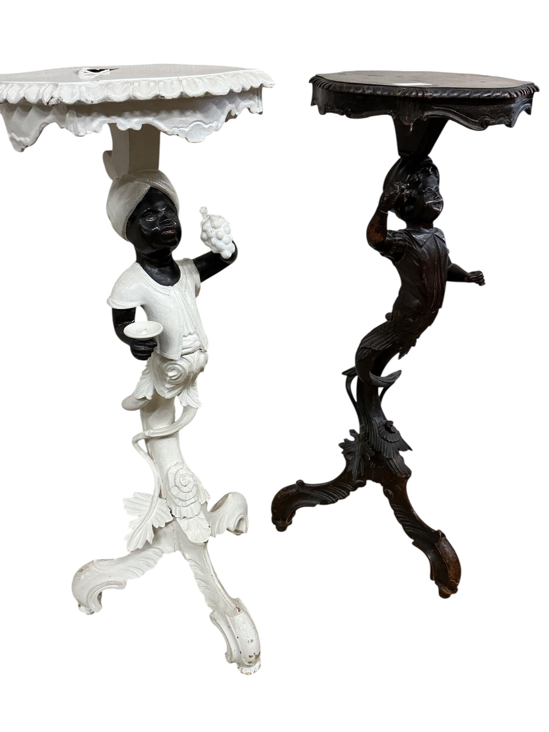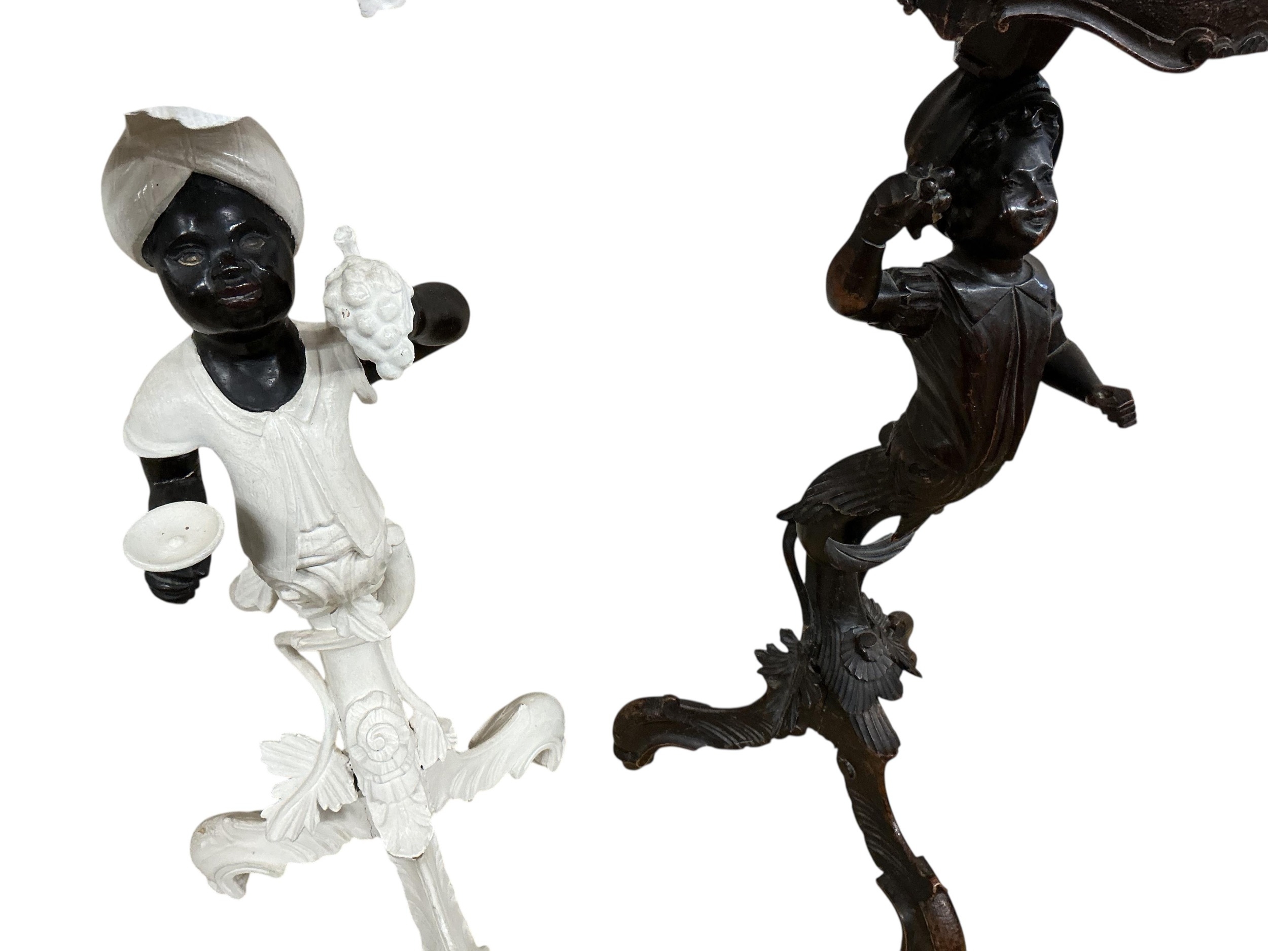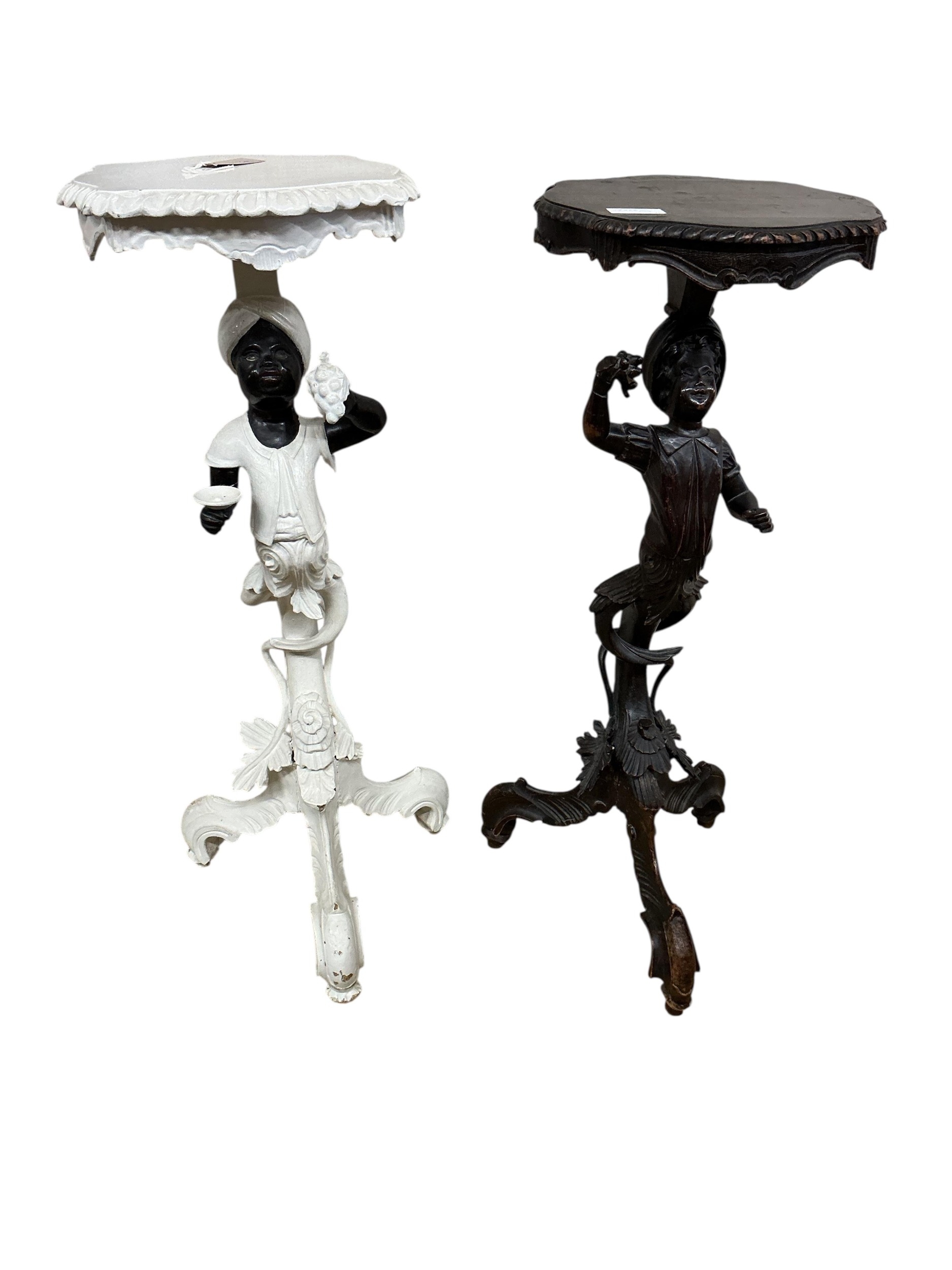 A near pair of Italian carved walnut Blackamoor torcheres, one later painted, larger 94cm