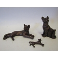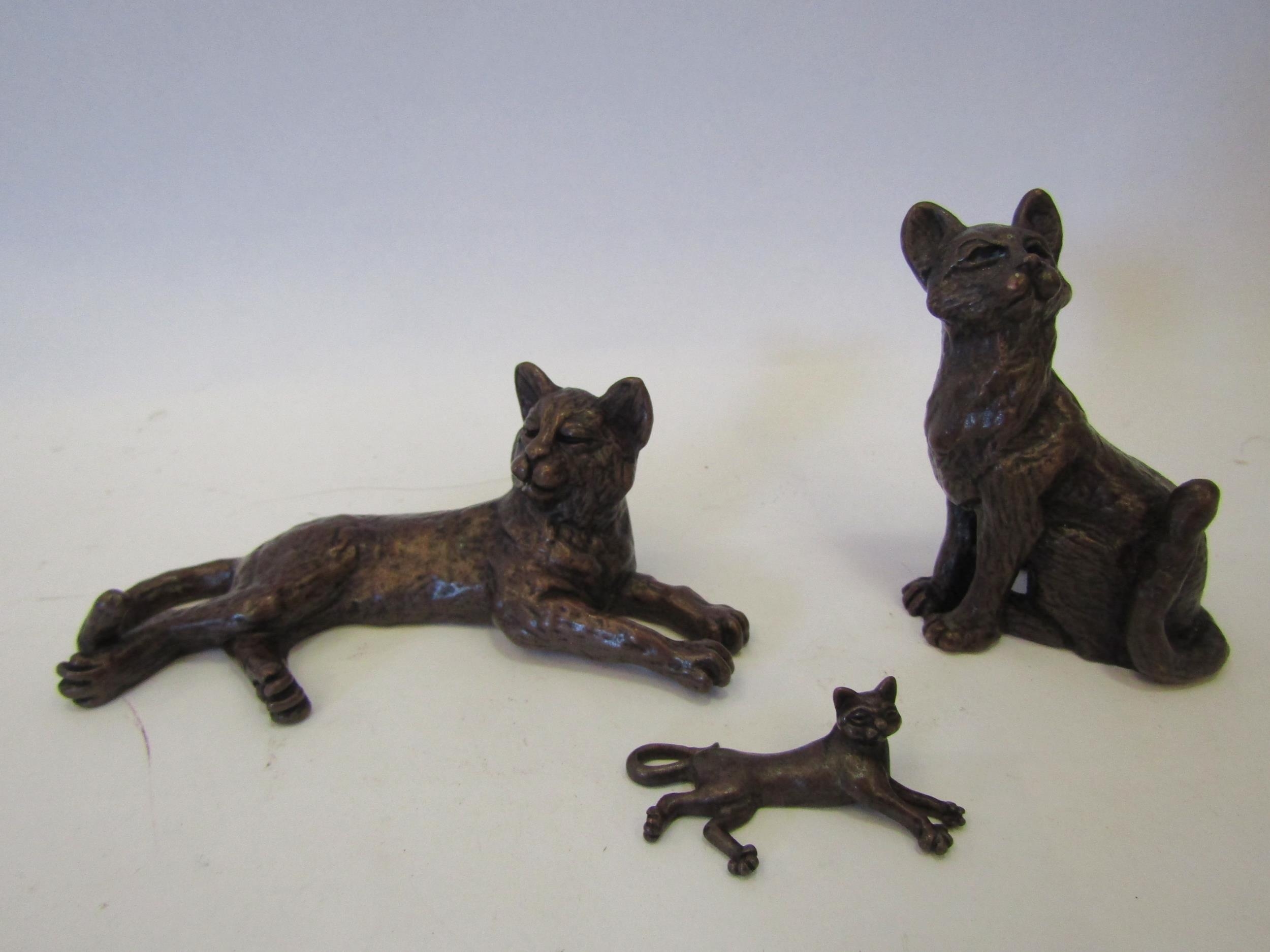 A pair of bronze cat figures by David Meredith, signed D.M., 12cm long, 7cm tall, and a miniature bronze cat (3)