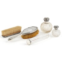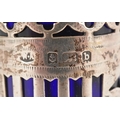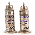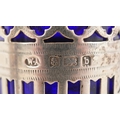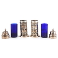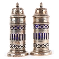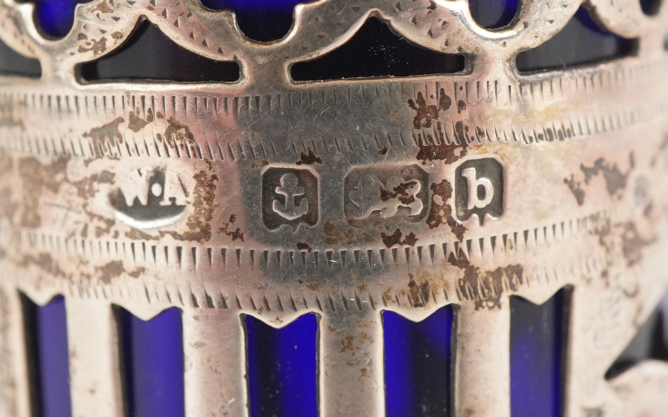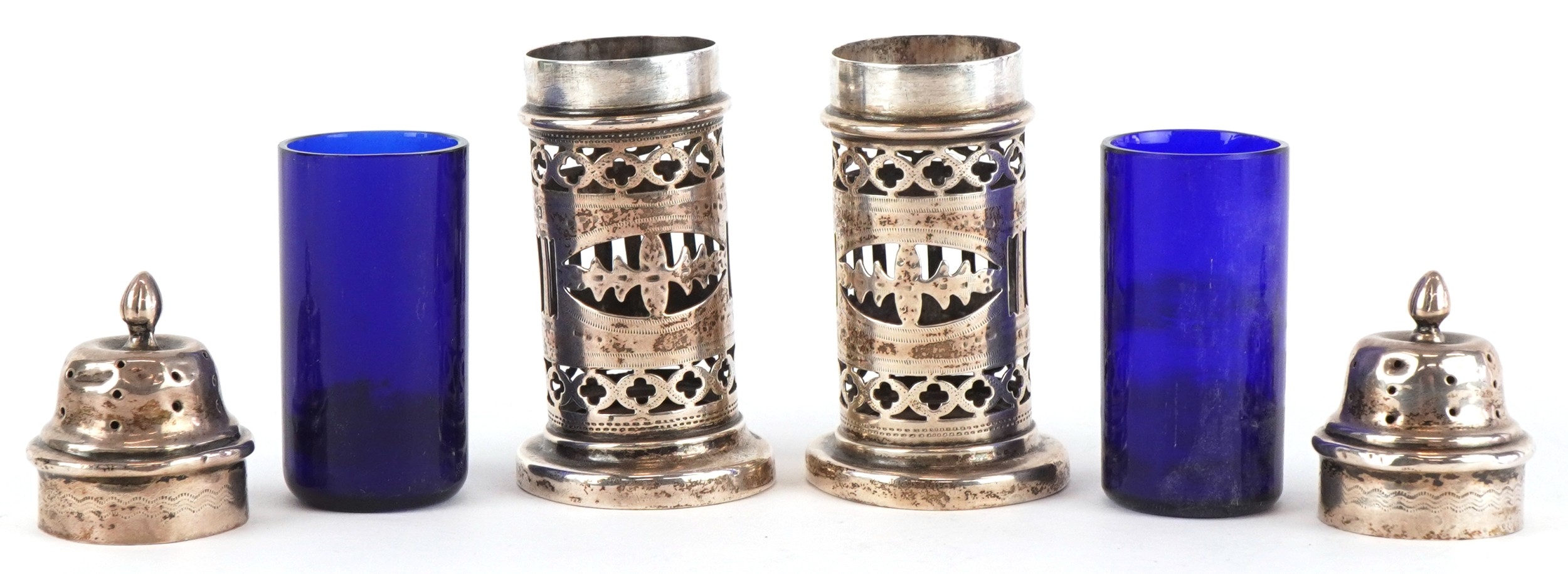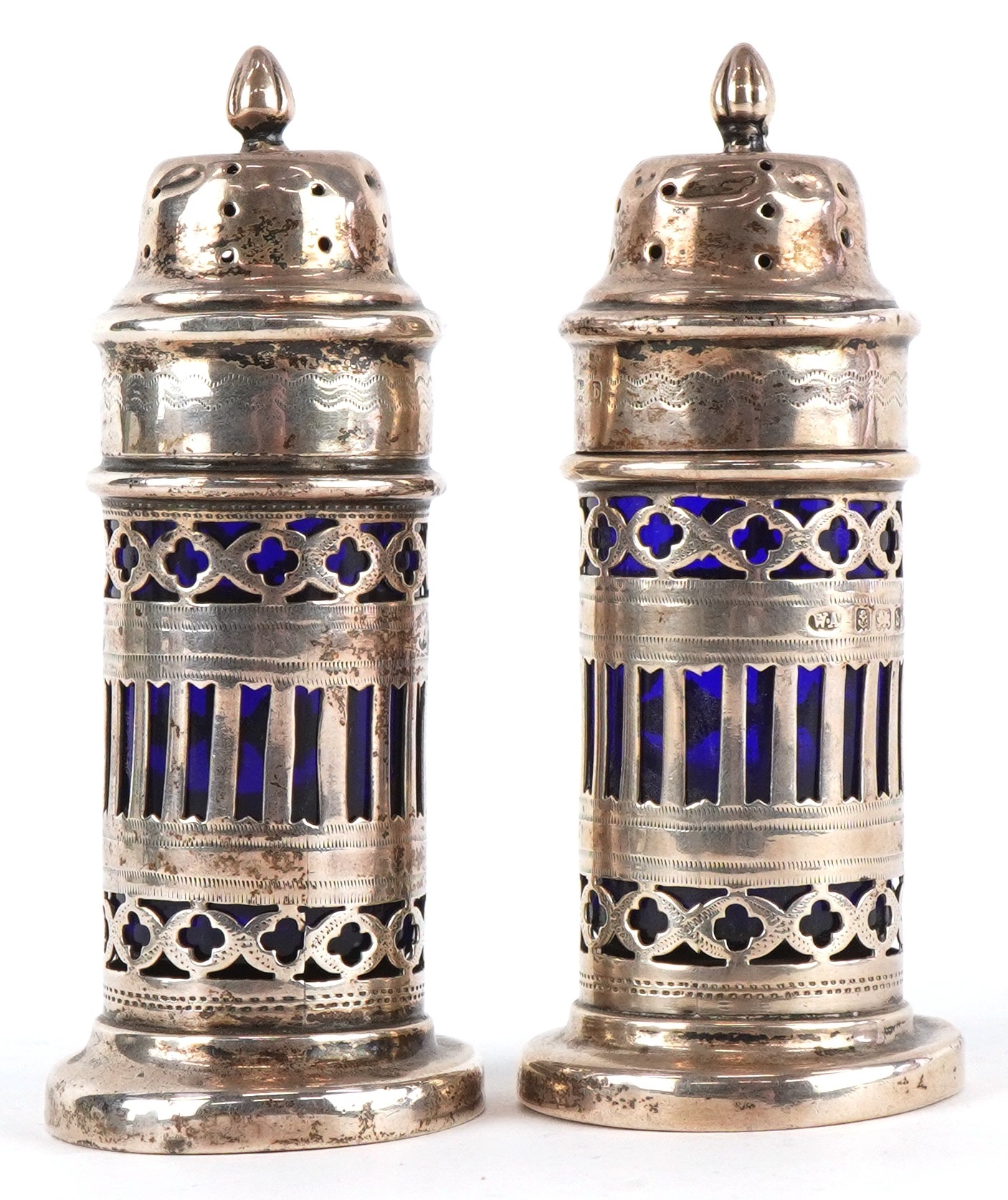 William Adams, a pair of Victorian silver casters having pierced friezes and blue glass liners, Birmingham 1901, 9cm high, total weighable silver 61.0g.
