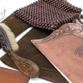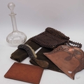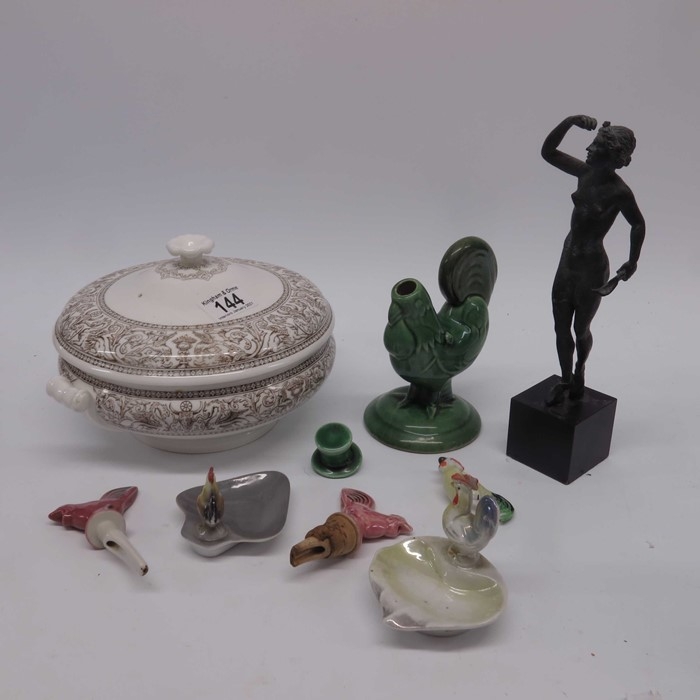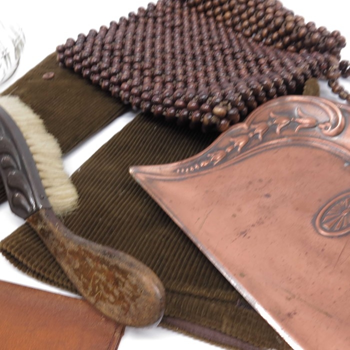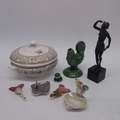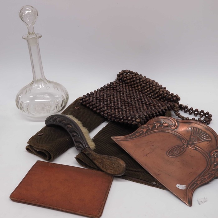 Hulstkamp Egg Snob gin decanter and stopper, three bird form pourers and two pink dishes; together with a glass onion shaped decanter, a tureen and cover, wooden bead work bag, copper crumb tray and brush, and other sundry items.