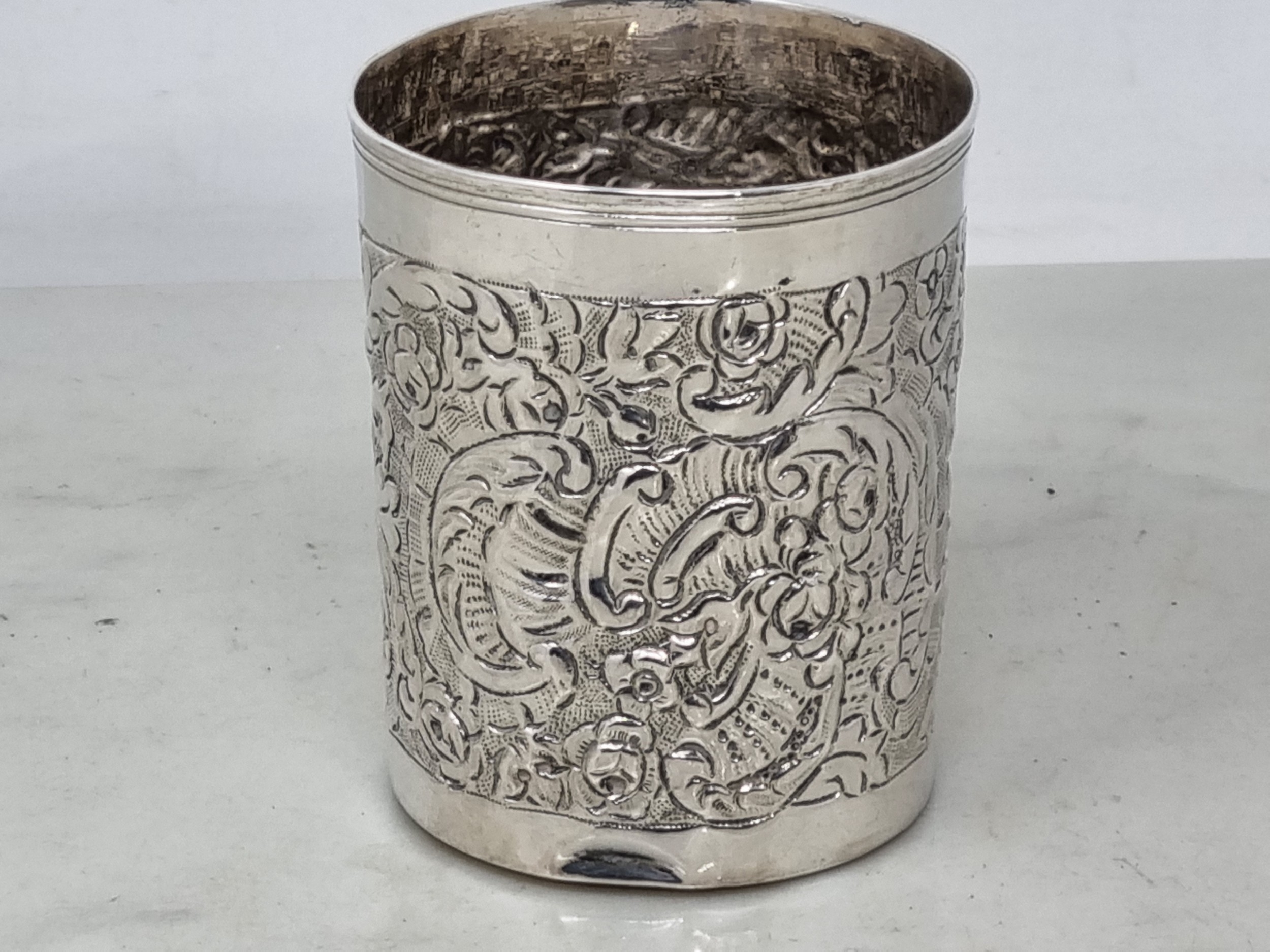 A Continental silver Beaker with floral and scroll embossing, 3in, 80gms